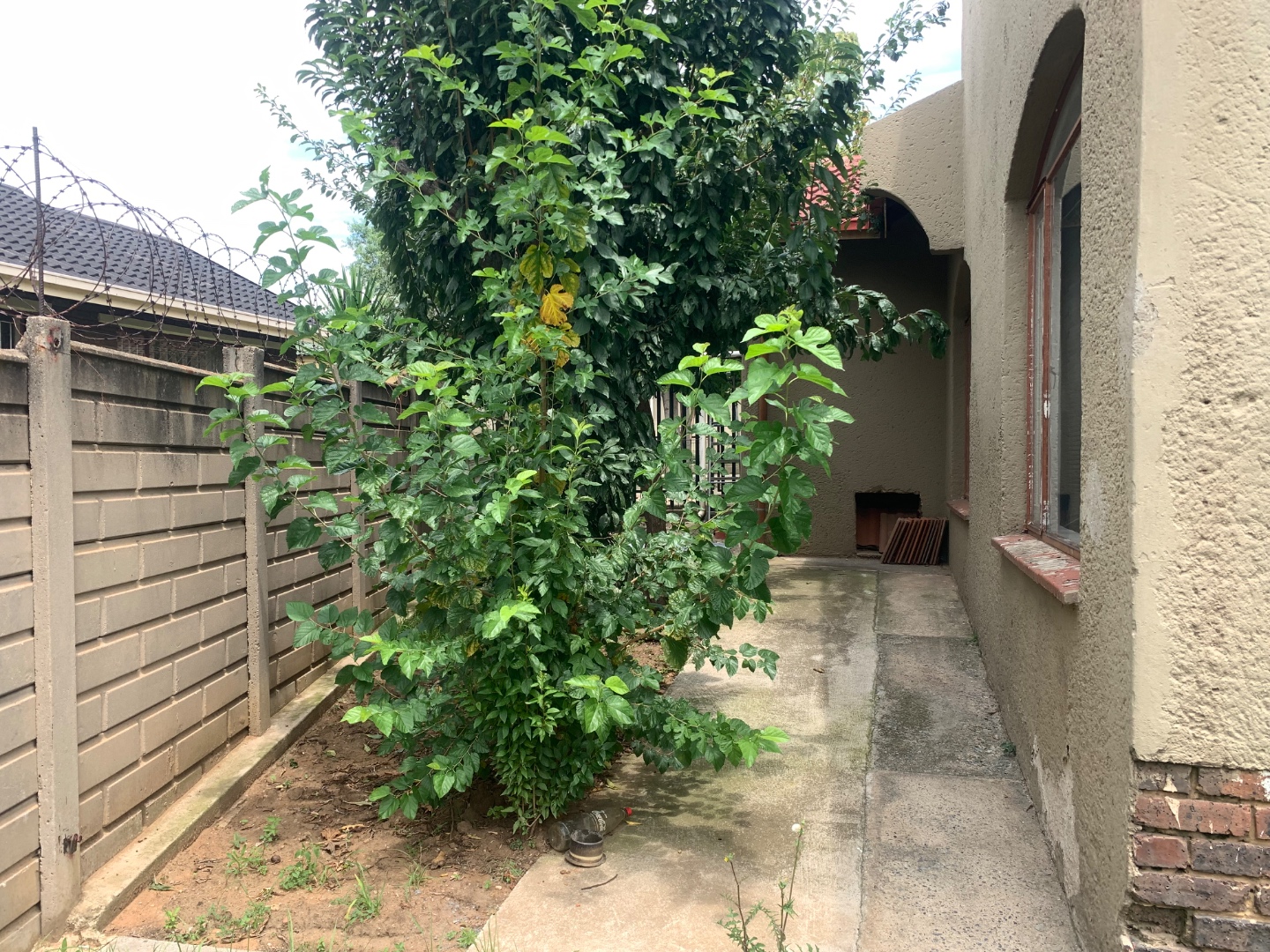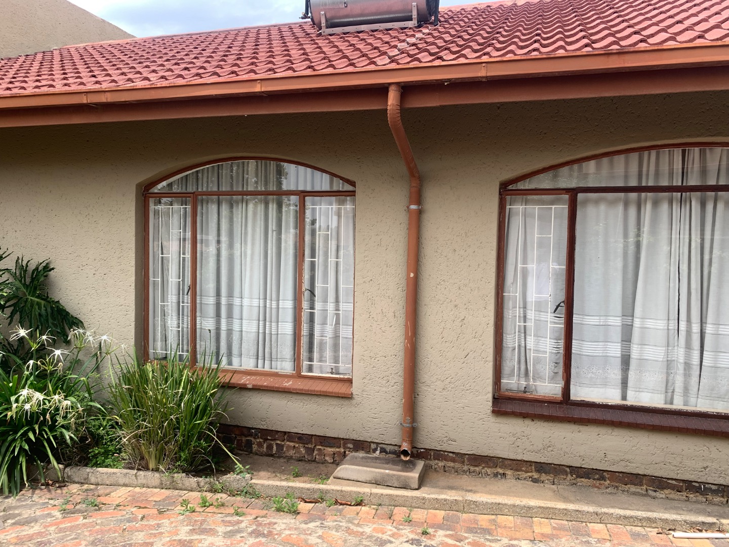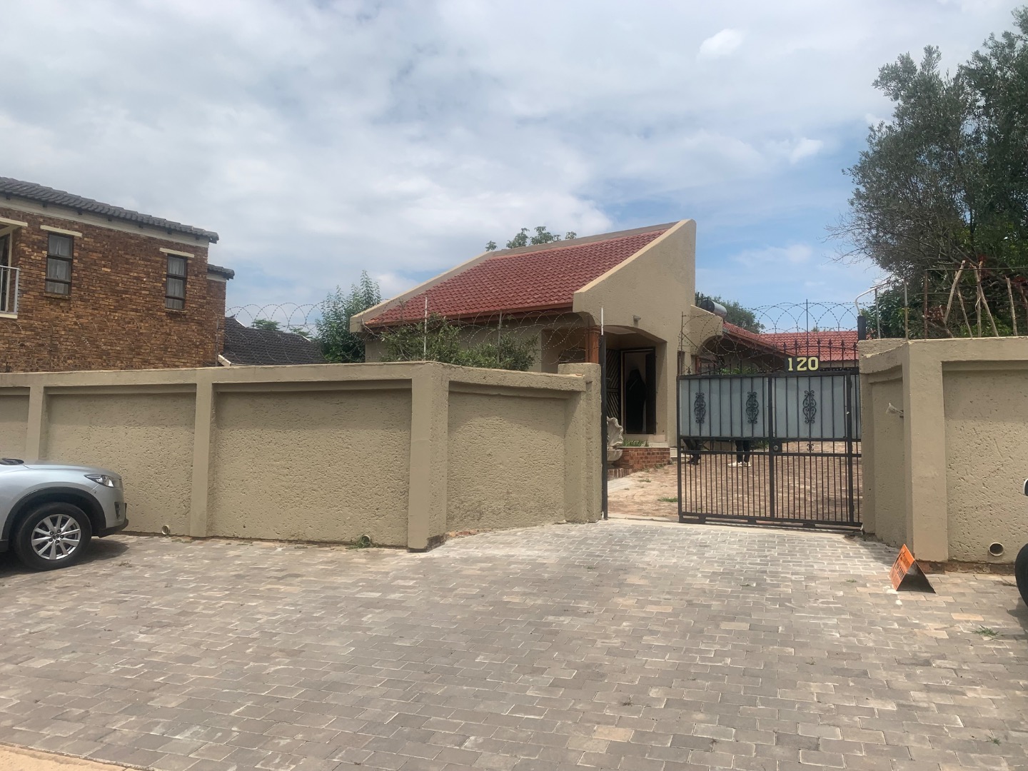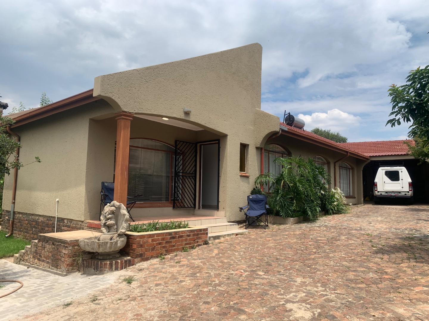 Discover this inviting single-story home located in the established suburb of Elandspark, Johannesburg. The property presents a welcoming facade with a light-colored, textured stucco exterior and a distinctive red-tiled roof. A covered front entrance, complete with a decorative column and security gate, enhances both aesthetics and safety. The extensive paved front yard and driveway offer ample parking, leading to a covered carport for two vehicles. Energy efficiency is a key feature, with a visible solar water heater installed on the roof, contributing to lower utility costs. Security is further bolstered by window bars on the arched windows and a secure perimeter wall with a gate. Step inside to find a well-appointed interior spanning 218.00 sqm, featuring three comfortable bedrooms and two bathrooms. The living spaces include a dedicated lounge and a dining room, providing ample area for relaxation and entertaining. A functional kitchen awaits your personal touch. Throughout the home, freshly painted white walls and durable light-colored tiled flooring create a bright and clean ambiance. Each room benefits from natural light through windows, complemented by ceiling fans with integrated lights and decorative crown molding, adding a touch of classic detail. Situated on a generous 616.00 sqm erf, the property offers practical outdoor living. The extensive paving ensures low maintenance, while a garden area provides potential for landscaping and outdoor enjoyment. This home is ideal for those seeking a blend of comfort, security, and convenience in a residential setting. Elandspark is a residential area within Johannesburg, South Africa, known for its community atmosphere and accessibility to local amenities. It offers a suburban lifestyle with convenient connections to the wider city. Key Features: * 3 Bedrooms, 2 Bathrooms * 1 Lounge, 1 Dining Room, 1 Kitchen * 2 Garages (covered carport) * 616 sqm Erf, 218 sqm Floor Size * Solar Water Heater * Paved Driveway & Garden * Security Gate & Window Bars * Tiled Flooring & White Walls