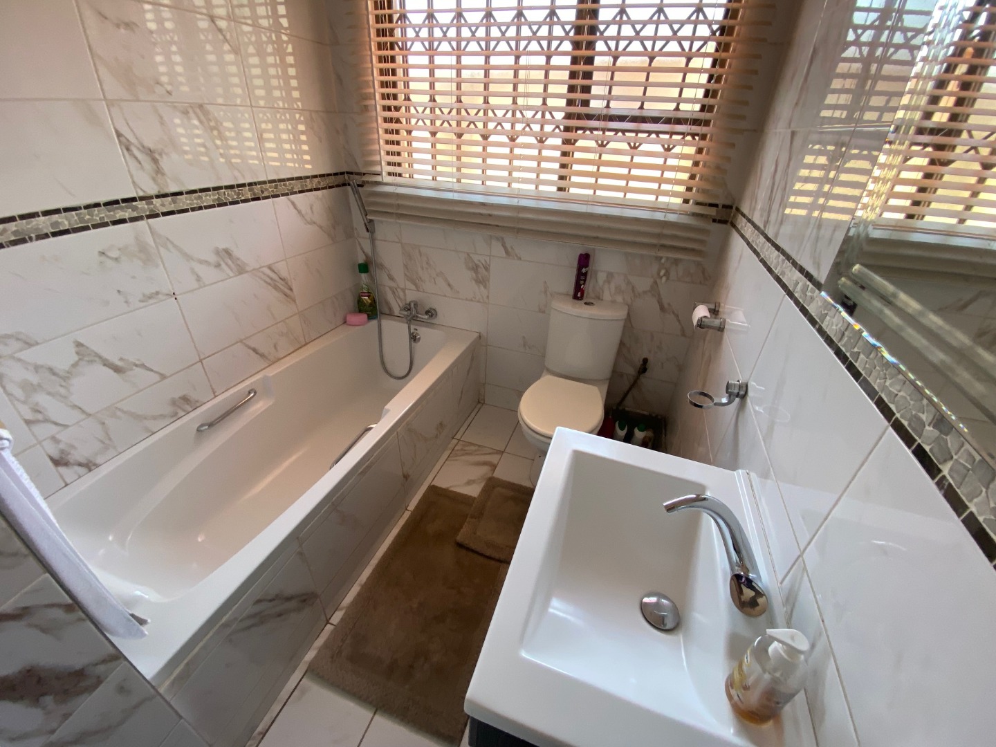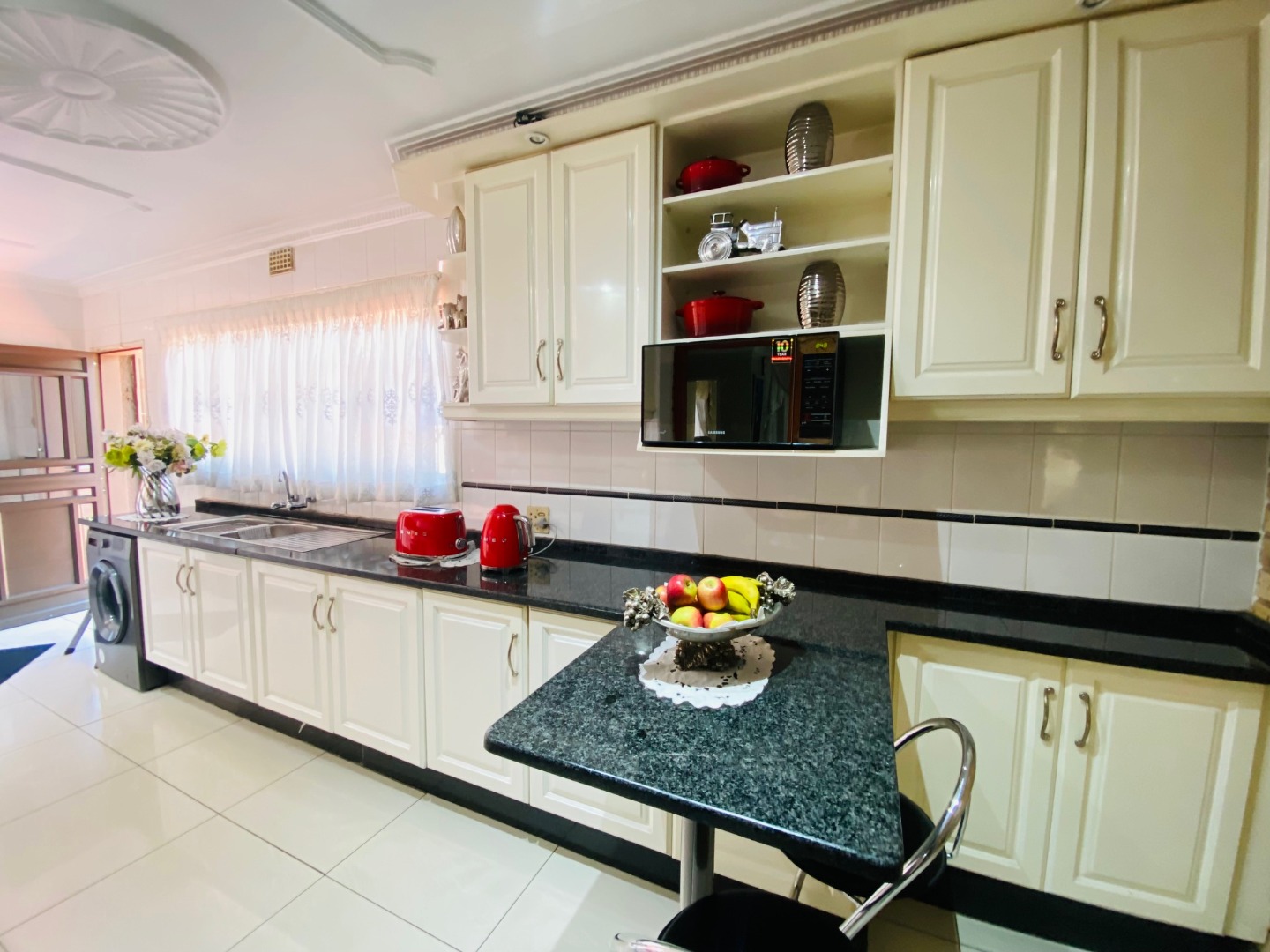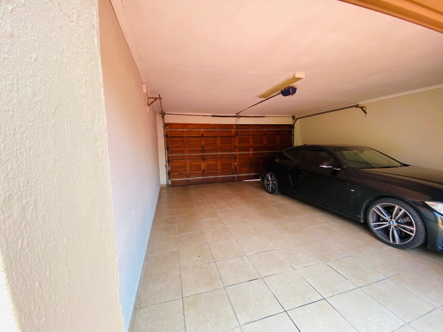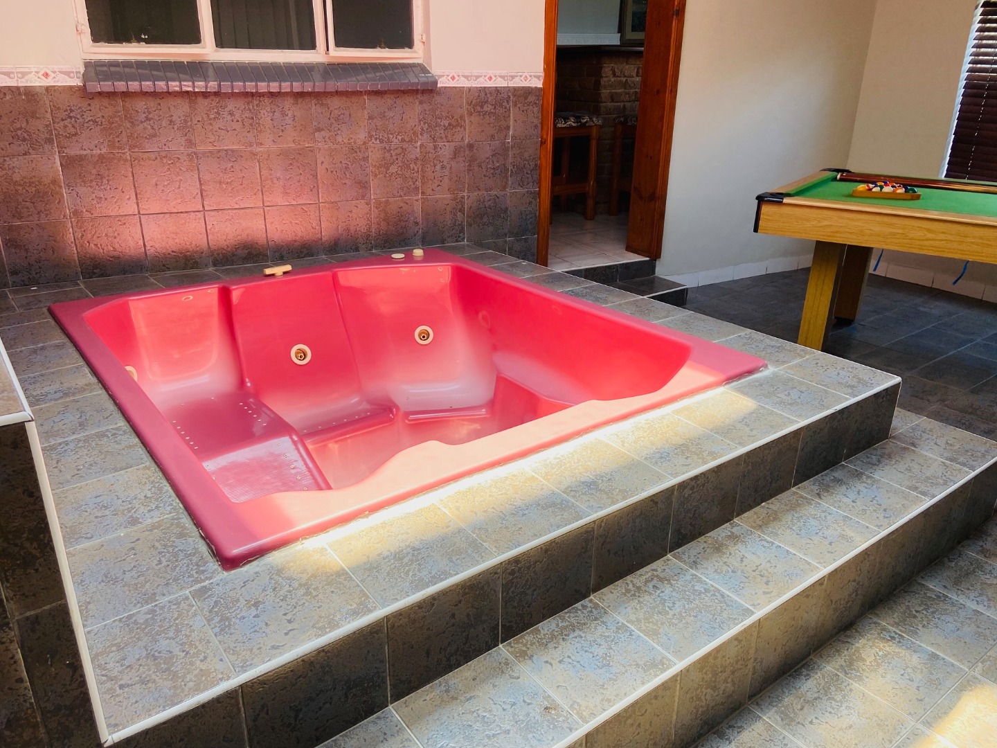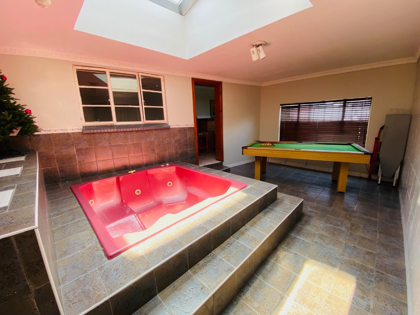 Outdoor living is a true delight with a large, private garden featuring mature trees and lush greenery, perfect for pets. Enjoy sunny days by the kidney-shaped swimming pool or entertain guests under the lapa, complete with a built-in bar. A jacuzzi adds a touch of luxury, while paving ensures easy maintenance. Security is enhanced by a perimeter fence and burglar bars, providing peace of mind.