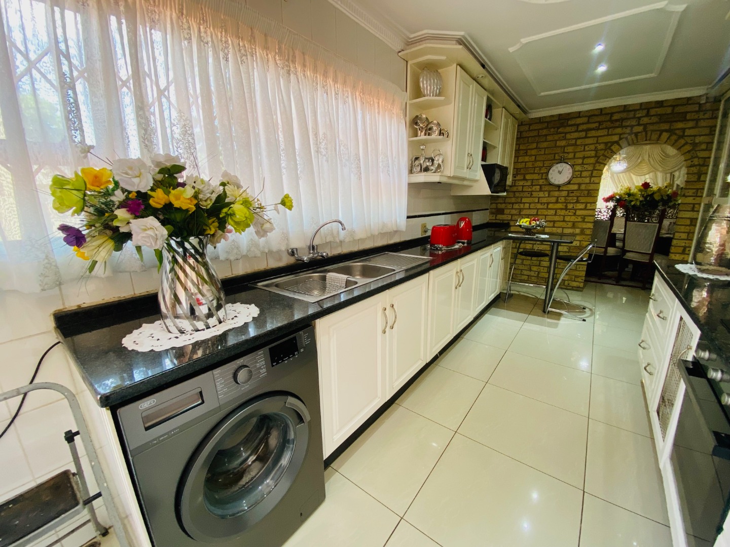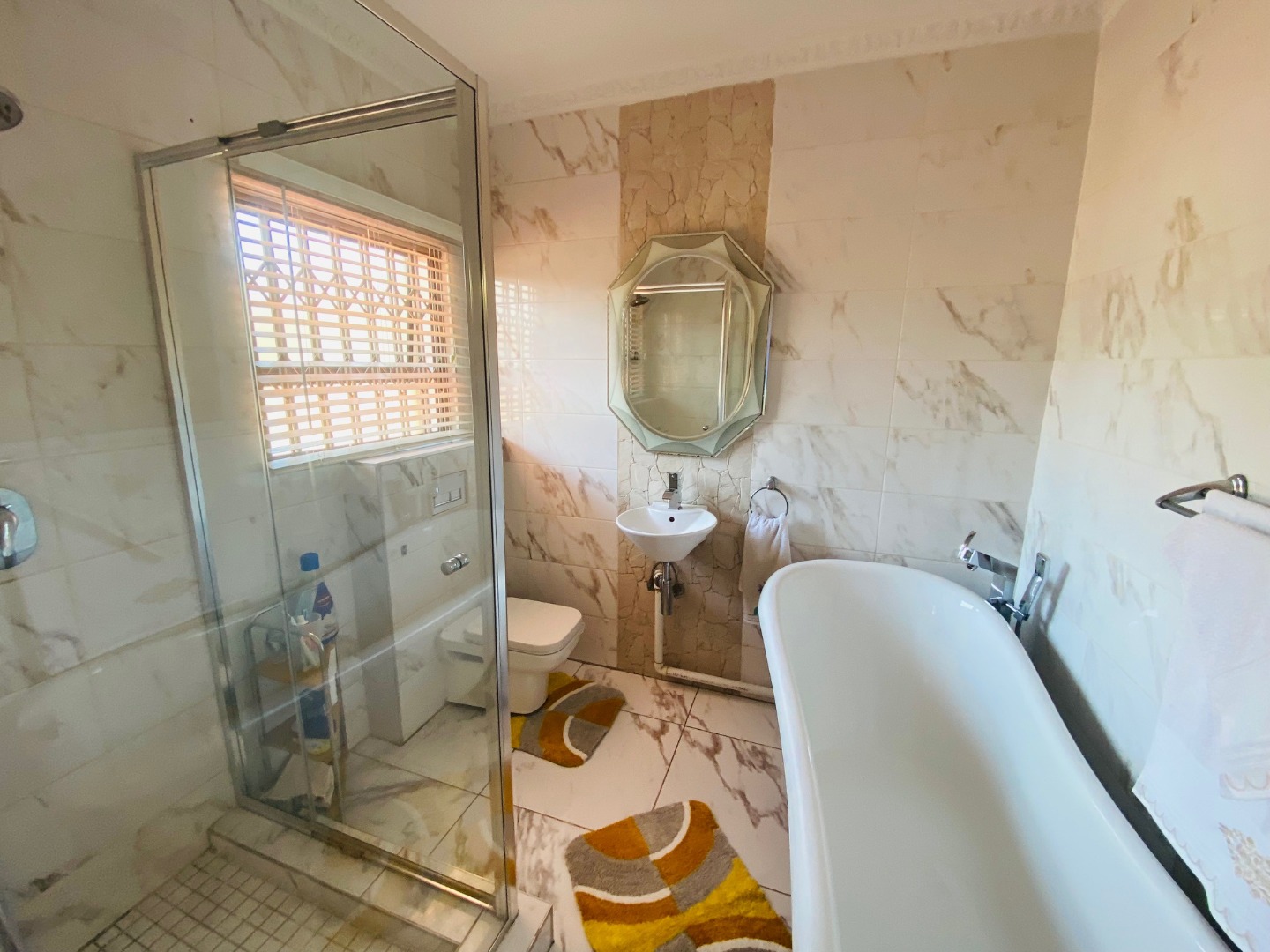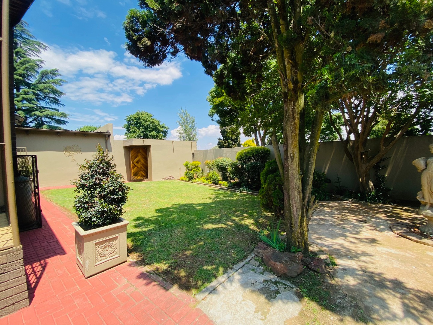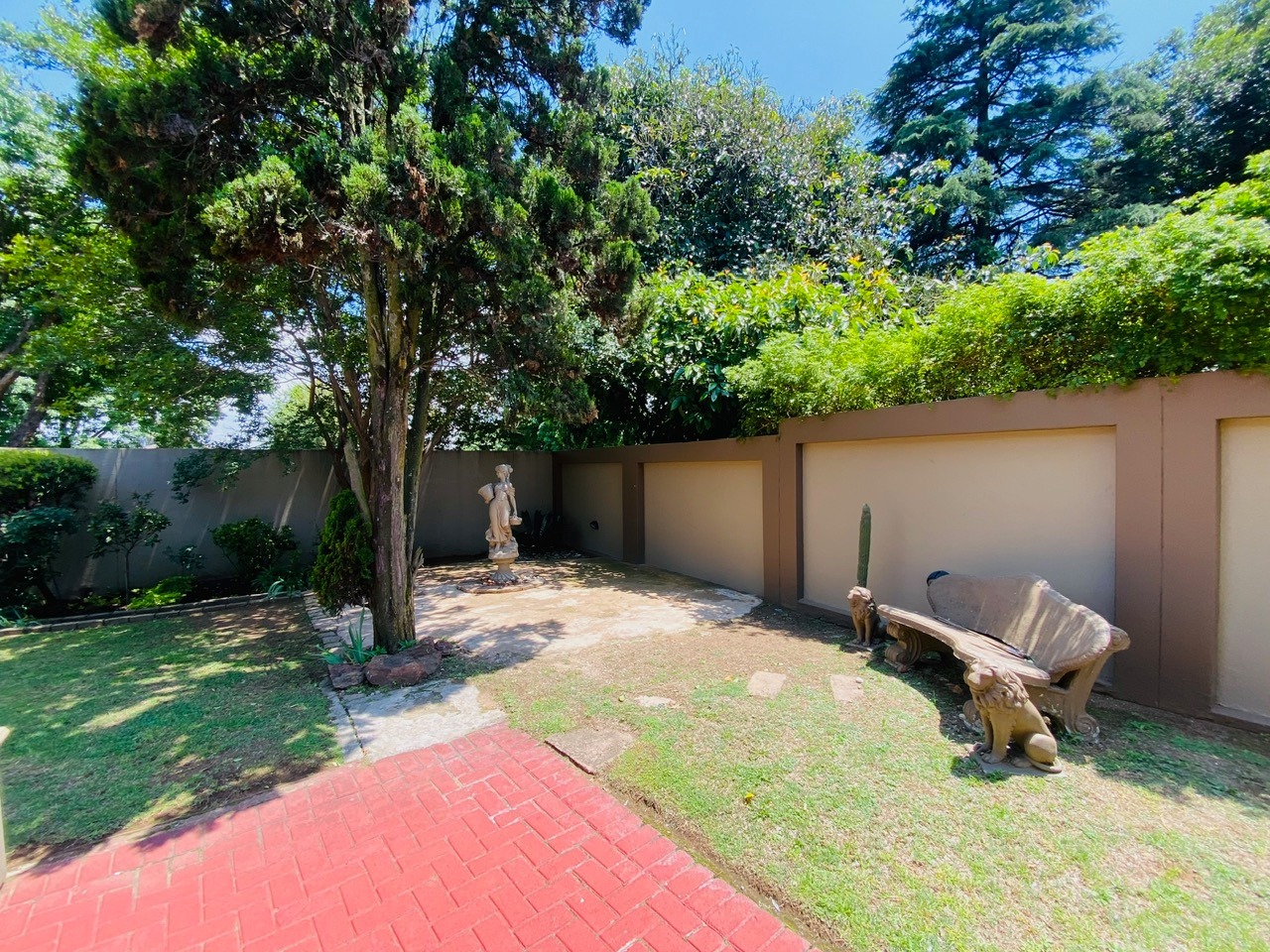 Outdoor living is a true delight with a large, private garden featuring mature trees and lush greenery, perfect for pets. Enjoy sunny days by the kidney-shaped swimming pool or entertain guests under the lapa, complete with a built-in bar. A jacuzzi adds a touch of luxury, while paving ensures easy maintenance. Security is enhanced by a perimeter fence and burglar bars, providing peace of mind.