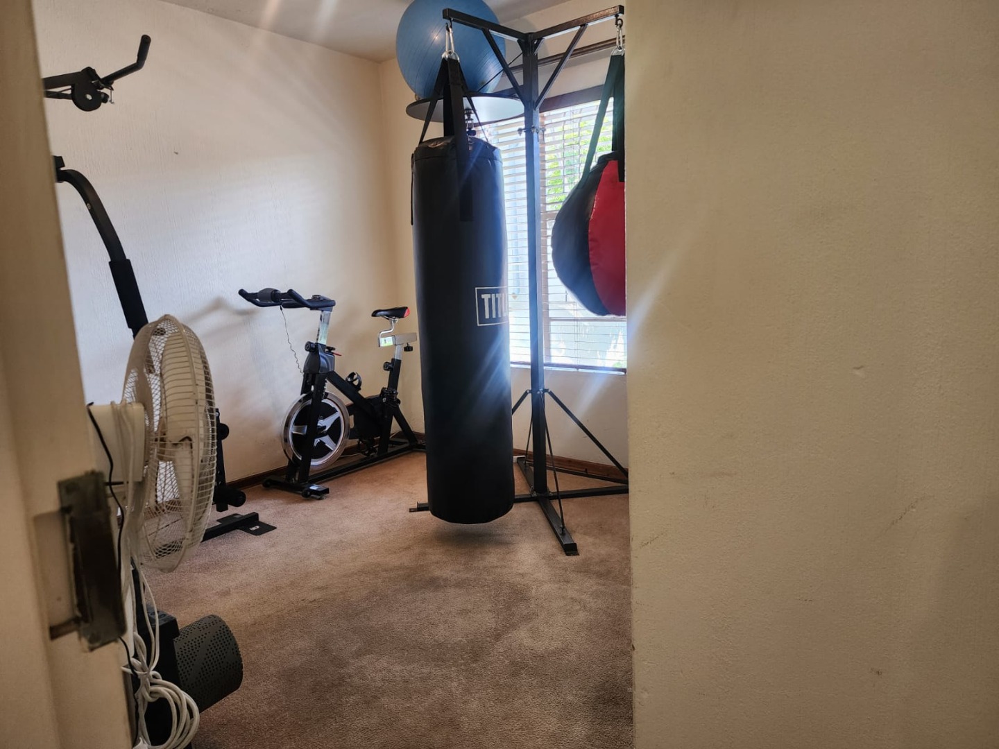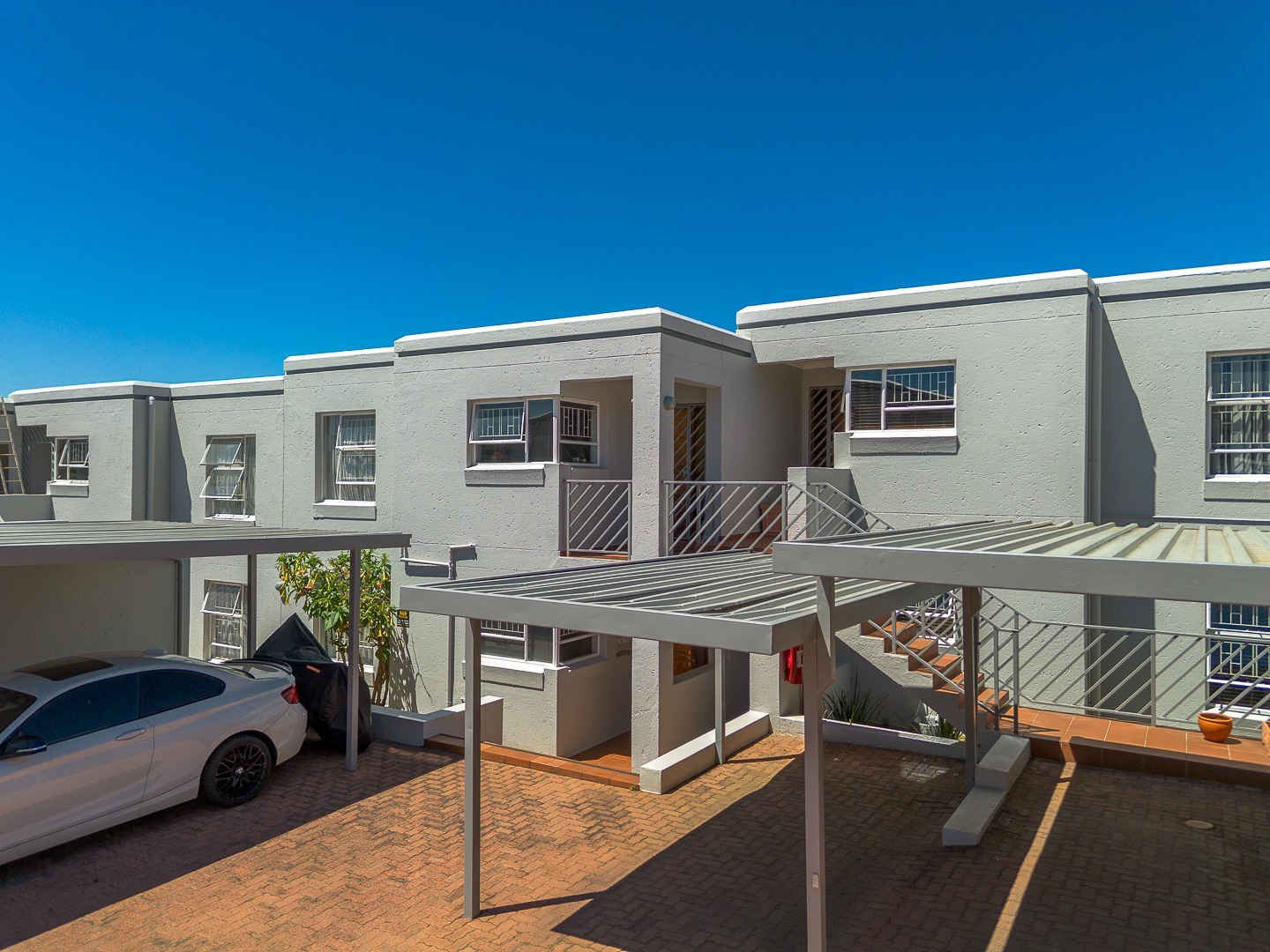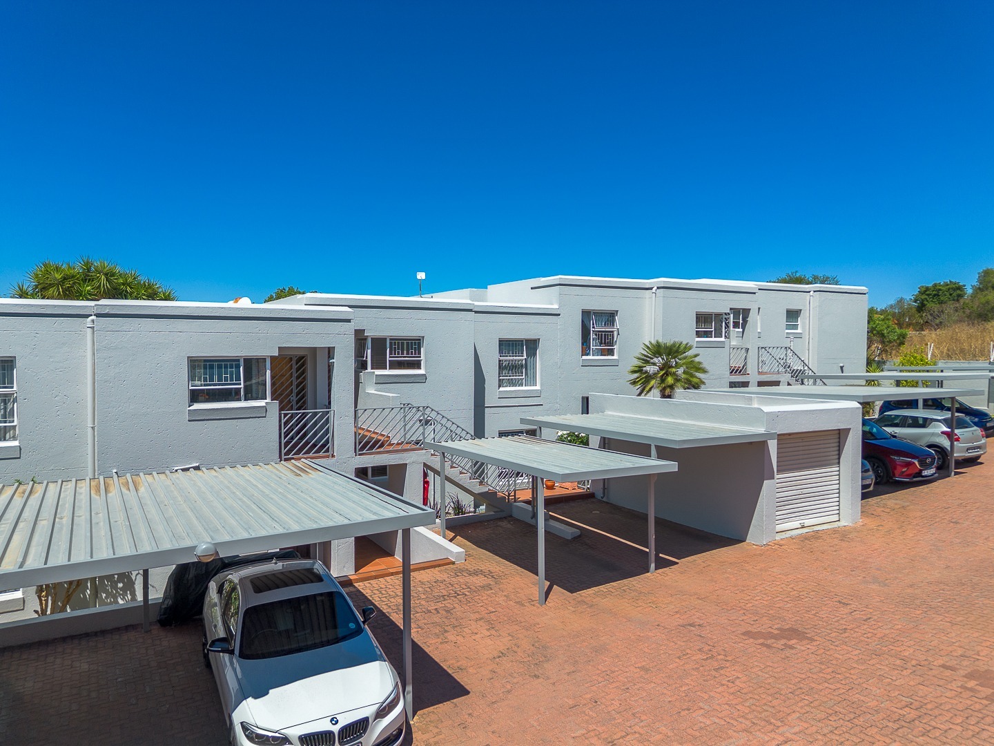 Parking is well catered for with two spacious covered parking bays, each large enough to accommodate a vehicle and a motorcycle, set within a neat complex featuring a modern light-grey exterior and paved driveways.