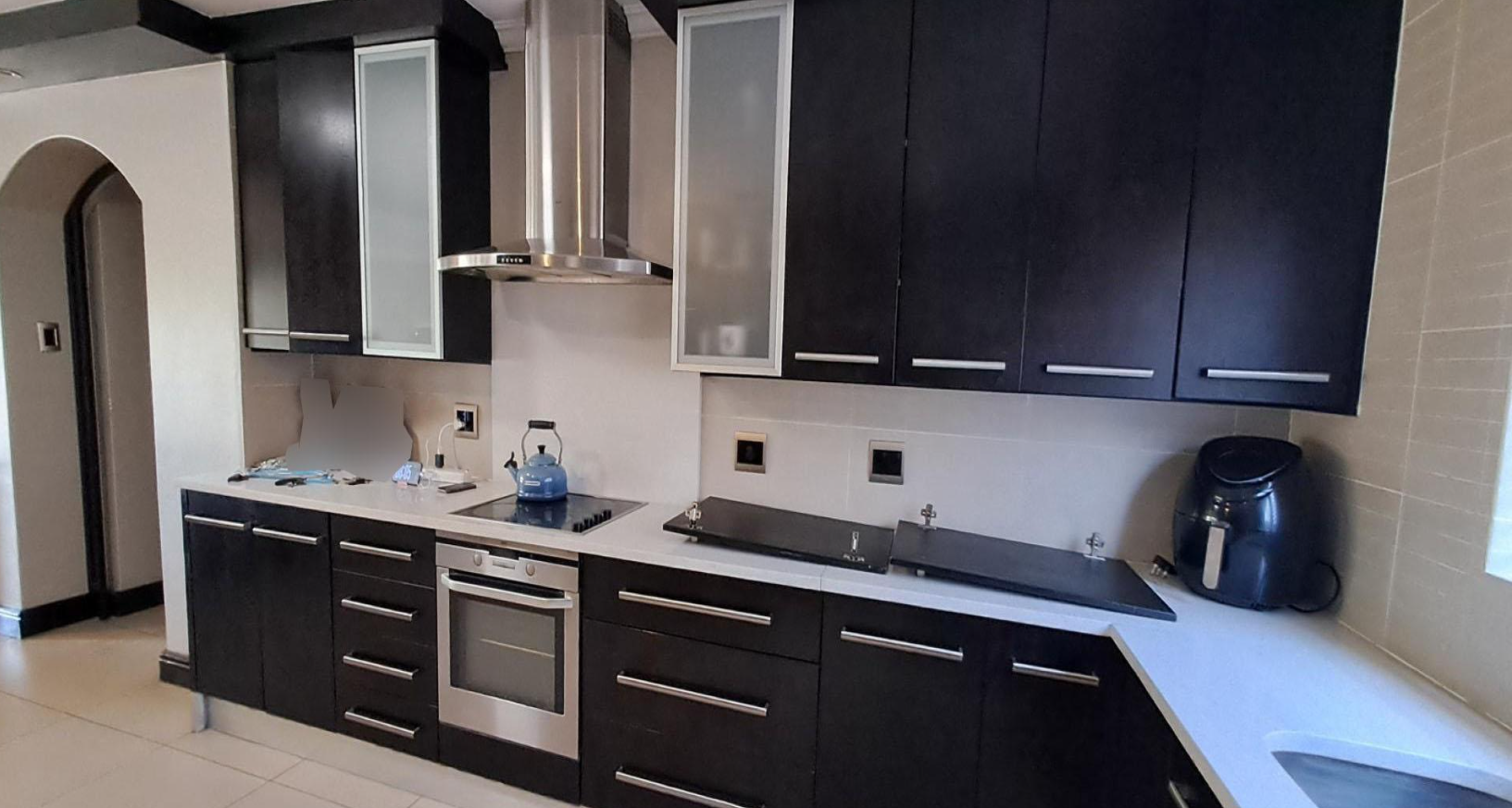 This inviting 3-bedroom, 2-bathroom family home in Glenvista, Johannesburg, offers a blend of modern living and outdoor enjoyment. The property boasts a contemporary exterior and an open-plan interior, seamlessly connecting the living, dining, and kitchen areas. The modern kitchen is a highlight, featuring dark cabinetry, light countertops, stainless steel appliances, and an integrated BBQ area, perfect for entertaining. Large glass sliding doors flood the spacious living room with natural light and provide direct access to the outdoors. A dedicated study offers a quiet workspace, while bedrooms are equipped with practical built-in storage and a convenient pantry is also available.