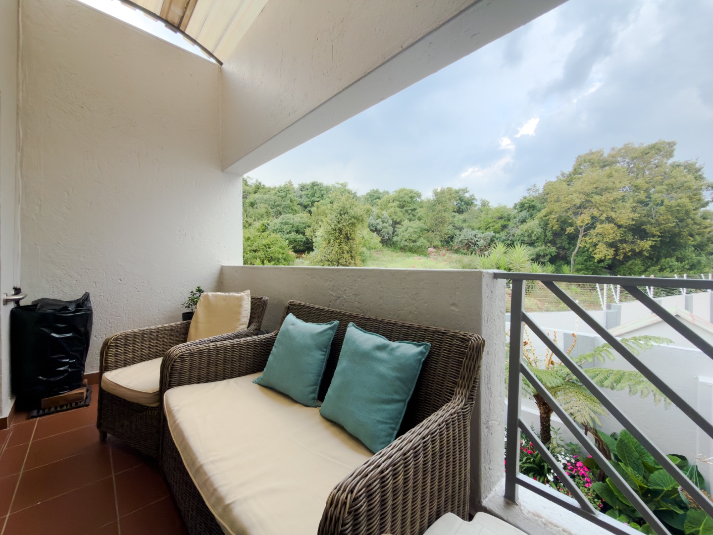 Sliding doors from the living area open onto a covered balcony, extending the living space and creating a tranquil setting for morning coffee or relaxed evenings.