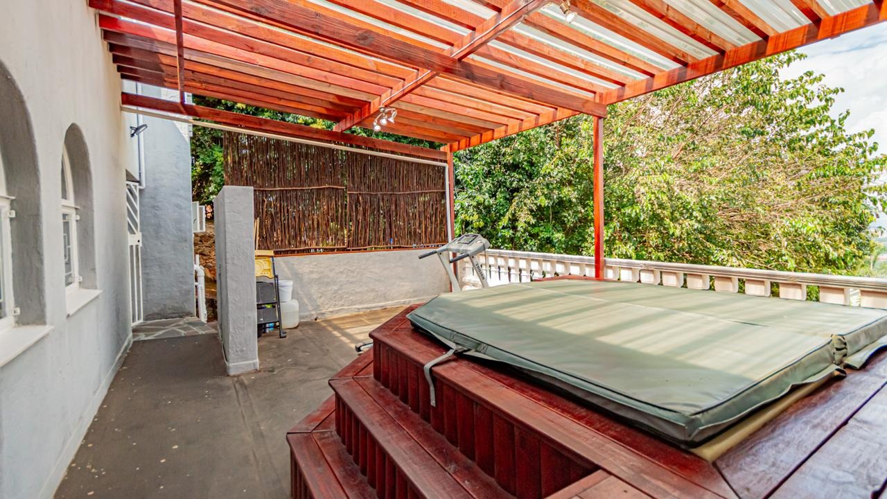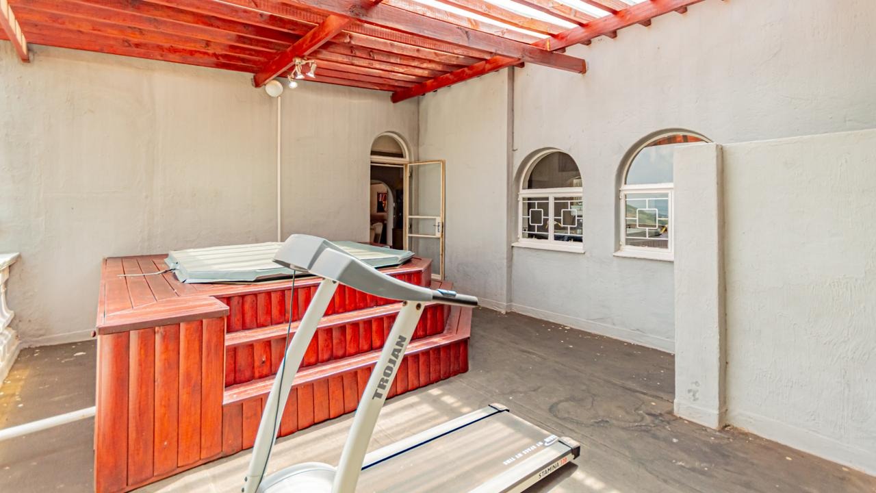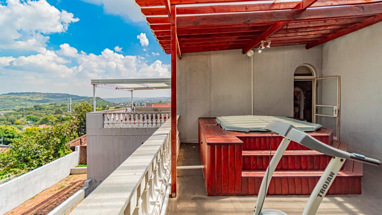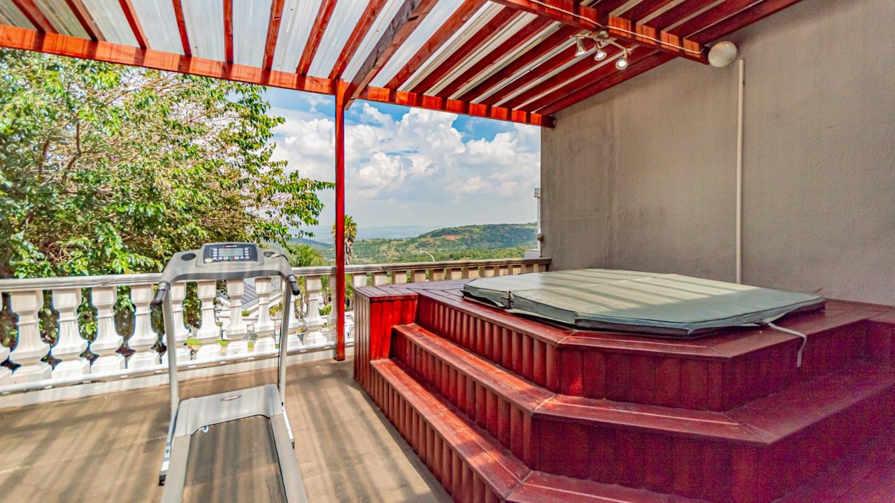Leading up the staircase, you’re greeted by a spacious open-plan lounge with underfloor heating, flowing seamlessly into the dining area. A separate TV room with a built-in bar opens onto a balcony with stunning panoramic views over Johannesburg South—perfect for entertaining.