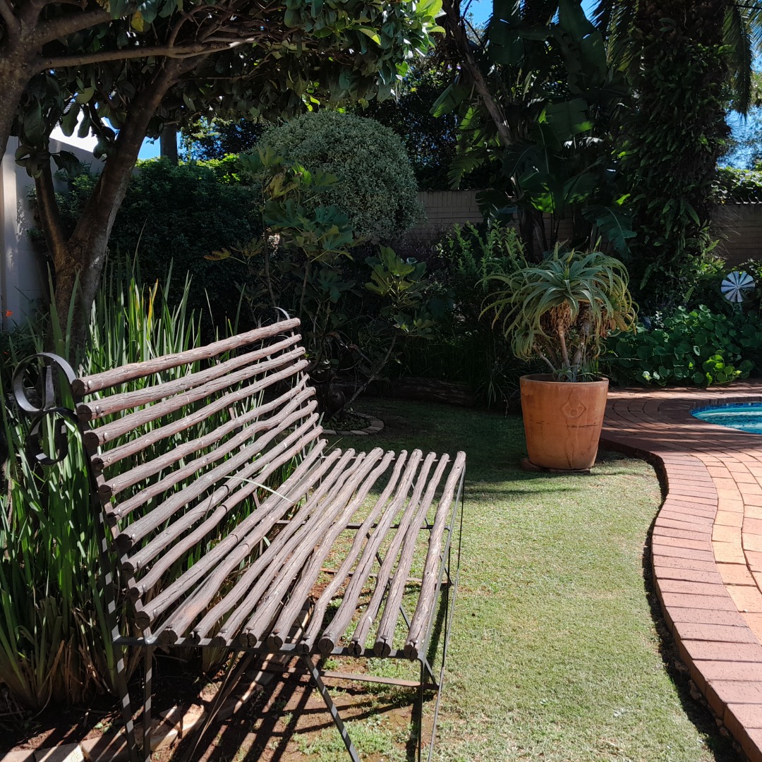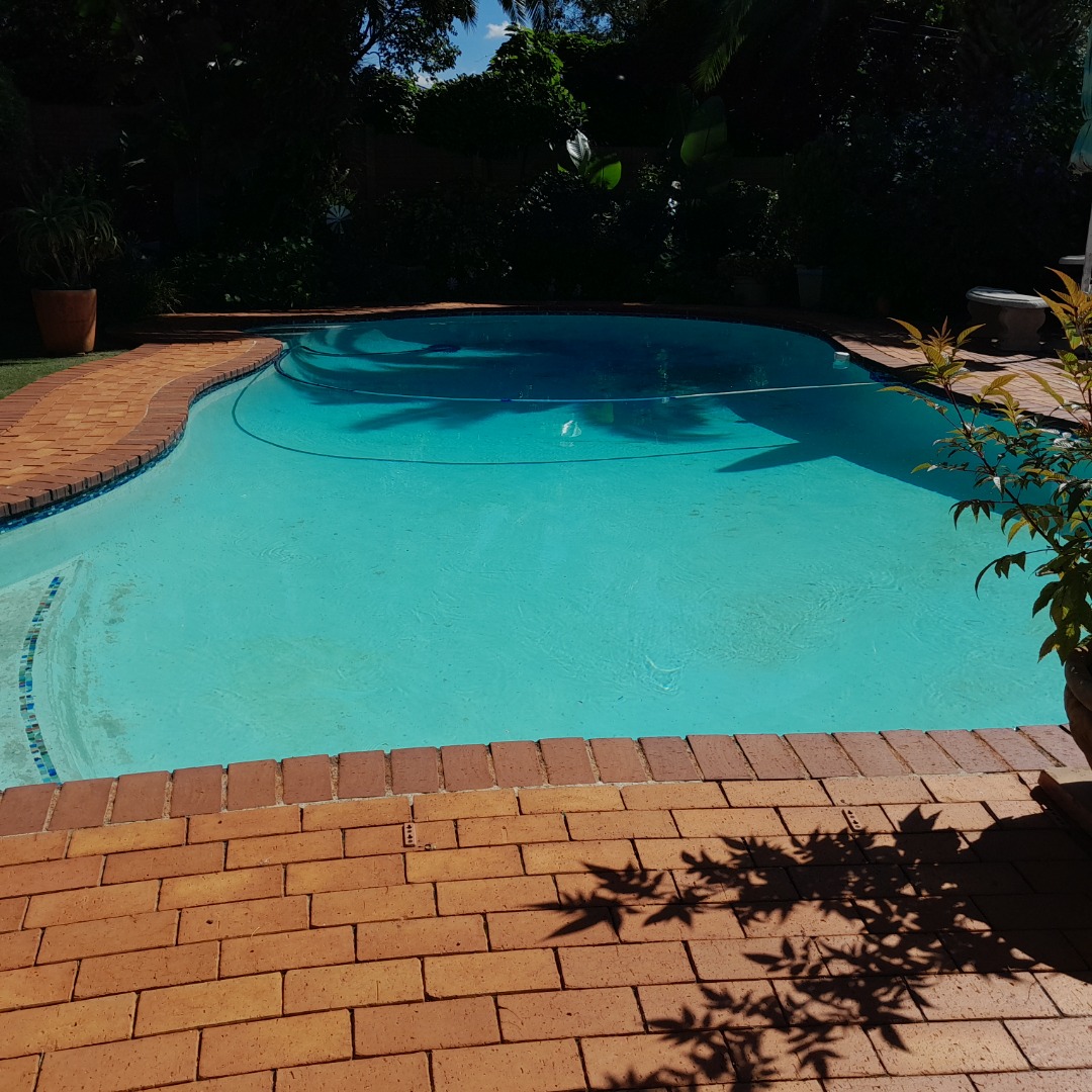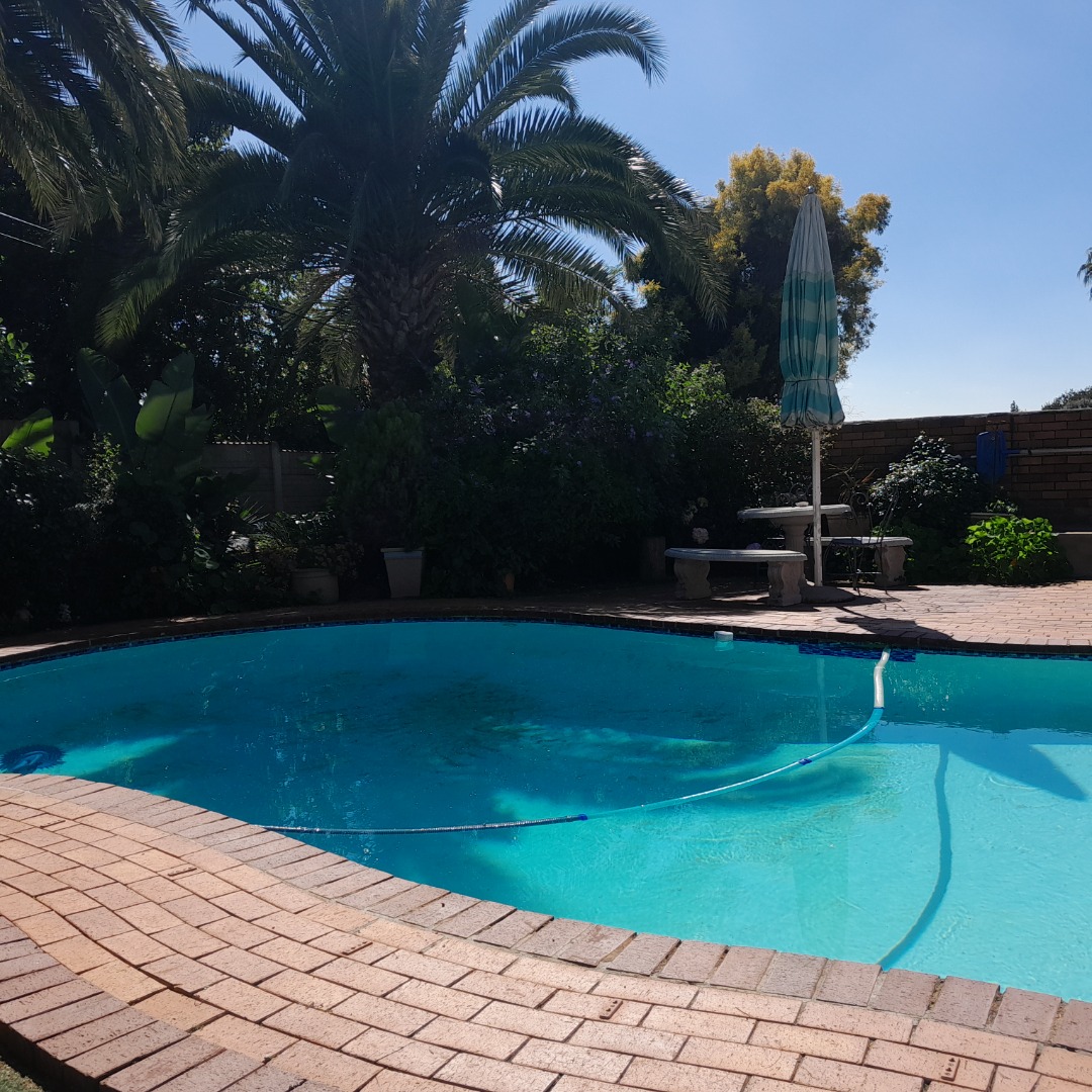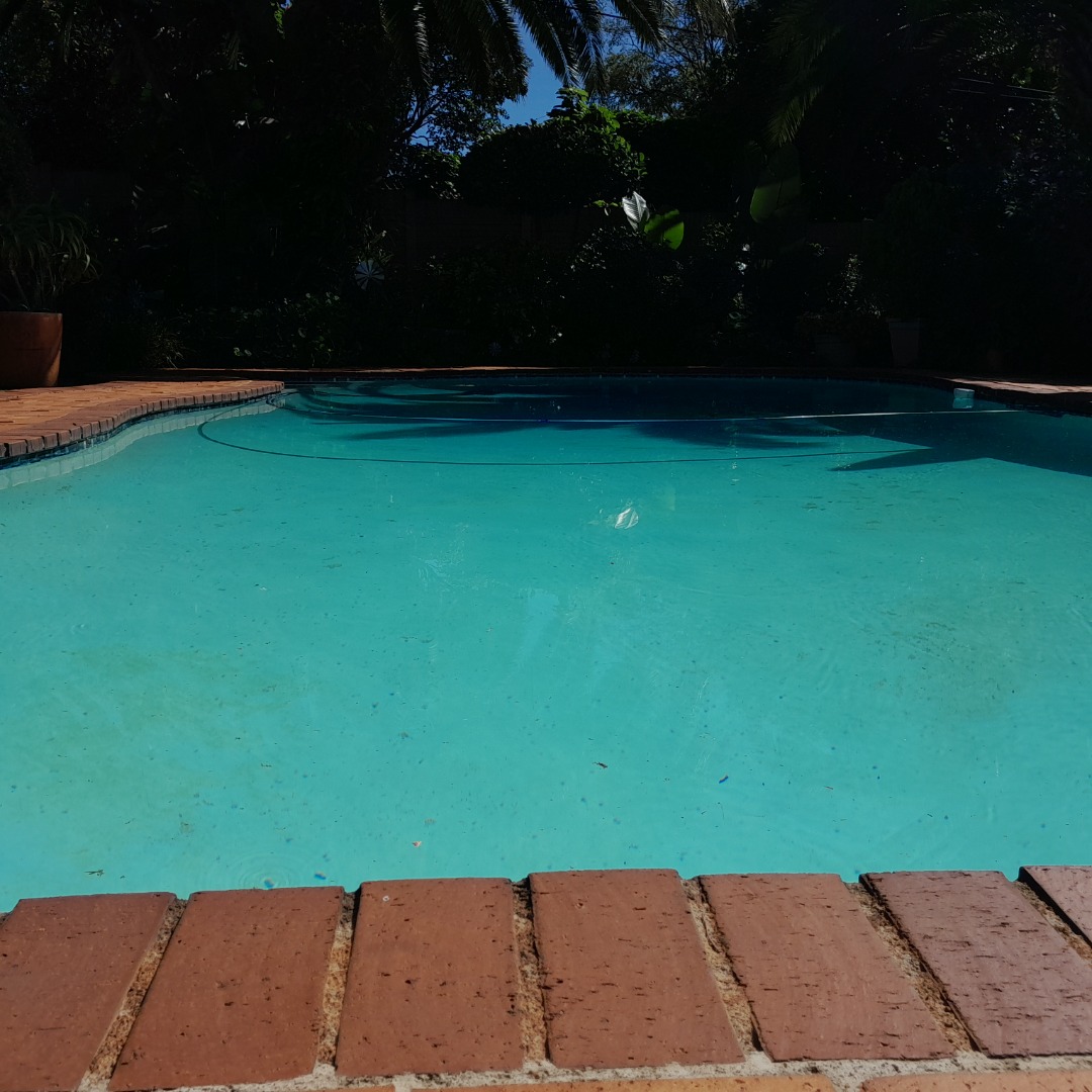 Beautifull manicured garden with large swimming pool.
