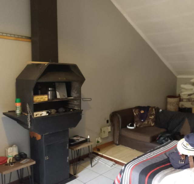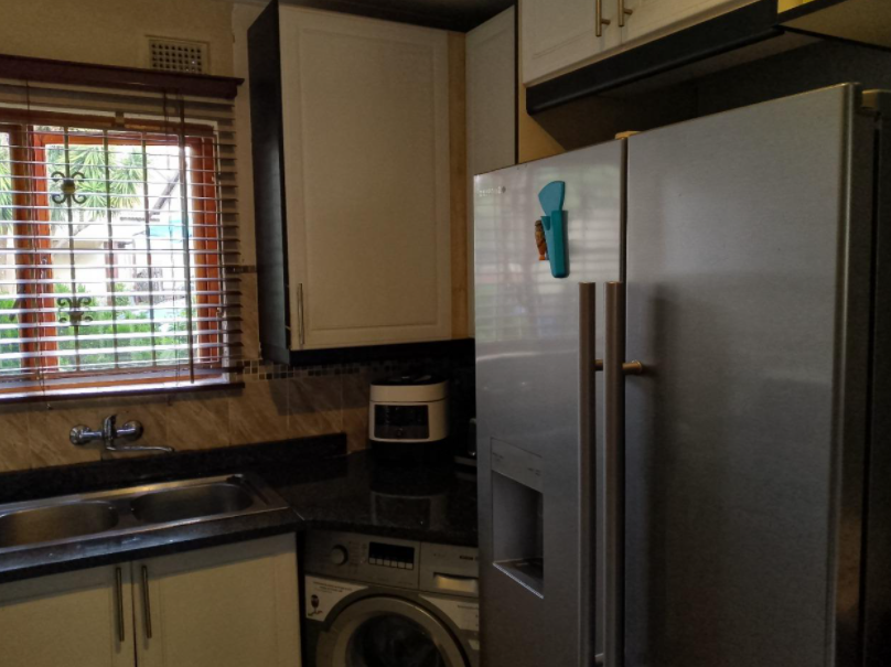 The heart of the home features a well-equipped kitchen, boasting modern white and glass-front cabinets, dark countertops, and a tiled backsplash. It comes complete with built-in appliances, including an oven, stovetop, and dishwasher, alongside a double sink. Natural light fills the space, which also accommodates a large stainless steel fridge with a water dispenser and an integrated washing machine. Adjacent to the kitchen, the lounge and dining areas are bright and airy, featuring tiled flooring and a large sliding glass door that opens to an outdoor space, perfect for relaxation or entertaining. A unique indoor braai/fireplace adds a distinctive touch, offering versatile entertainment options.