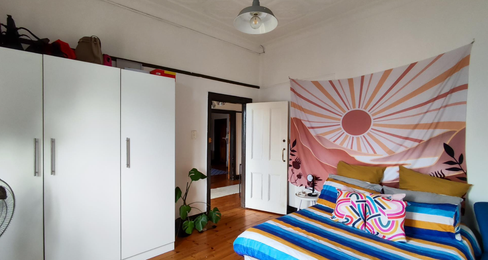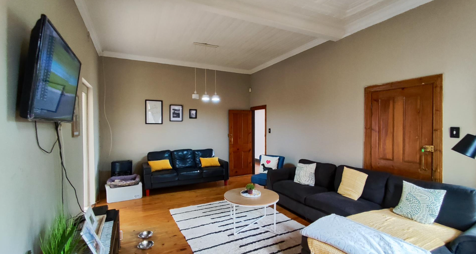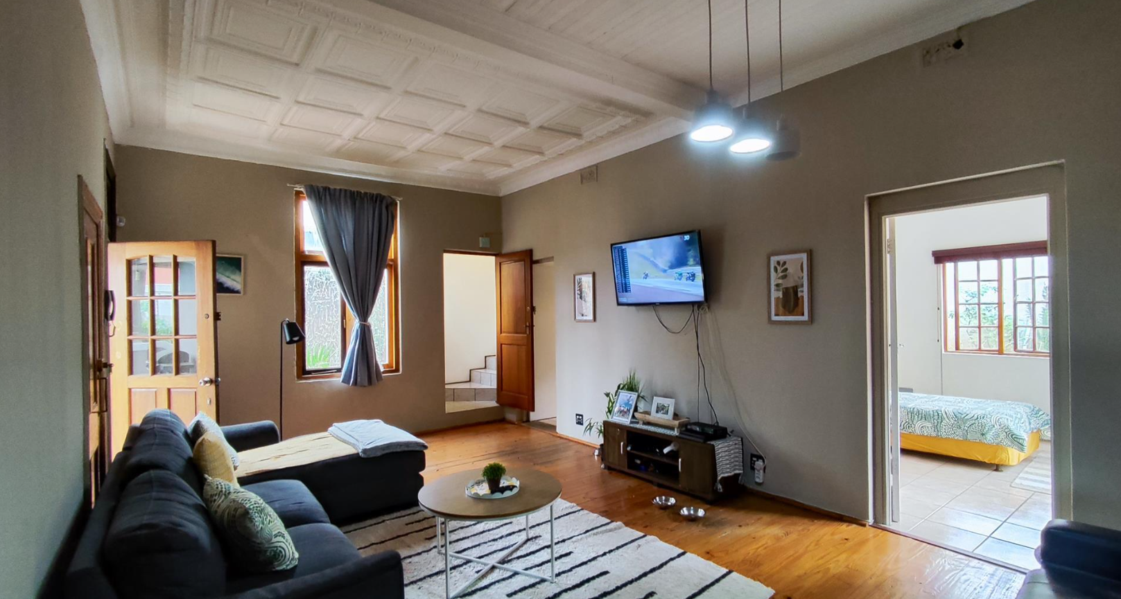 The living areas feature warm hardwood floors, distinctive high ceilings with coffered or plank detailing, and charming stained glass windows, creating an inviting atmosphere. The property comprises four comfortable bedrooms and two well-appointed bathrooms, providing ample accommodation for a family. An additional study offers a dedicated space for work or quiet reflection. The layout includes a versatile flatlet, enhancing the property's appeal and potential uses.