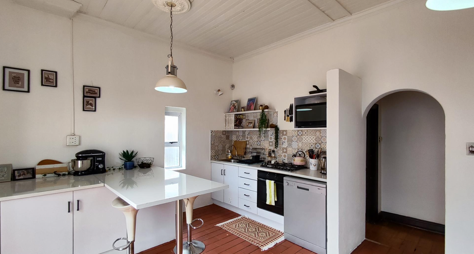 Step inside to discover a home rich in character, boasting 215 sqm of floor space. The modern kitchen is a highlight, equipped with white cabinetry, integrated appliances including an oven/hob and dishwasher, and a stylish patterned backsplash. A functional breakfast bar and terracotta-toned flooring complete this bright space, which benefits from high ceilings and an arched doorway, offering seamless access to an outdoor paved area.