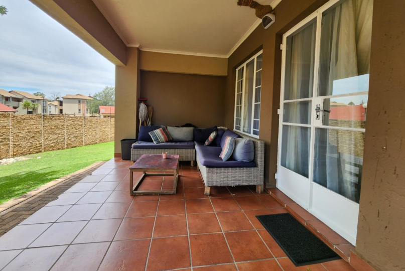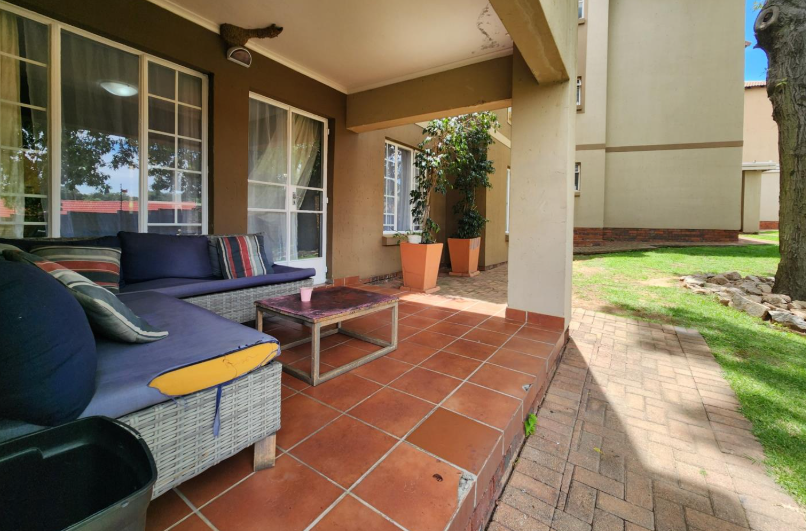 The living area opens onto a generously sized patio — ideal for outdoor dining, entertaining guests, or simply unwinding in your own private space.