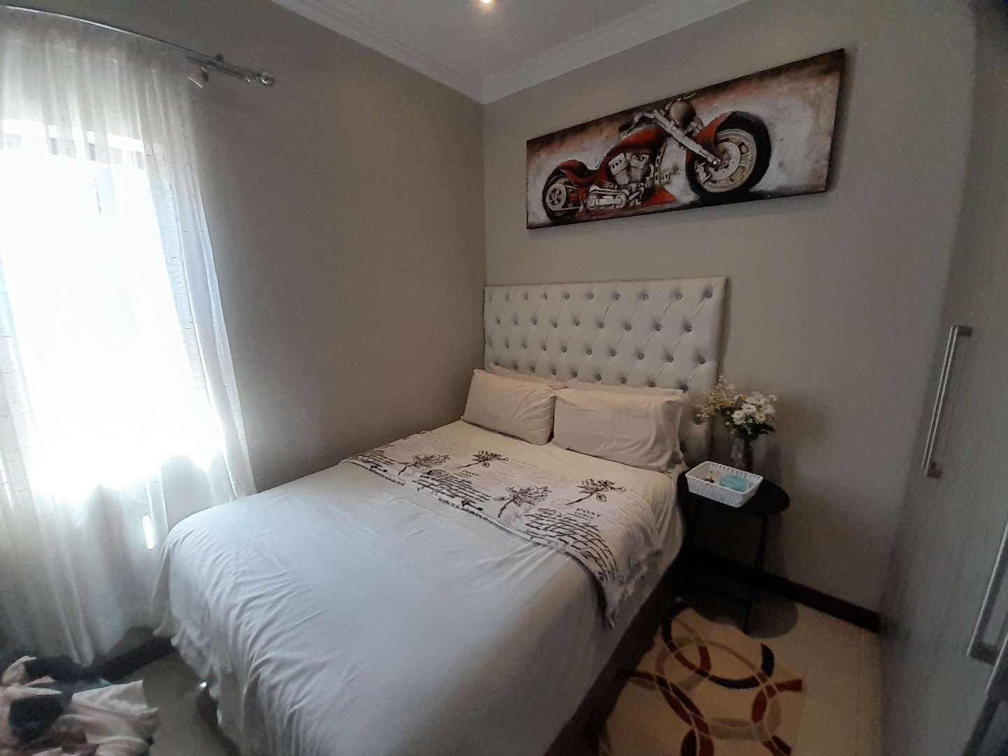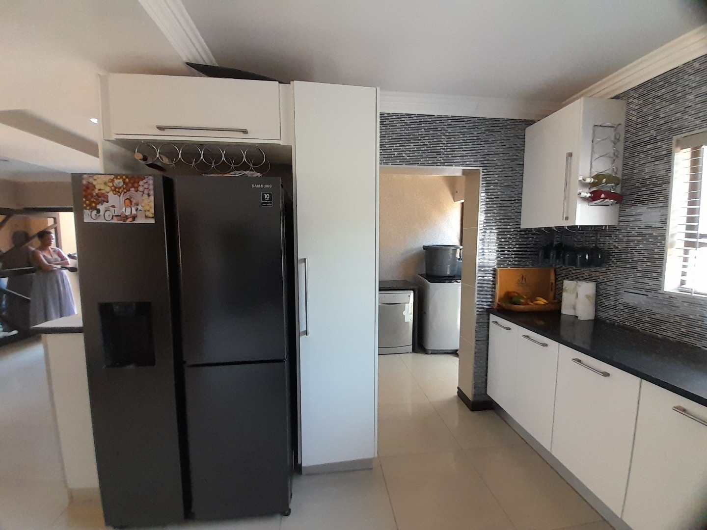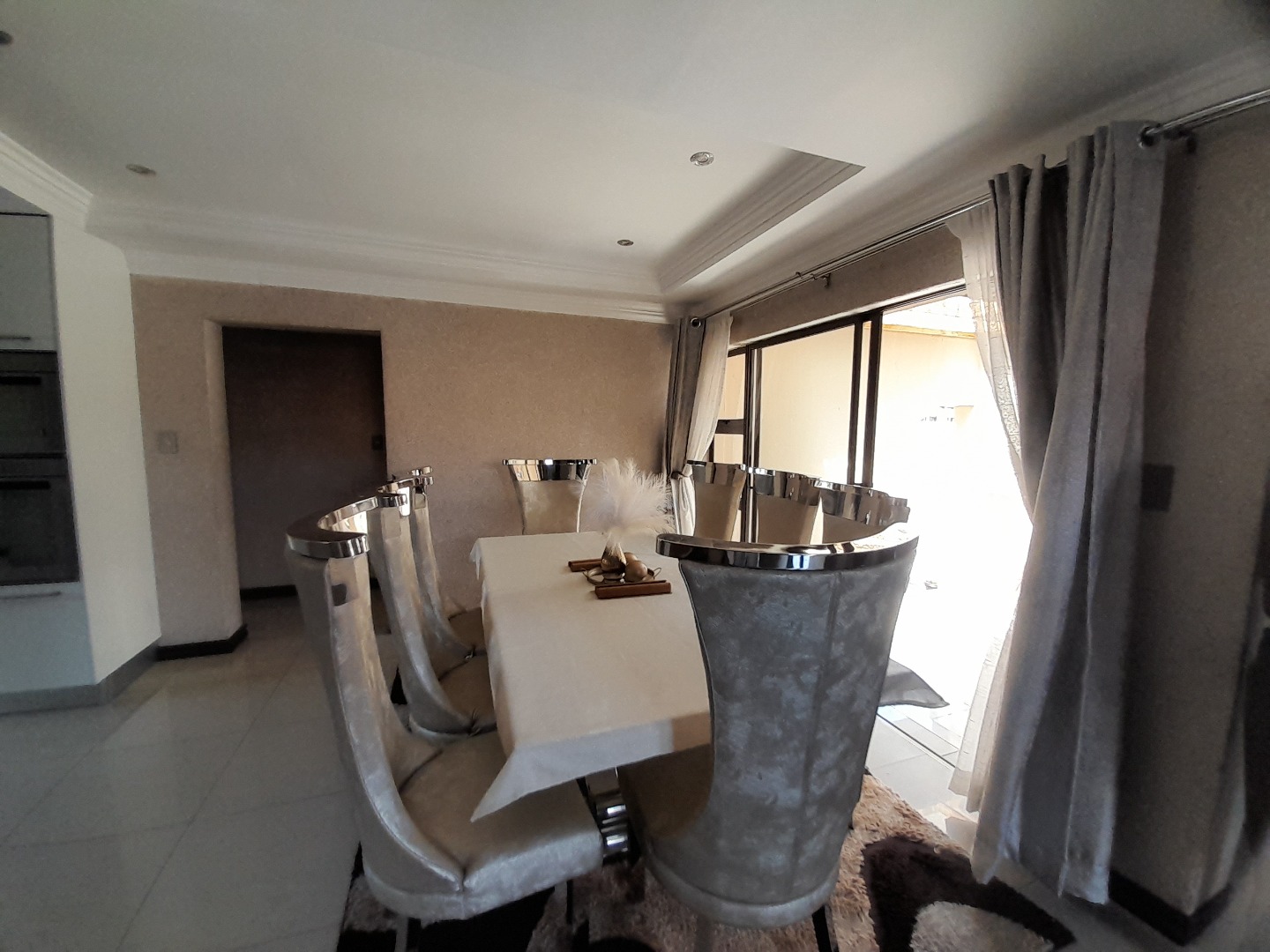 Discover this modern and inviting four-bedroom, three-bathroom residence situated in the suburban heart of Meredale, Johannesburg. Boasting a contemporary two-story design, the property immediately impresses with its well-maintained exterior, high perimeter walls ensuring privacy, and a convenient paved driveway leading to a double garage. The home's kerb appeal is enhanced by its neutral tones and dark-framed windows, with a charming balcony adding to its architectural character. Step inside to a thoughtfully designed interior, where spacious living areas flow seamlessly. The lounge is a highlight, featuring ample natural light, elegant recessed lighting, and a stylish chandelier, creating an ideal space for relaxation and entertaining. Adjacent to this, the modern dining room, complete with sleek furniture and sophisticated ceiling details, opens directly to the outdoor area via large sliding glass doors, promoting an effortless indoor-outdoor lifestyle. The sleek, modern kitchen is a culinary delight, equipped with white glossy cabinetry, dark granite countertops, and a textured grey backsplash. It includes built-in double ovens, an extractor hood, and a large black refrigerator, alongside integrated wine storage. A practical utility alcove provides space for laundry appliances, ensuring functionality meets style. The property offers four comfortable bedrooms and three well-appointed bathrooms, catering to family needs. Outdoor living is a pleasure with a covered patio featuring a built-in braai, perfect for entertaining guests year-round. The low-maintenance paved outdoor areas complement the property's modern aesthetic. Security is well-addressed with an access gate, security gate, and burglar bars, providing peace of mind. Located in a well-established suburban area, Meredale offers convenient access to local amenities and transport routes within Johannesburg. Key Features: * Modern two-story residence * Four bedrooms, three bathrooms * Spacious lounge with recessed lighting * Modern kitchen with built-in appliances * Elegant dining room with sliding doors * Covered patio with built-in braai * Double garage and paved driveway * High perimeter walls and security features * Low-maintenance paved outdoor areas * Erf size of 428 sqm