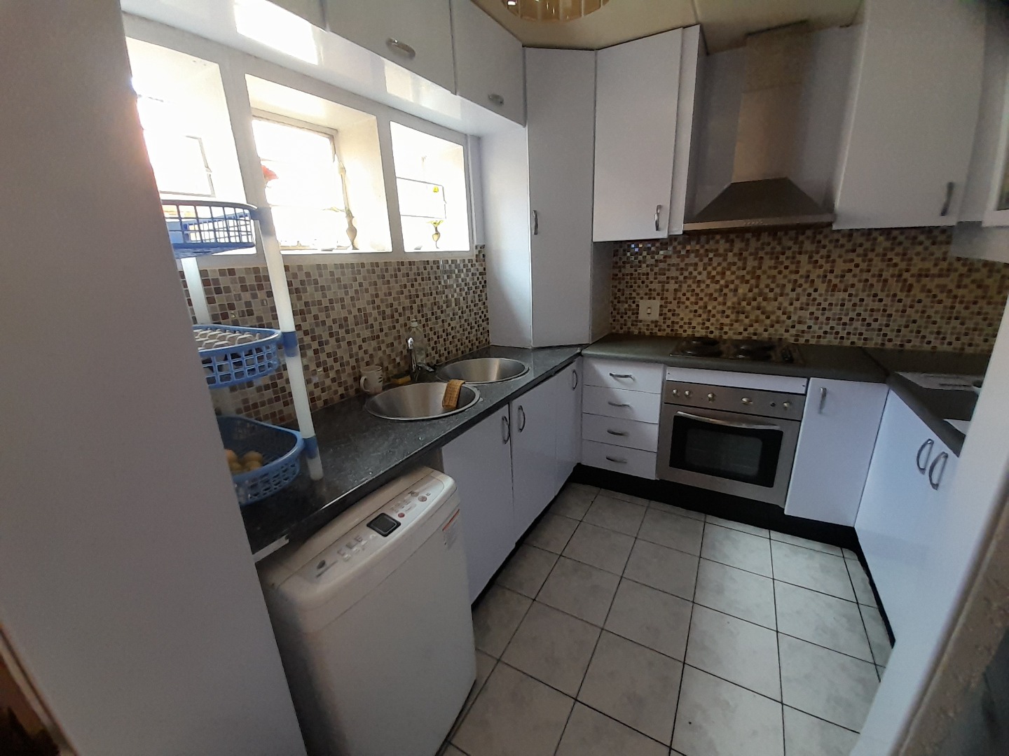 The residence offers two well-proportioned bedrooms, each benefiting from tiled flooring and generous natural light, providing a serene retreat. The single bathroom is fully tiled and features both a separate shower enclosure and a bathtub, alongside a vanity sink, catering to all your needs.