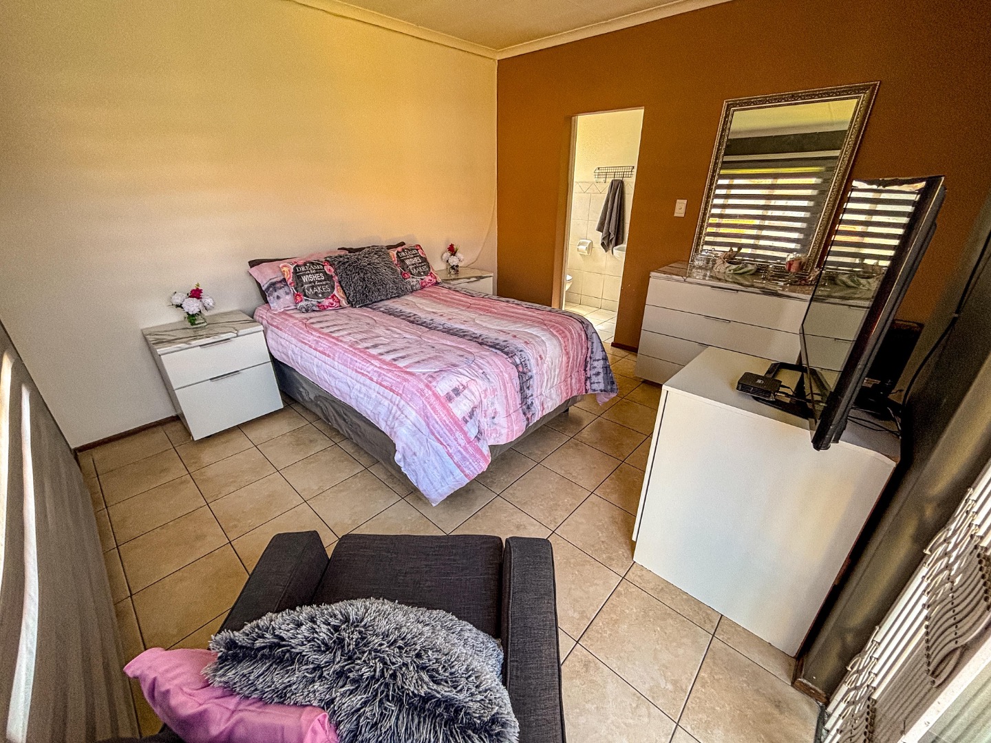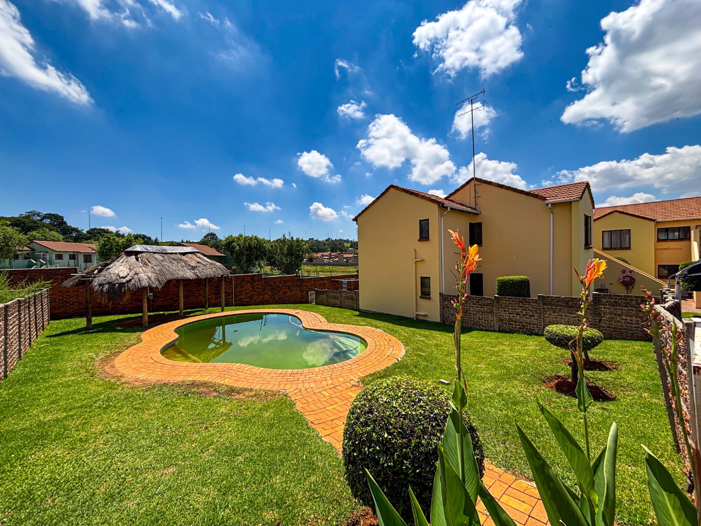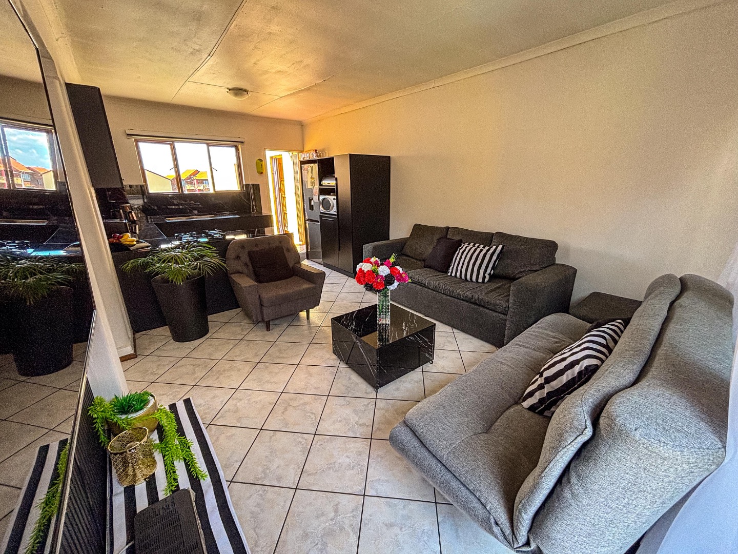 Discover modern living in this secure 2-bedroom, 2-bathroom complex unit in Mondeor, Johannesburg. The property boasts appealing kerb appeal with a manicured lawn and secure gated entry. Inside, the open-plan living area flows seamlessly into a sleek, modern kitchen featuring black cabinetry, marble-look countertops, and a built-in gas hob. Both bedrooms offer comfortable spaces with tiled flooring and ample natural light, one benefiting from built-in wardrobes and an en-suite bathroom. Residents enjoy access to a communal pool and the peace of mind provided by 24-hour security and an access gate. This well-maintained complex offers a convenient lifestyle.