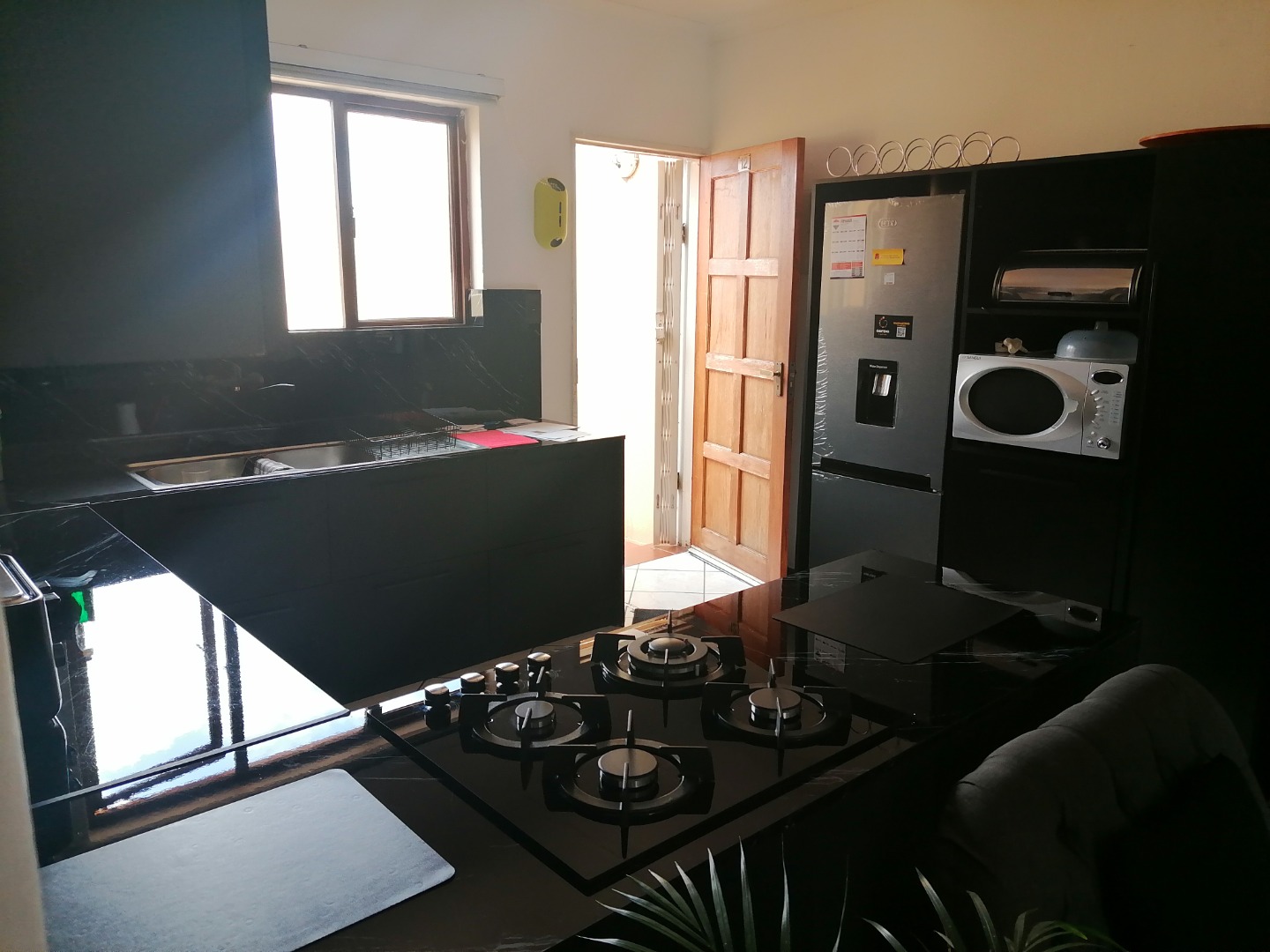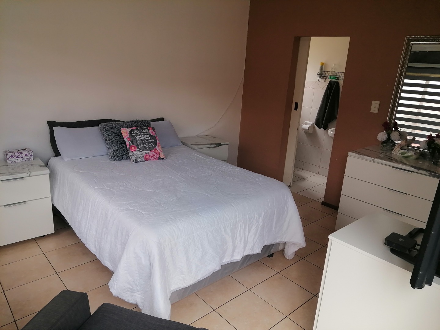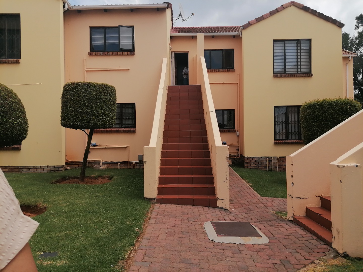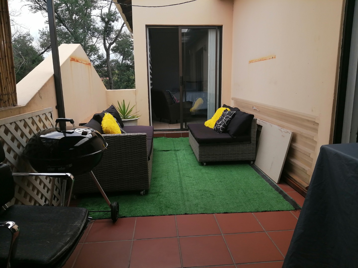 This residential property in Johannesburg presents a multi-story building with light exteriors and red-tiled roofs, complemented by well-maintained green spaces. The modern kitchen boasts a bold black aesthetic with matte cabinetry, striking marble-look countertops, and an integrated gas hob. The compact living area features tiled floors, abundant natural light, and security gates on the sliding door leading to the patio. It offers two bedrooms, one with an ensuite bathroom, and a second functional bathroom. Bedrooms include built-in wardrobes and tiled flooring. Enjoy a private outdoor patio/balcony with artificial turf, ideal for relaxation or entertaining with a BBQ grill. Located in Mondeor, this property offers a suburban lifestyle with convenient access to local amenities.