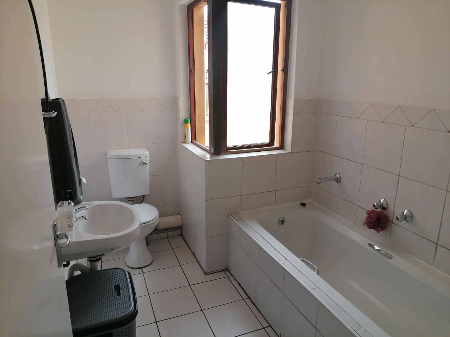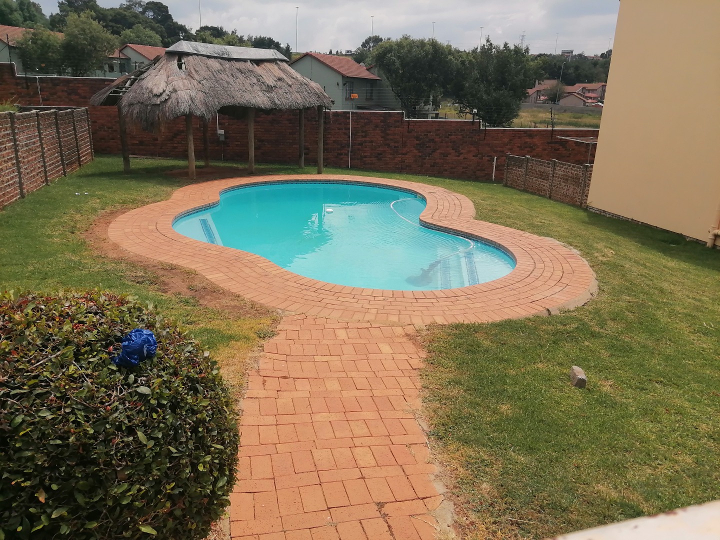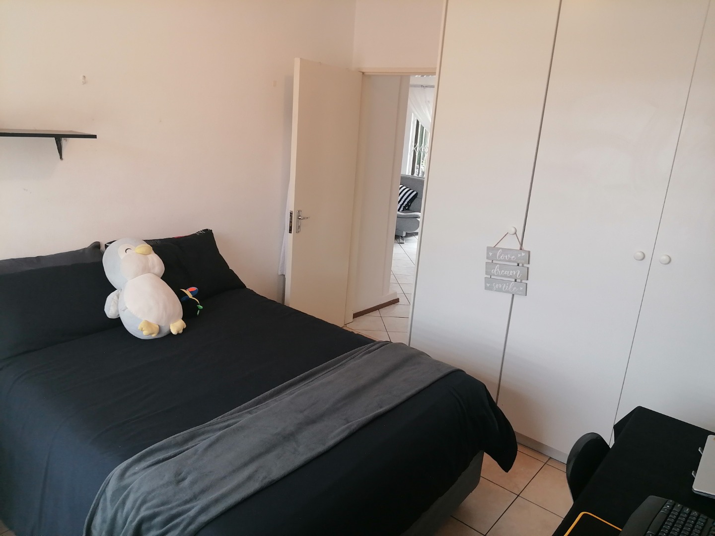 This residential property in Johannesburg presents a multi-story building with light exteriors and red-tiled roofs, complemented by well-maintained green spaces. The modern kitchen boasts a bold black aesthetic with matte cabinetry, striking marble-look countertops, and an integrated gas hob. The compact living area features tiled floors, abundant natural light, and security gates on the sliding door leading to the patio. It offers two bedrooms, one with an ensuite bathroom, and a second functional bathroom. Bedrooms include built-in wardrobes and tiled flooring. Enjoy a private outdoor patio/balcony with artificial turf, ideal for relaxation or entertaining with a BBQ grill. Located in Mondeor, this property offers a suburban lifestyle with convenient access to local amenities.