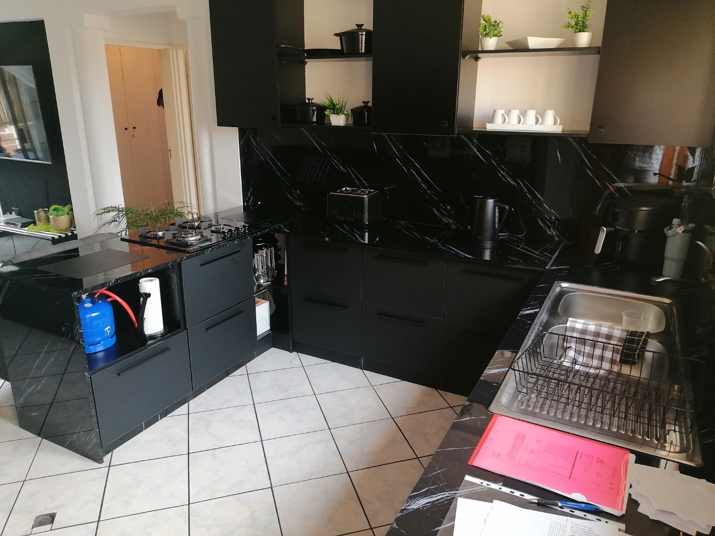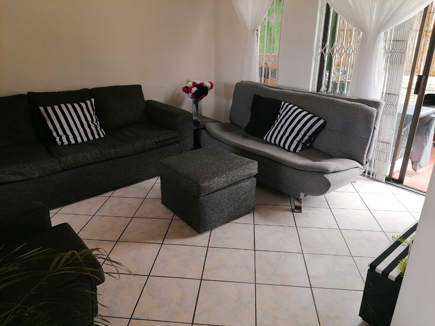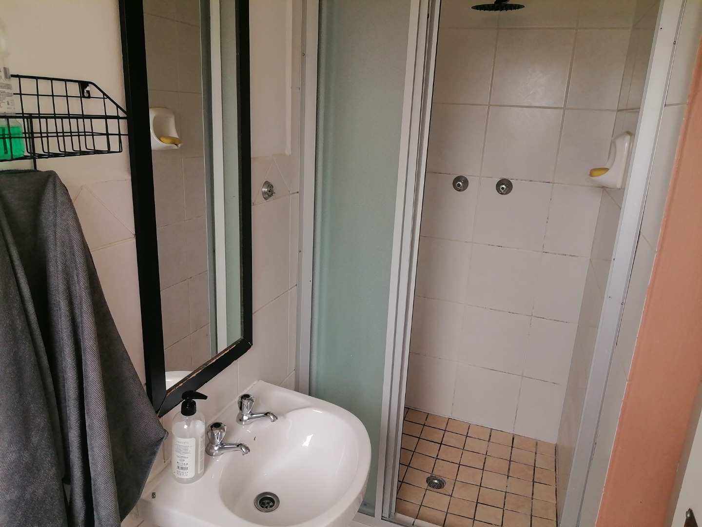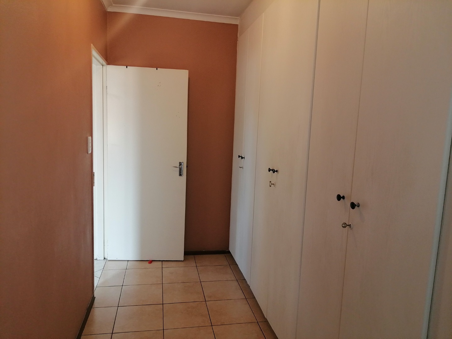 This residential property in Johannesburg presents a multi-story building with light exteriors and red-tiled roofs, complemented by well-maintained green spaces. The modern kitchen boasts a bold black aesthetic with matte cabinetry, striking marble-look countertops, and an integrated gas hob. The compact living area features tiled floors, abundant natural light, and security gates on the sliding door leading to the patio. It offers two bedrooms, one with an ensuite bathroom, and a second functional bathroom. Bedrooms include built-in wardrobes and tiled flooring. Enjoy a private outdoor patio/balcony with artificial turf, ideal for relaxation or entertaining with a BBQ grill. Located in Mondeor, this property offers a suburban lifestyle with convenient access to local amenities.