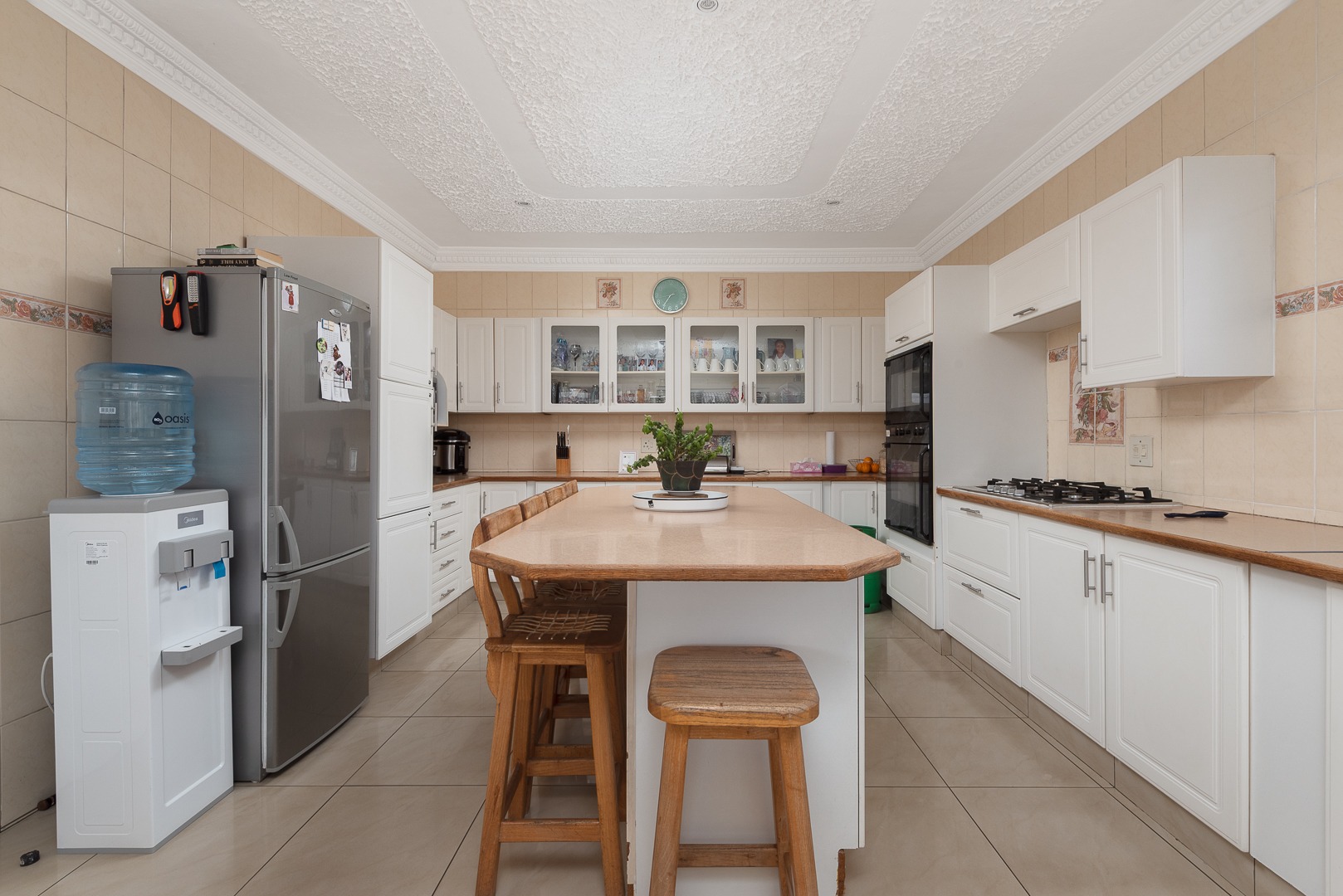 The kitchen is a highlight, offering ample white cabinetry, a large central island with seating, and built-in appliances including a double oven and gas hob. This home provides four comfortable bedrooms, ensuring plenty of space for the whole family. With three well-appointed bathrooms, including three ensuites, convenience and privacy are well catered for.