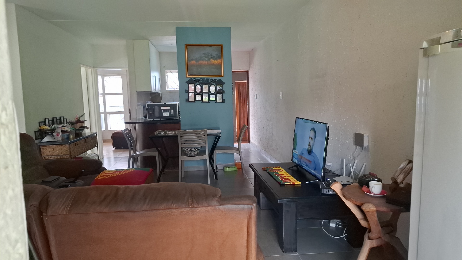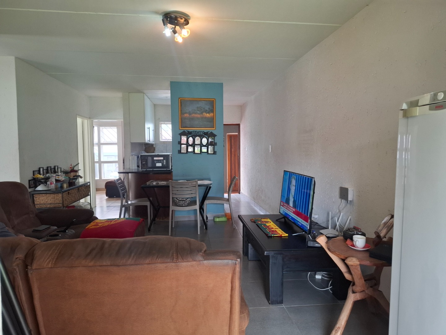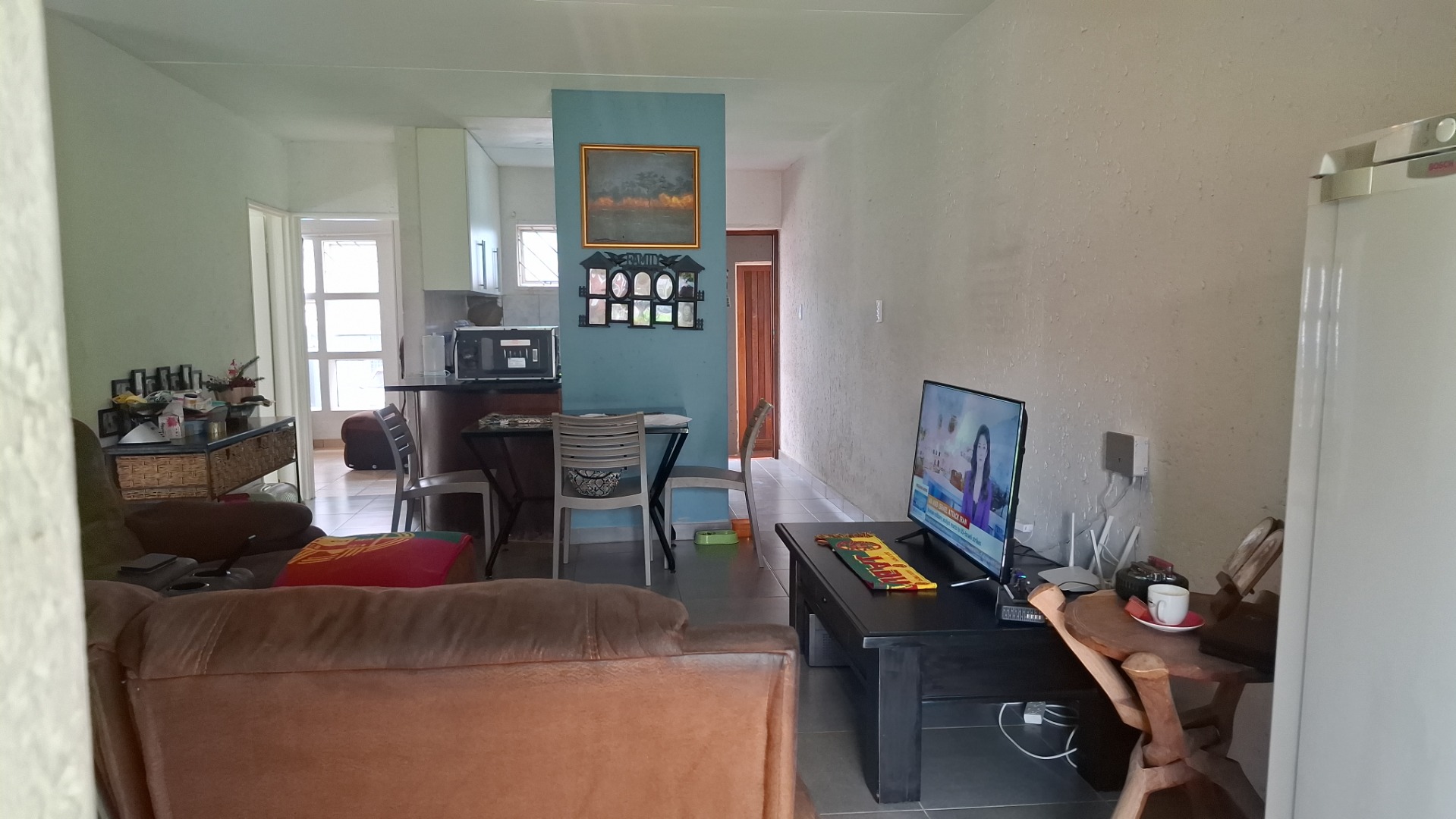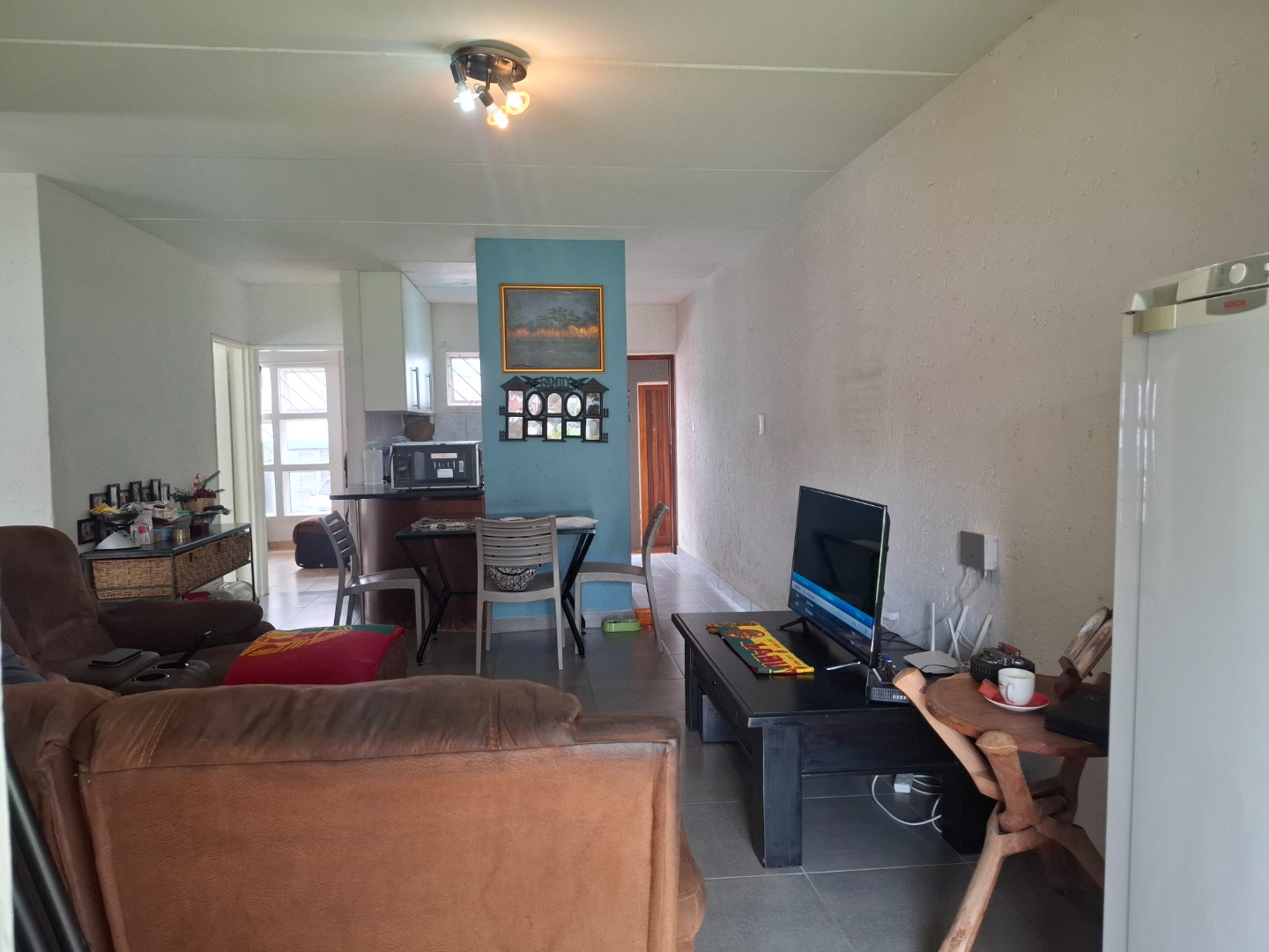 Inside, the home welcomes you with a bright open-plan layout designed for easy living and entertaining. The kitchen is both practical and functional, offering tiled flooring, a built-in electric hob, a modern stainless-steel refrigerator, and a convenient pantry that provides excellent storage space. The kitchen flows seamlessly into the spacious lounge area, creating a comfortable setting for everyday living.