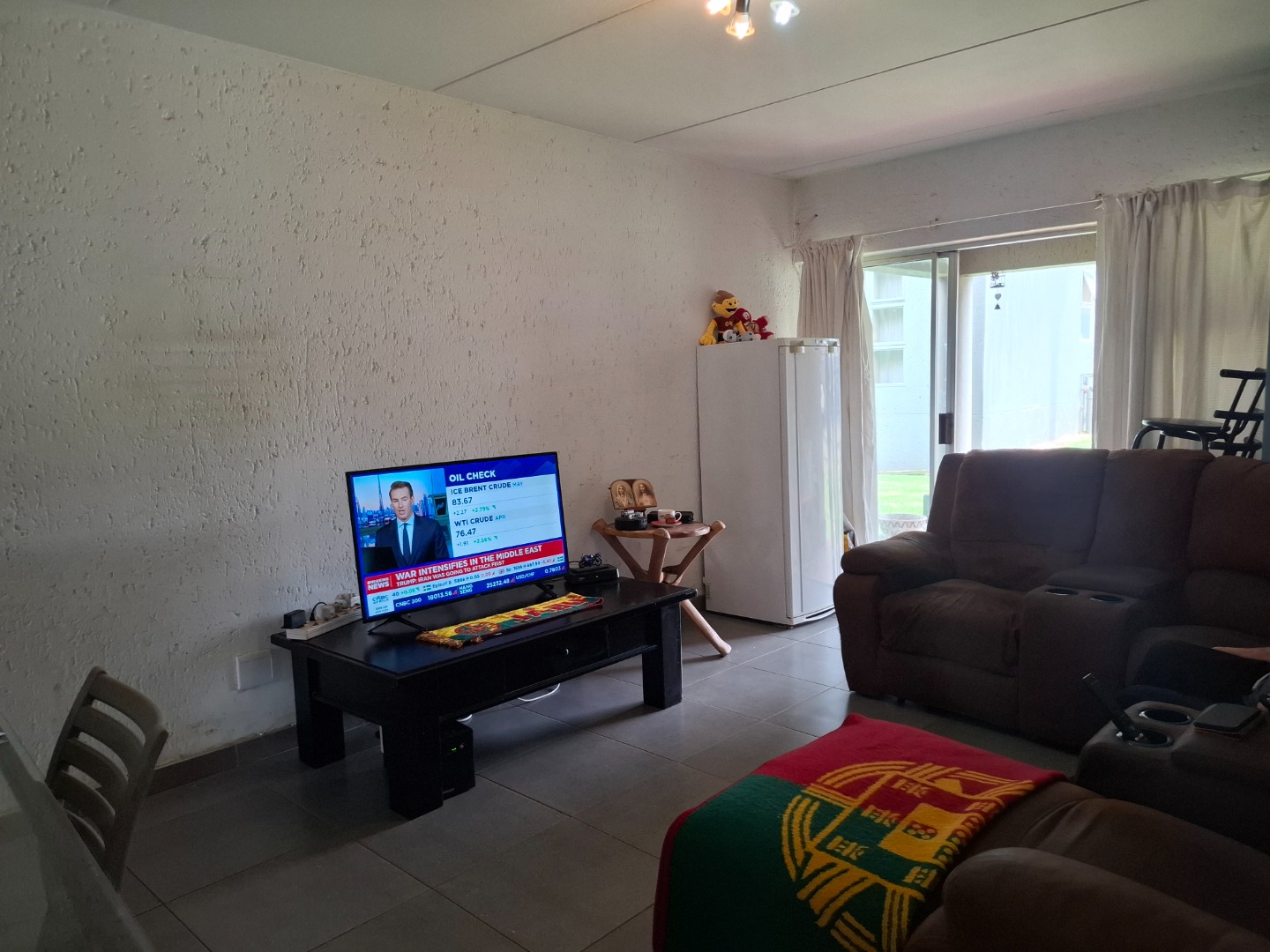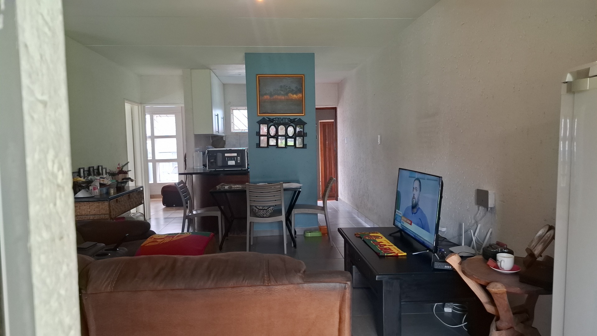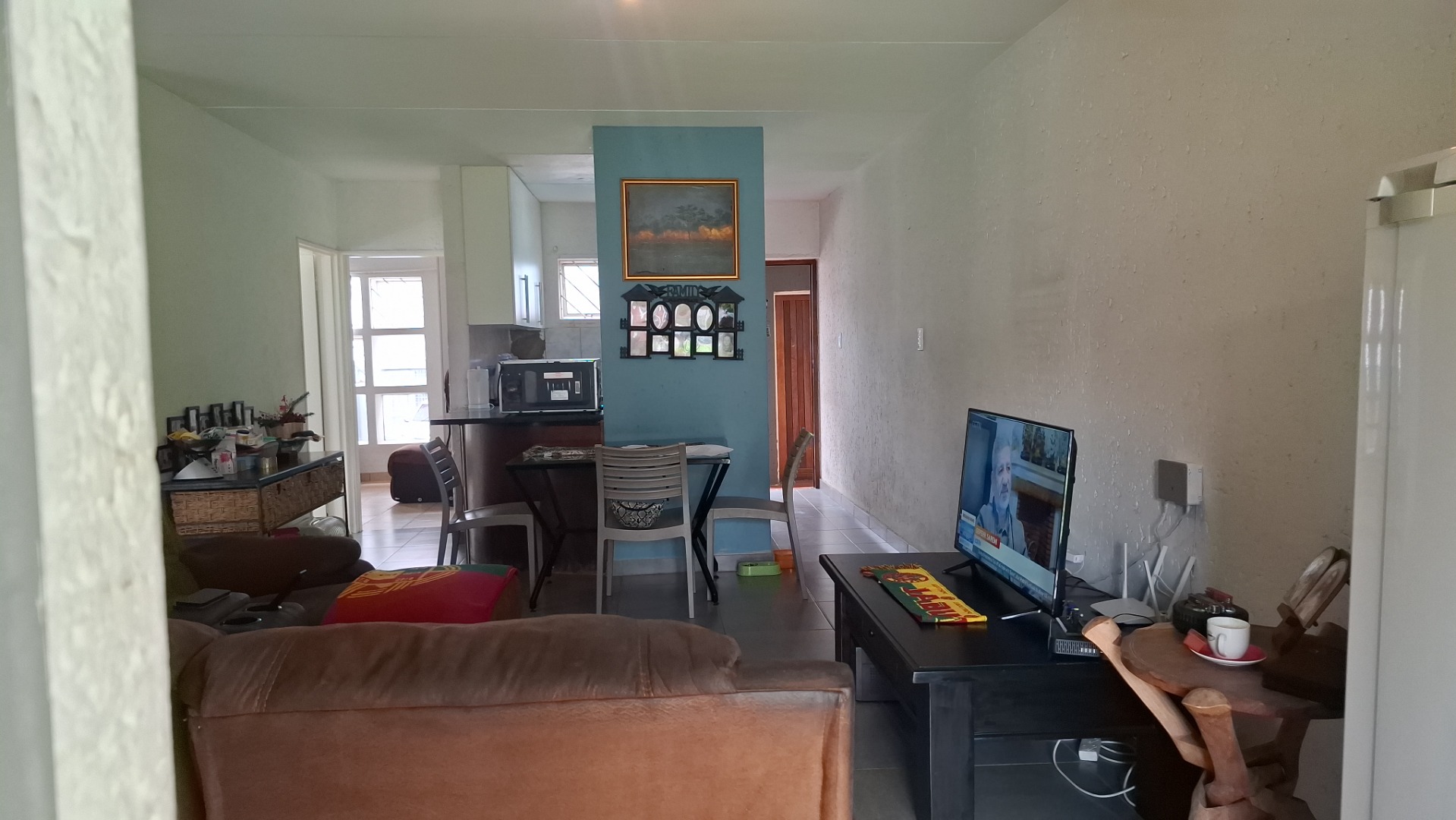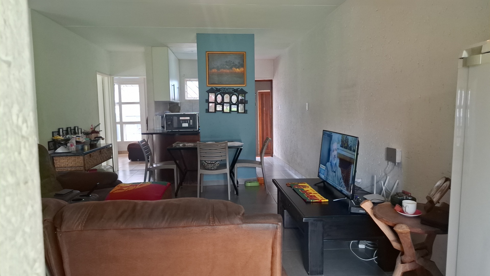 Inside, the home welcomes you with a bright open-plan layout designed for easy living and entertaining. The kitchen is both practical and functional, offering tiled flooring, a built-in electric hob, a modern stainless-steel refrigerator, and a convenient pantry that provides excellent storage space. The kitchen flows seamlessly into the spacious lounge area, creating a comfortable setting for everyday living.