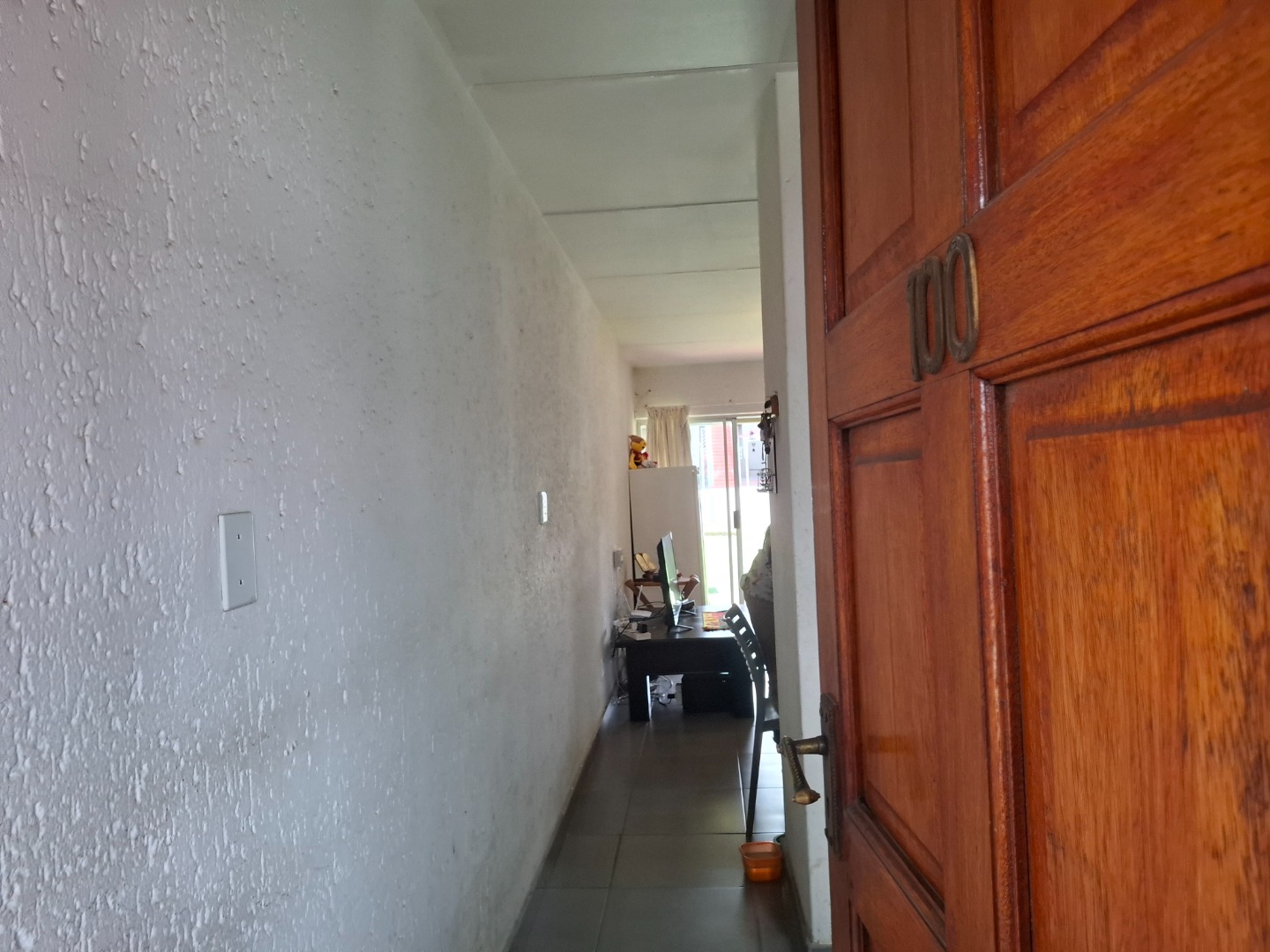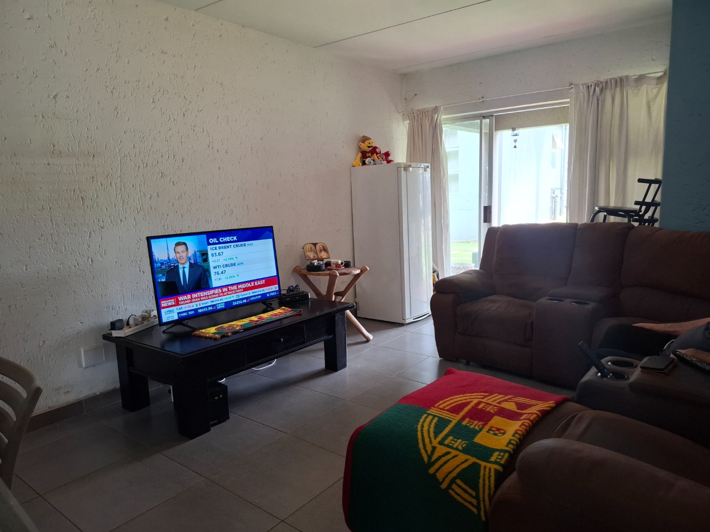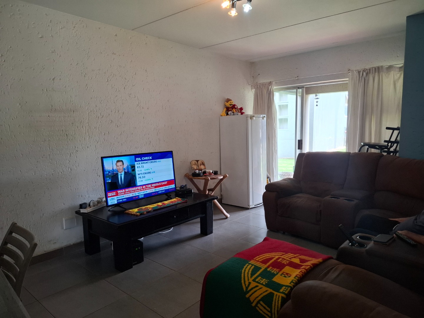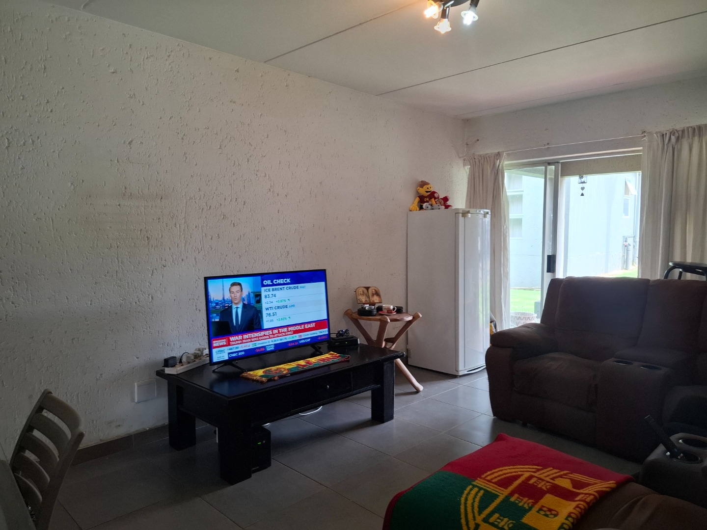 Inside, the home welcomes you with a bright open-plan layout designed for easy living and entertaining. The kitchen is both practical and functional, offering tiled flooring, a built-in electric hob, a modern stainless-steel refrigerator, and a convenient pantry that provides excellent storage space. The kitchen flows seamlessly into the spacious lounge area, creating a comfortable setting for everyday living.