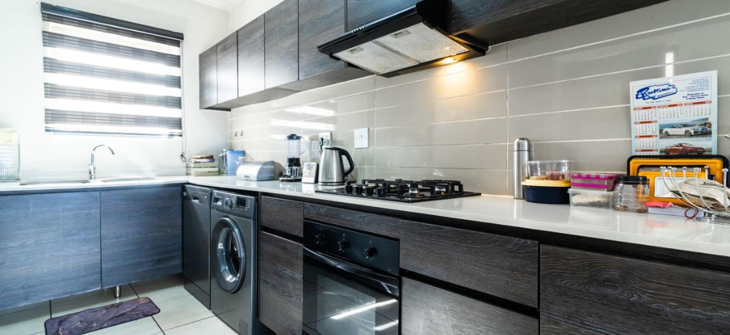 Stylish kitchen with Caesarstone countertops, gas hob, electric oven, and extractor fan