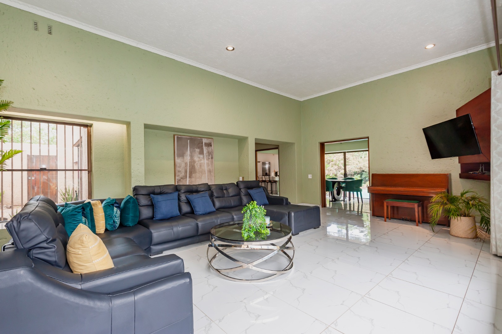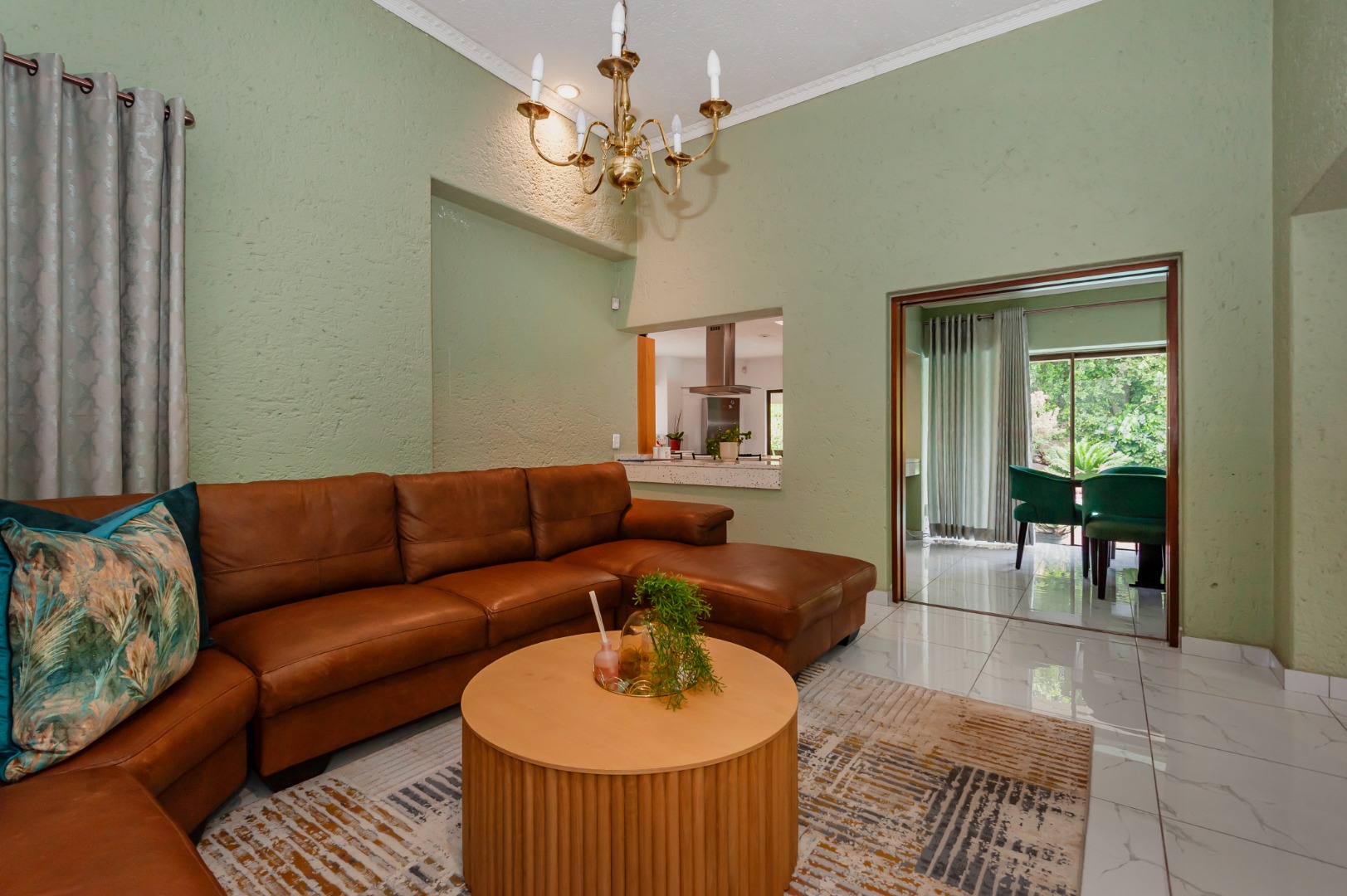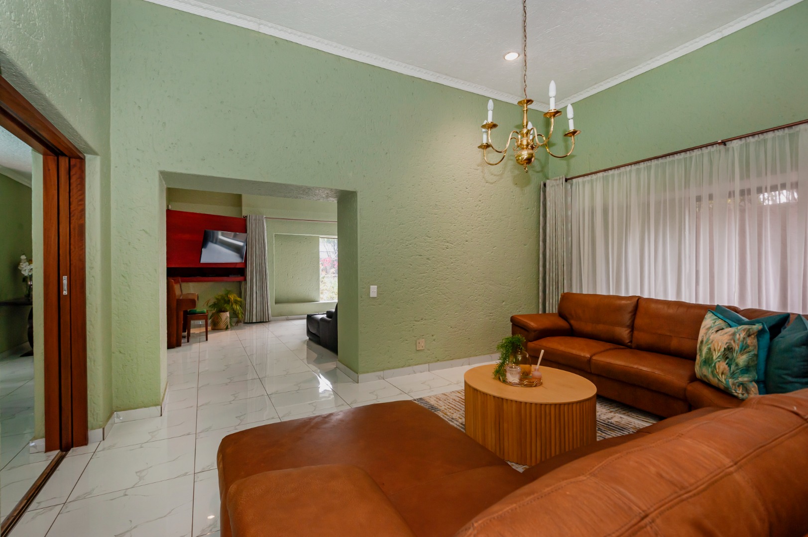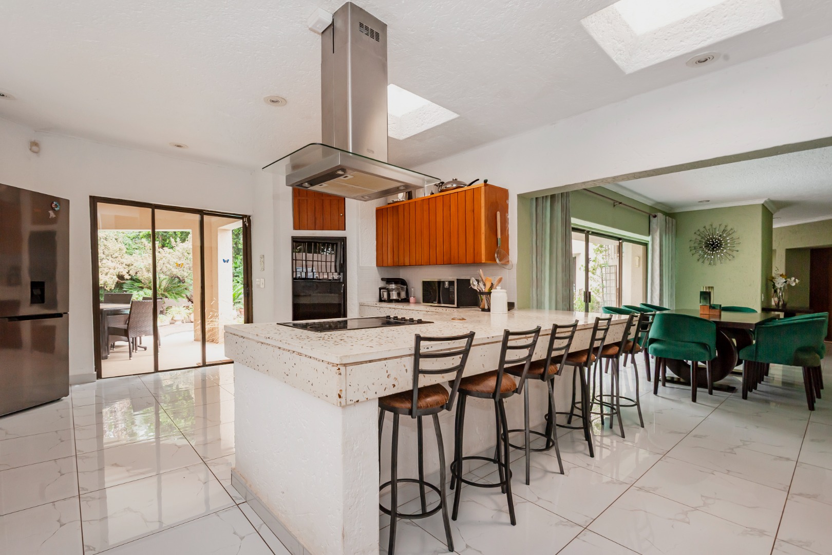 The living areas are exceptional — two large lounges open seamlessly to the dining area, which features sliding doors leading to the sparkling pool. The modern open-plan kitchen is equipped with granite countertops, ample built-in cupboards, a pantry, a scullery, and a dishwasher connection. A side door from the kitchen provides easy access to the pool and entertainment area.