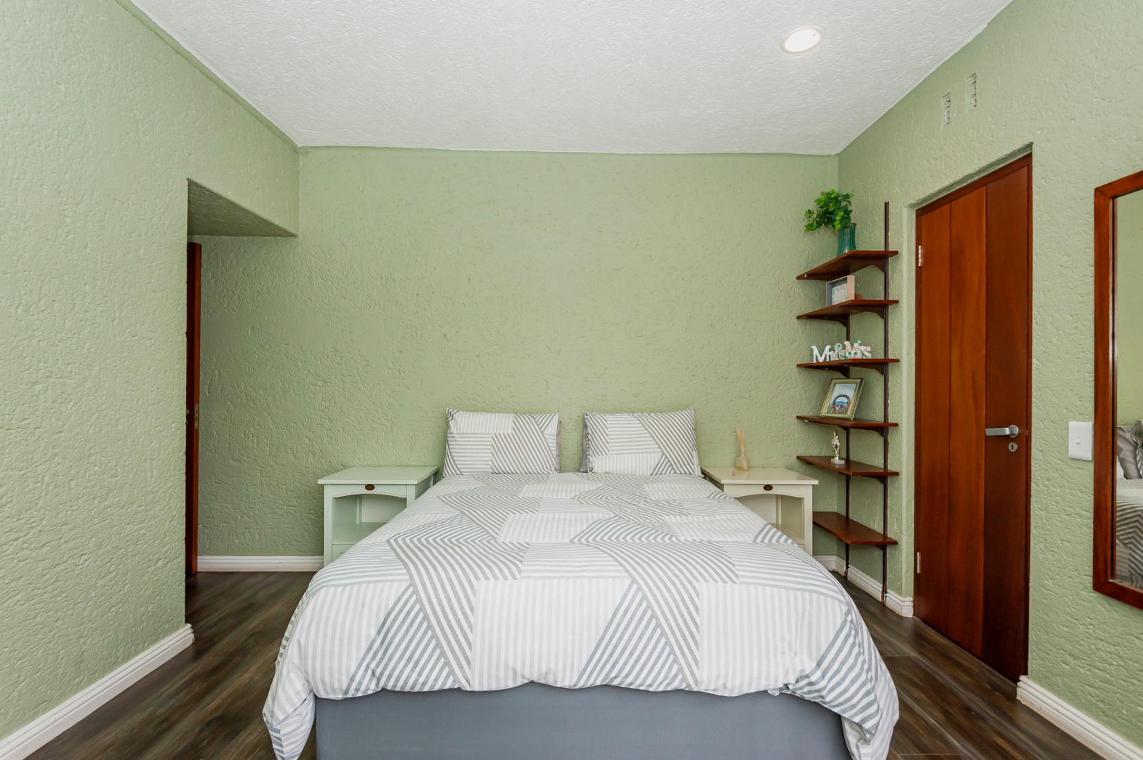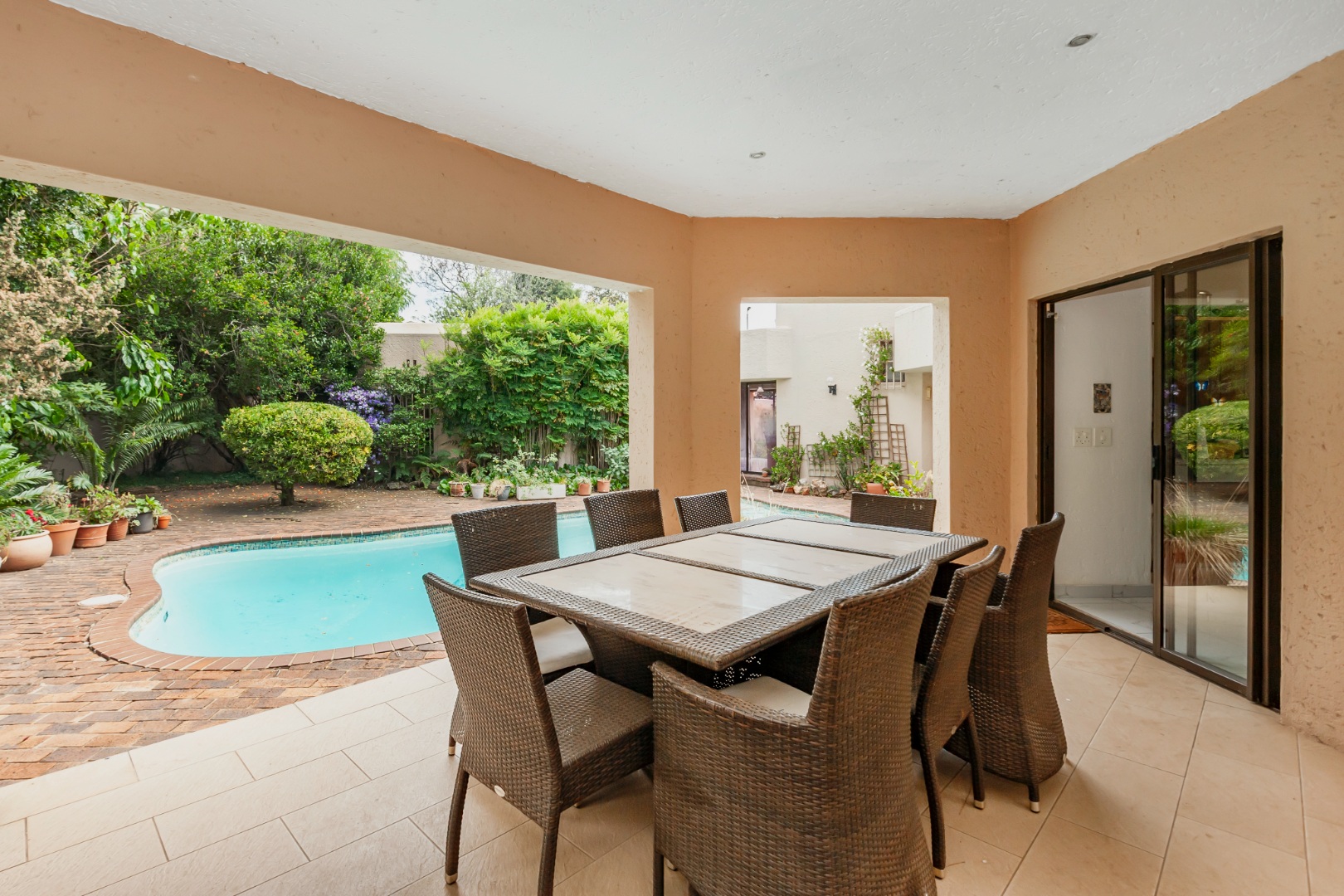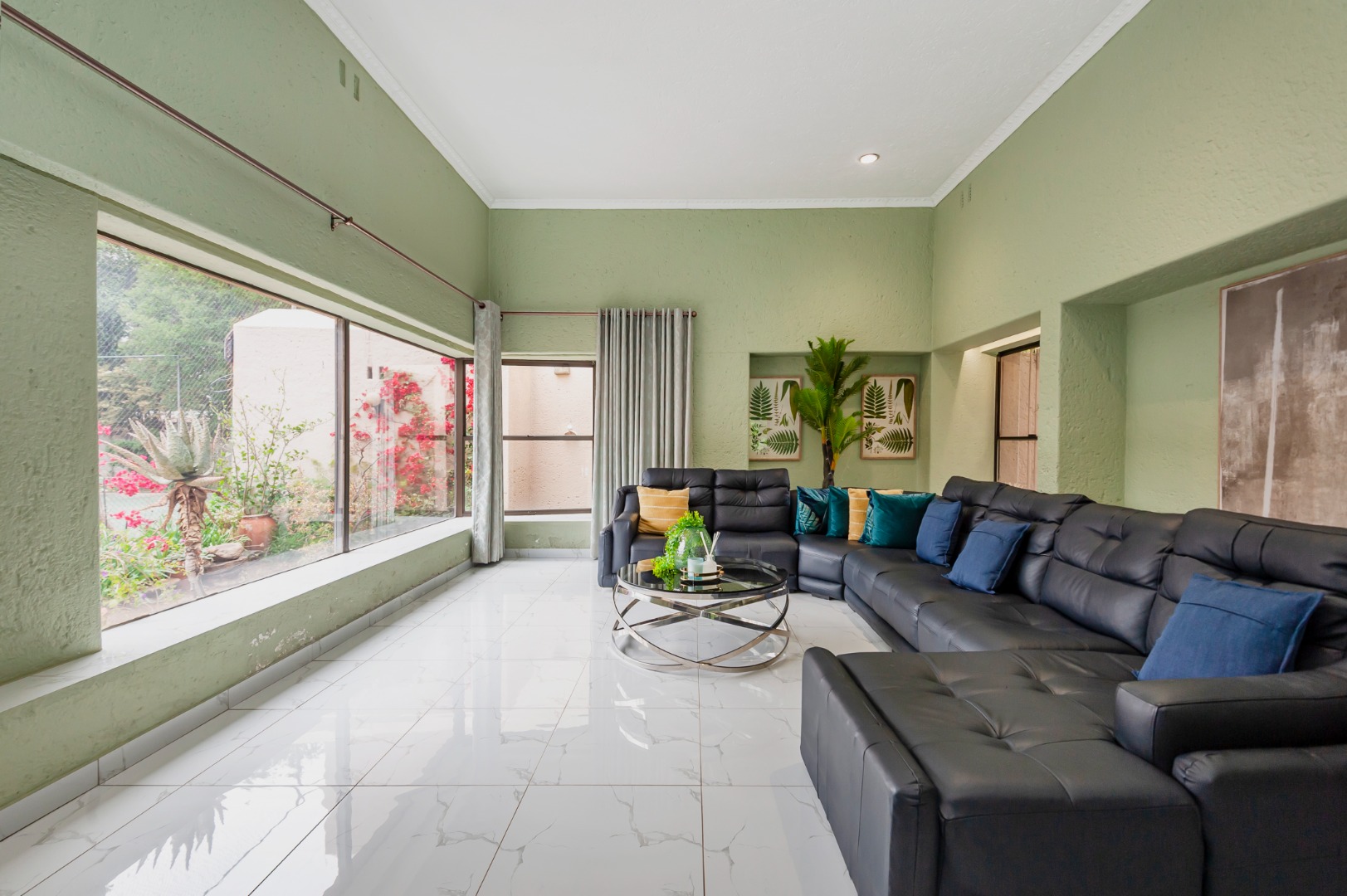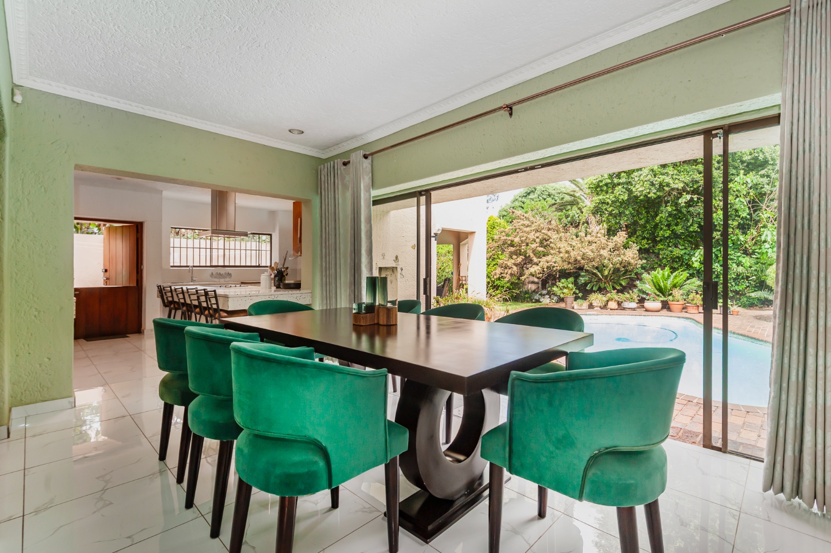 The living areas are exceptional — two large lounges open seamlessly to the dining area, which features sliding doors leading to the sparkling pool. The modern open-plan kitchen is equipped with granite countertops, ample built-in cupboards, a pantry, a scullery, and a dishwasher connection. A side door from the kitchen provides easy access to the pool and entertainment area.