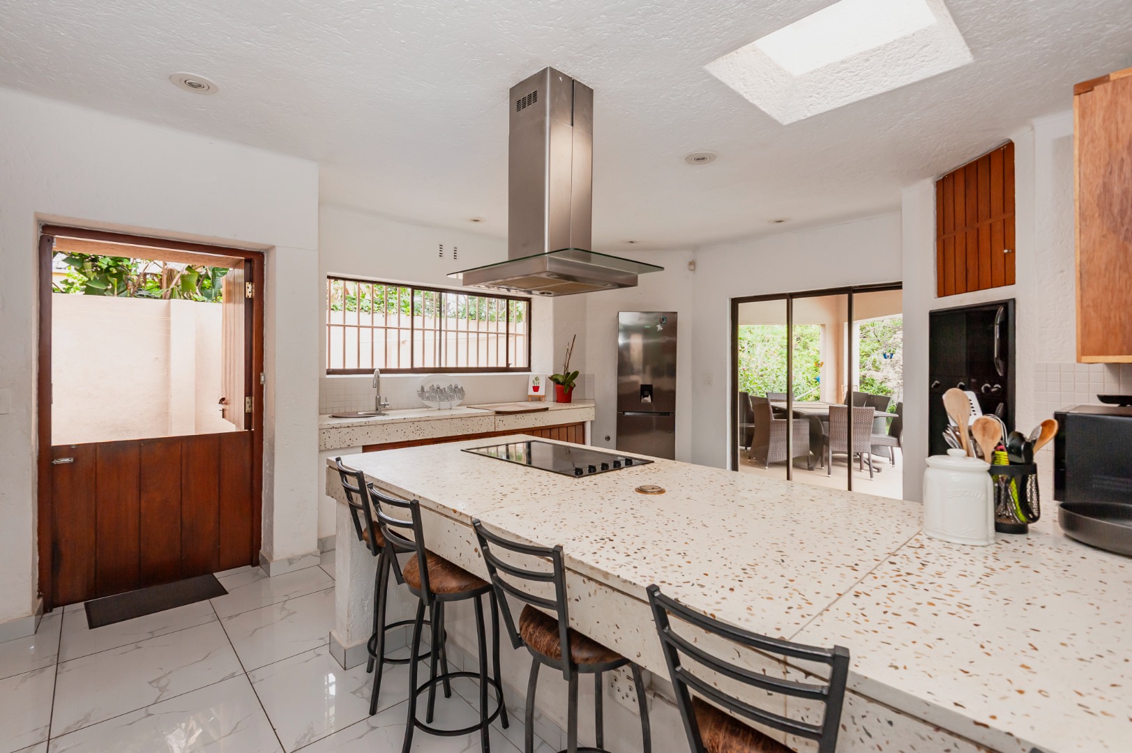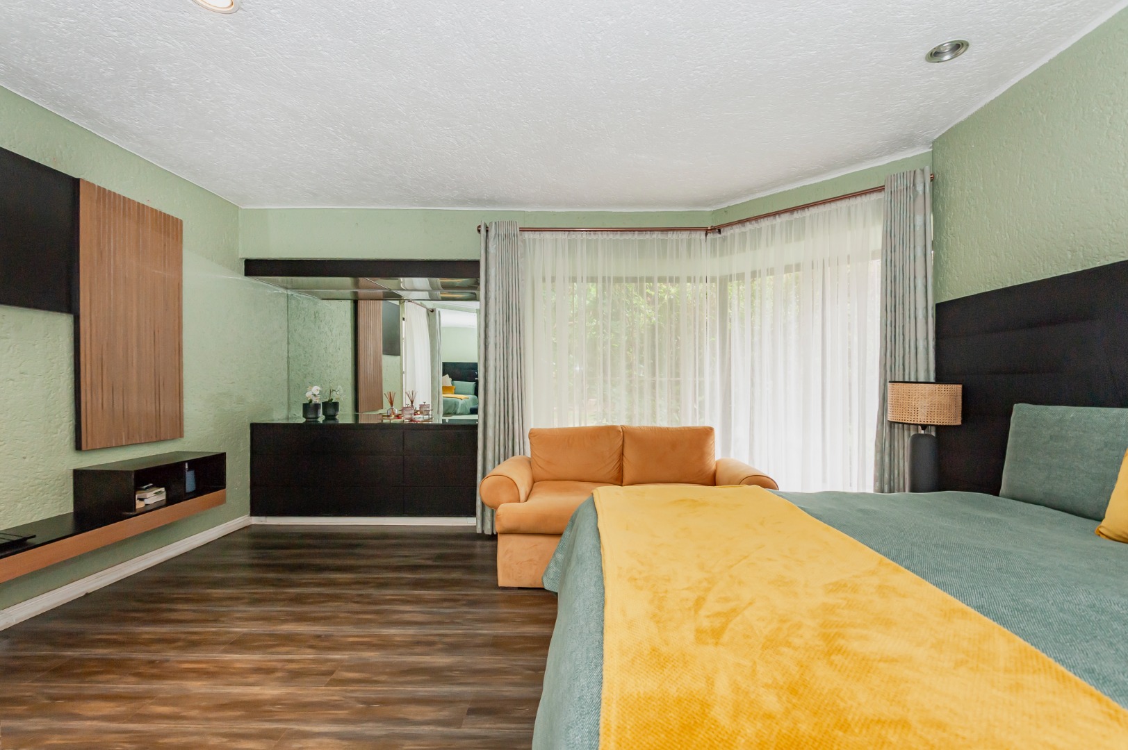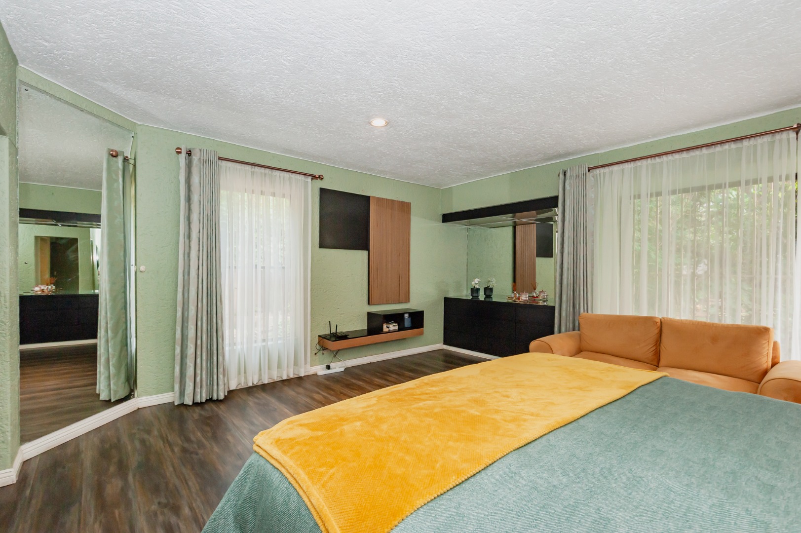 As you enter, you’re greeted by a generous entrance hall with sliding doors leading to the back garden. The private bedroom wing hosts three bedrooms with built-in cupboards, including a main bedroom with a walk-in closet, private courtyard, and full ensuite bathroom. A second full bathroom and a guest toilet add to the home’s convenience.