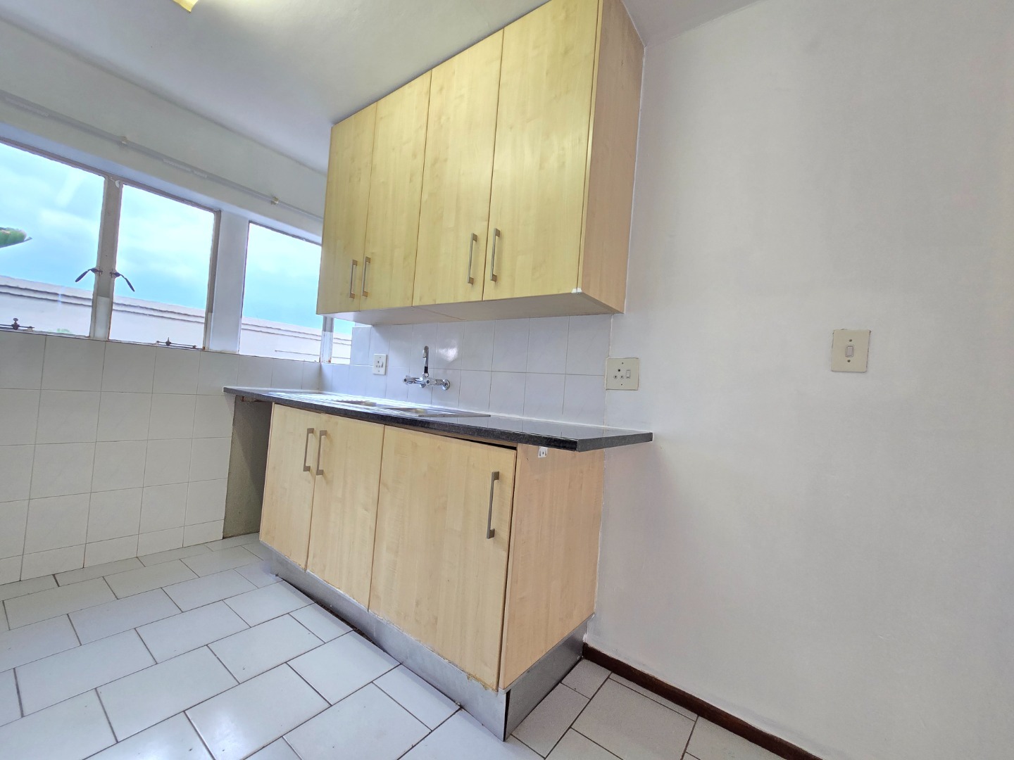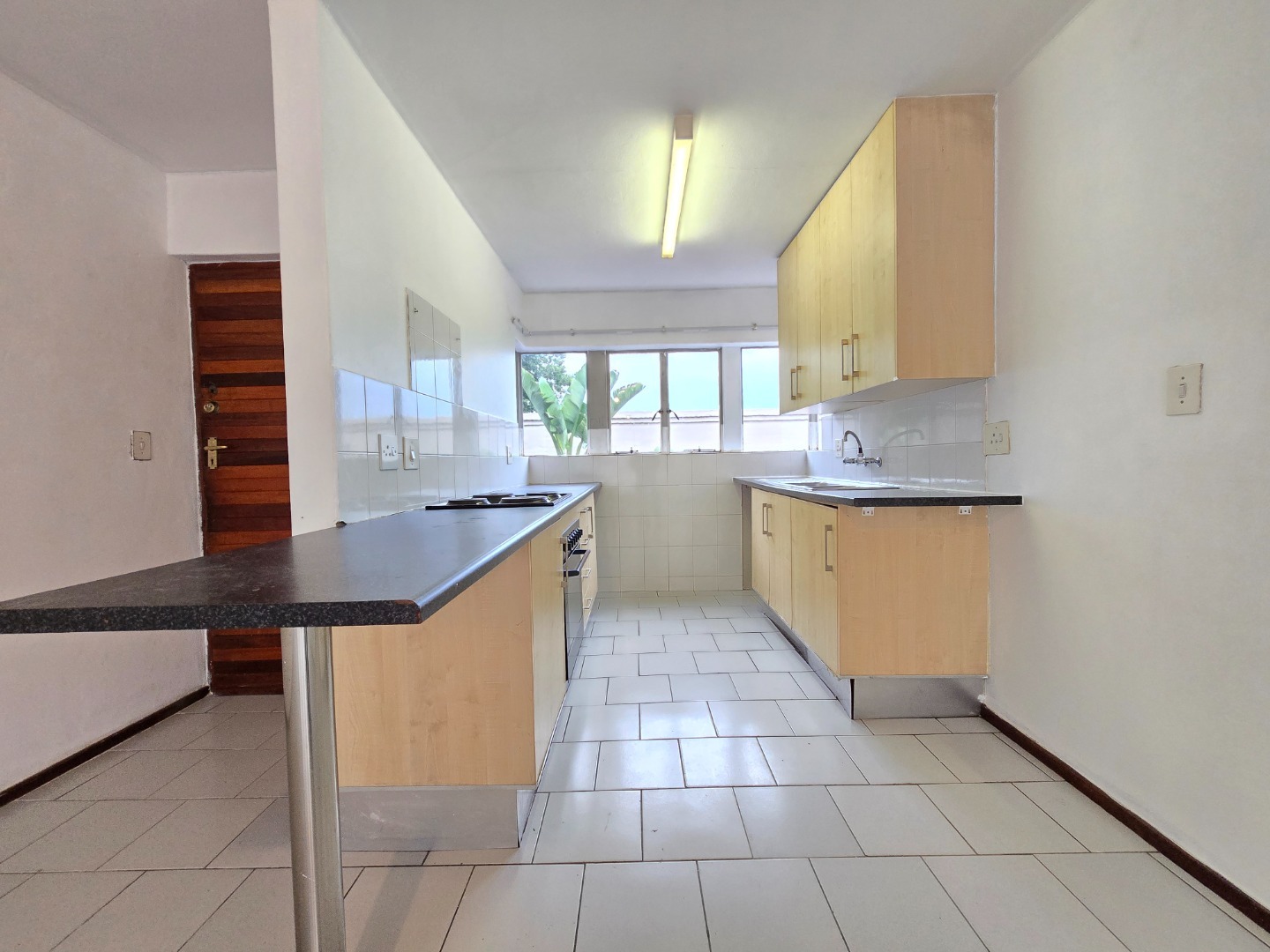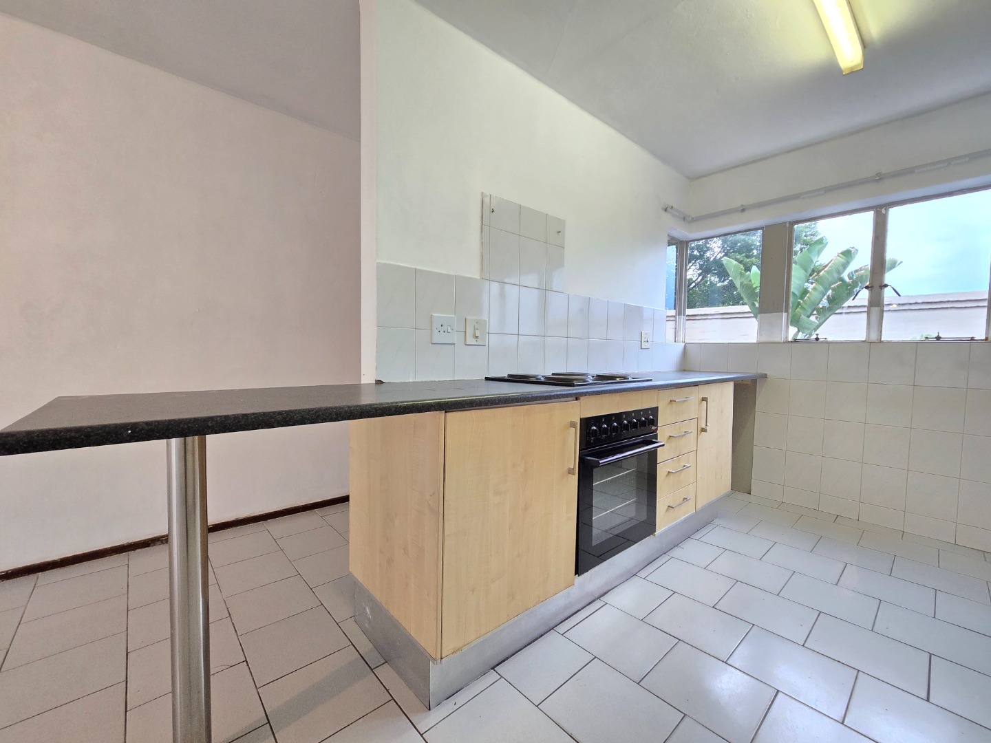 The apartment welcomes you with a neat and functional kitchen featuring ample cupboard space, a four-plate electric stove with oven, and a dedicated space for a washing machine. The open-plan layout allows the kitchen to flow seamlessly into the spacious lounge area, creating a warm and inviting living space ideal for both relaxing and entertaining.