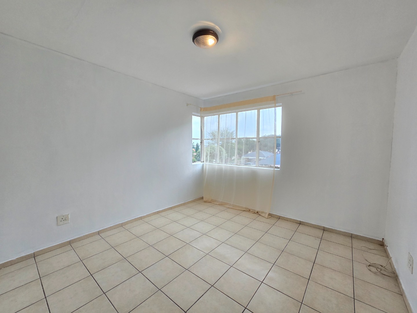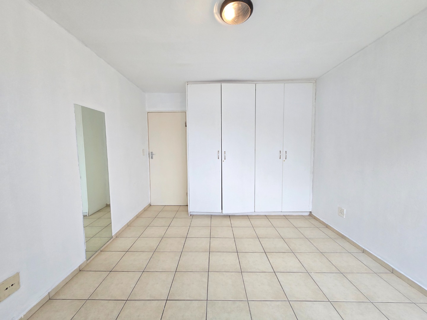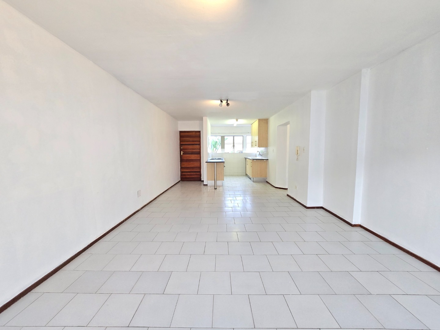 The apartment welcomes you with a neat and functional kitchen featuring ample cupboard space, a four-plate electric stove with oven, and a dedicated space for a washing machine. The open-plan layout allows the kitchen to flow seamlessly into the spacious lounge area, creating a warm and inviting living space ideal for both relaxing and entertaining.