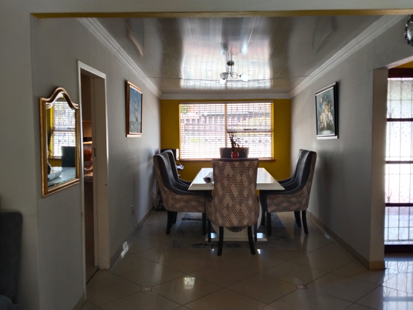 Be welcomed by an elegant entrance hall leading into two interleading reception rooms—a spacious lounge with double doors opening onto a covered patio with blinds, perfect for relaxing or entertaining. The home is fully tiled throughout, offering a clean and modern aesthetic.
