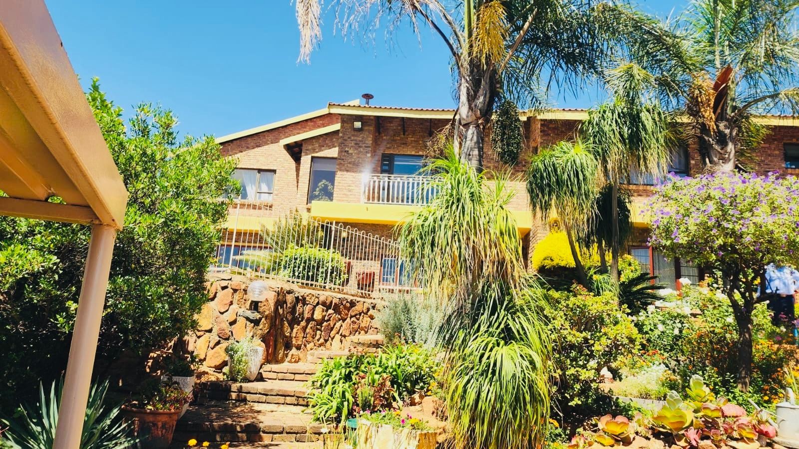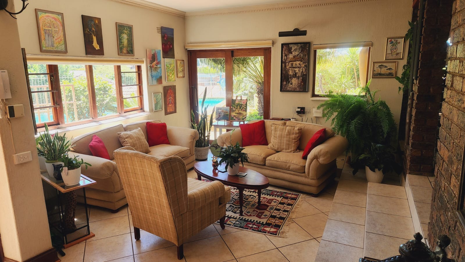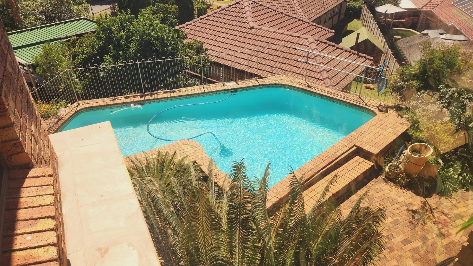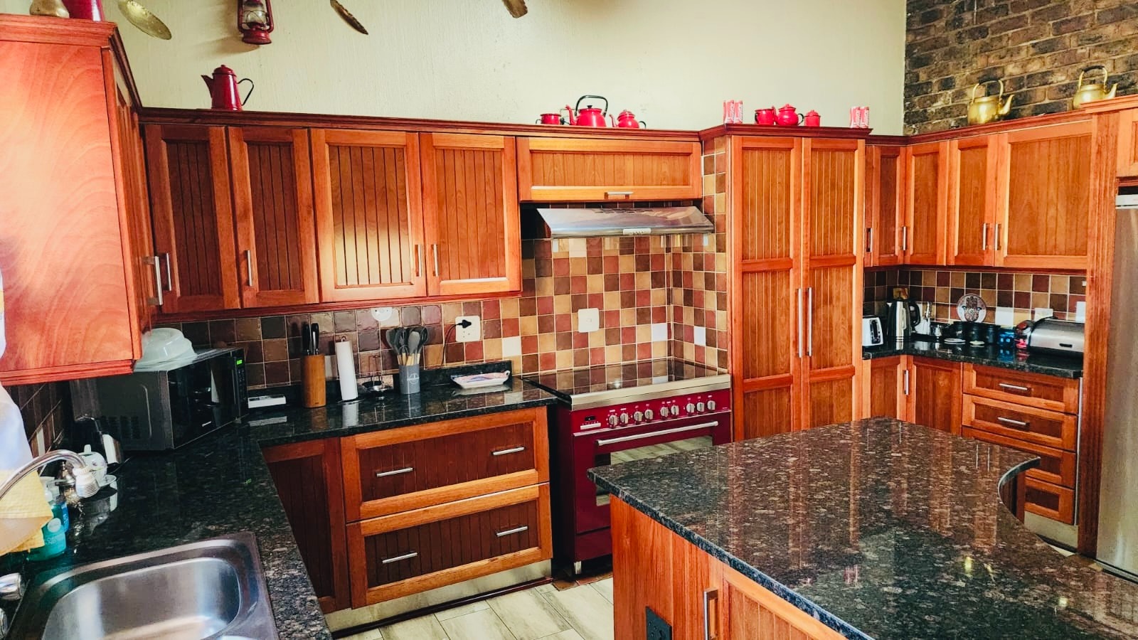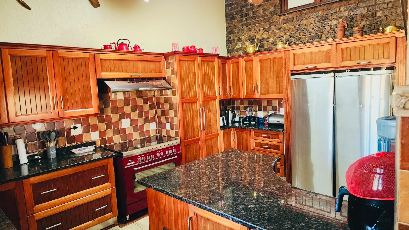 Nestled in the vibrant Johannesburg suburb of Ridgeway, this multi-story brick residence offers a unique family lifestyle. The property immediately impresses with its extensive, lush terraced garden, featuring mature palm trees and distinctive stone landscaping. A prominent balcony complements the home's robust brick exterior, providing an inviting outdoor space. Inside, the spacious kitchen forms the heart of the home, boasting extensive wooden cabinetry, durable dark granite countertops, and a central island. A striking red retro-style range cooker and an exposed brick accent wall add character, complemented by a large stainless steel double fridge. The rustic charm continues into the dining area with exposed brick walls and an archway, while the living room is bathed in natural light from expansive windows, offering serene views and direct access to the outdoor entertainment area. Tiled flooring ensures easy maintenance throughout these communal spaces. This substantial home features five comfortable bedrooms and three and a half bathrooms, providing ample accommodation. Outside, a private oasis awaits with a clean, inviting swimming pool surrounded by a spacious brick-paved patio, ideal for relaxation and entertaining. Lush, mature tropical landscaping creates a tranquil backdrop, while a double garage provides secure parking and additional storage. Ridgeway is a well-established residential area in Johannesburg, South Africa, known for its family-friendly atmosphere and convenient access to local amenities. Key Features: * 5 Bedrooms, 3.5 Bathrooms * Spacious Kitchen with Island & Granite Countertops * Red Retro-Style Range Cooker * Exposed Brick Accent Walls * Lush Terraced Garden with Mature Palms * Inviting Swimming Pool & Brick Patio * Double Garage * Ample Natural Light * Integrated Security Monitoring