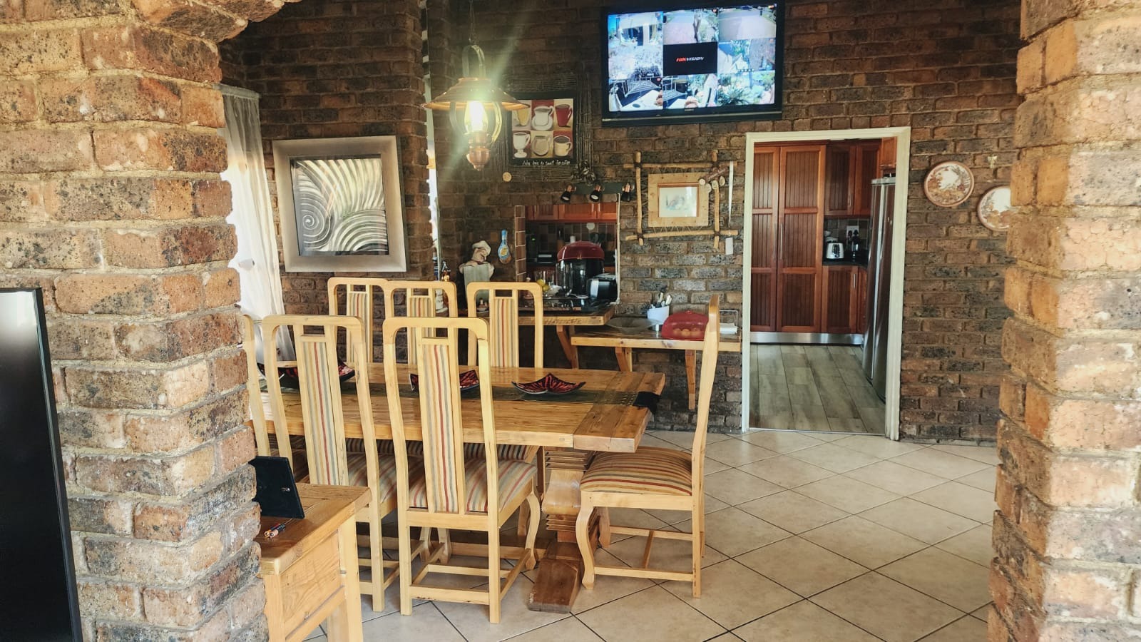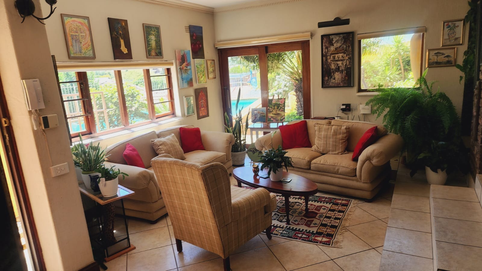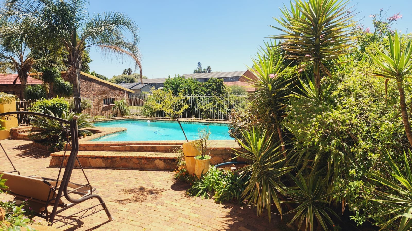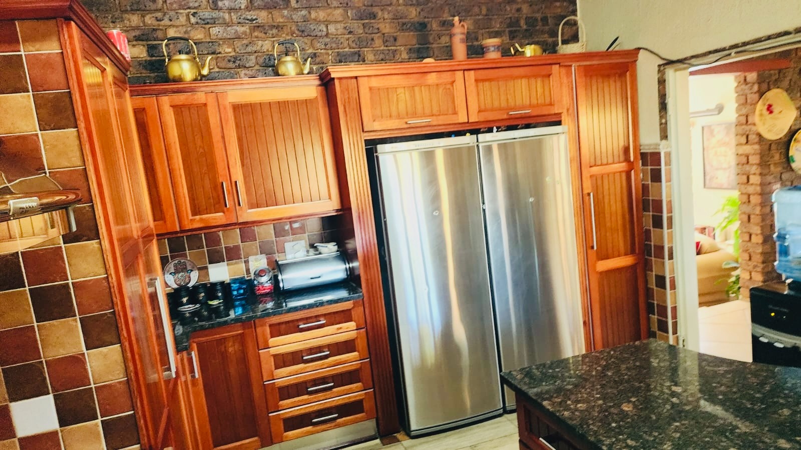 Nestled in the vibrant Johannesburg suburb of Ridgeway, this multi-story brick residence offers a unique family lifestyle. The property immediately impresses with its extensive, lush terraced garden, featuring mature palm trees and distinctive stone landscaping. A prominent balcony complements the home's robust brick exterior, providing an inviting outdoor space. Inside, the spacious kitchen forms the heart of the home, boasting extensive wooden cabinetry, durable dark granite countertops, and a central island. A striking red retro-style range cooker and an exposed brick accent wall add character, complemented by a large stainless steel double fridge. The rustic charm continues into the dining area with exposed brick walls and an archway, while the living room is bathed in natural light from expansive windows, offering serene views and direct access to the outdoor entertainment area. Tiled flooring ensures easy maintenance throughout these communal spaces. This substantial home features five comfortable bedrooms and three and a half bathrooms, providing ample accommodation. Outside, a private oasis awaits with a clean, inviting swimming pool surrounded by a spacious brick-paved patio, ideal for relaxation and entertaining. Lush, mature tropical landscaping creates a tranquil backdrop, while a double garage provides secure parking and additional storage. Ridgeway is a well-established residential area in Johannesburg, South Africa, known for its family-friendly atmosphere and convenient access to local amenities. Key Features: * 5 Bedrooms, 3.5 Bathrooms * Spacious Kitchen with Island & Granite Countertops * Red Retro-Style Range Cooker * Exposed Brick Accent Walls * Lush Terraced Garden with Mature Palms * Inviting Swimming Pool & Brick Patio * Double Garage * Ample Natural Light * Integrated Security Monitoring