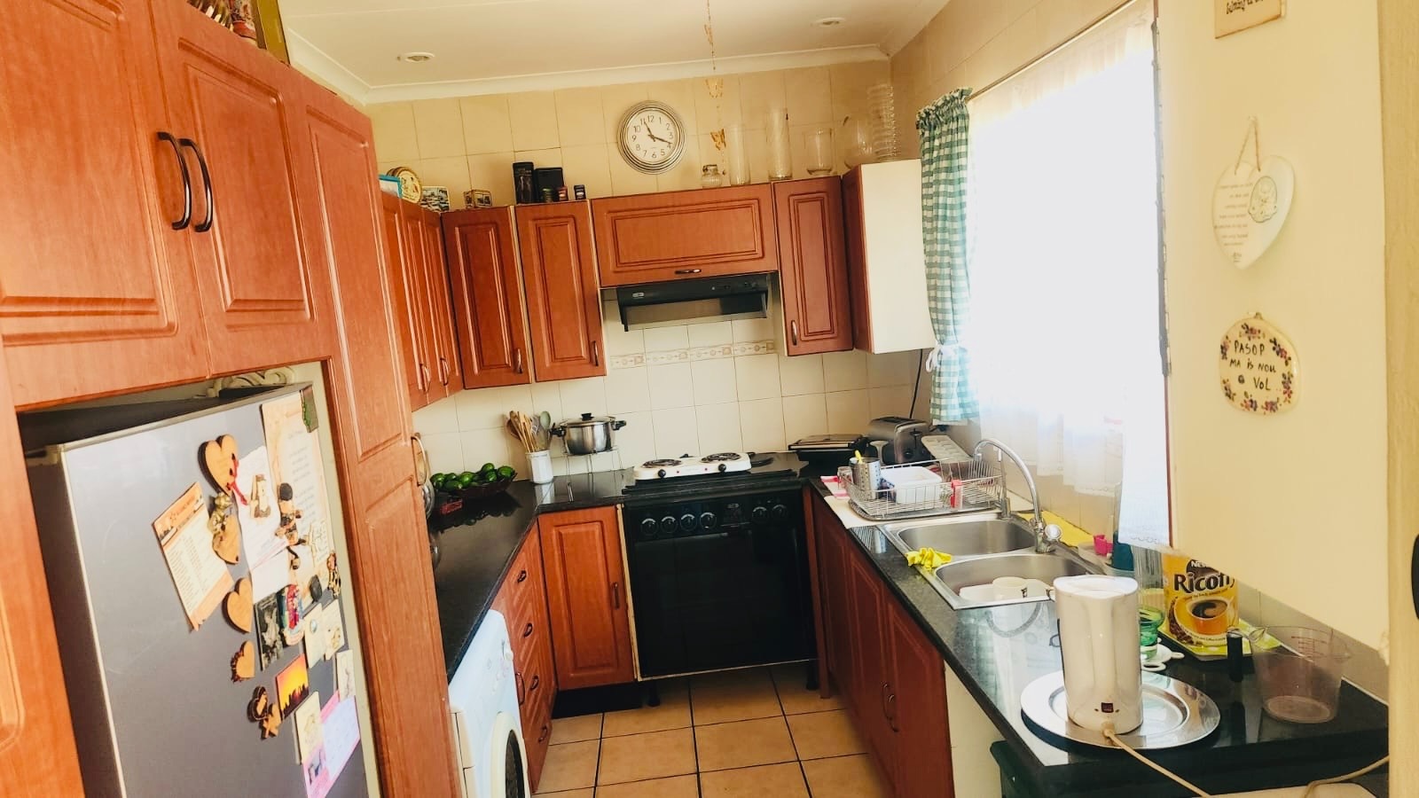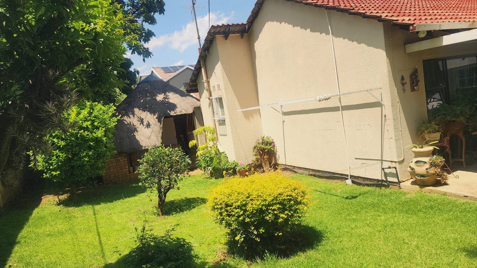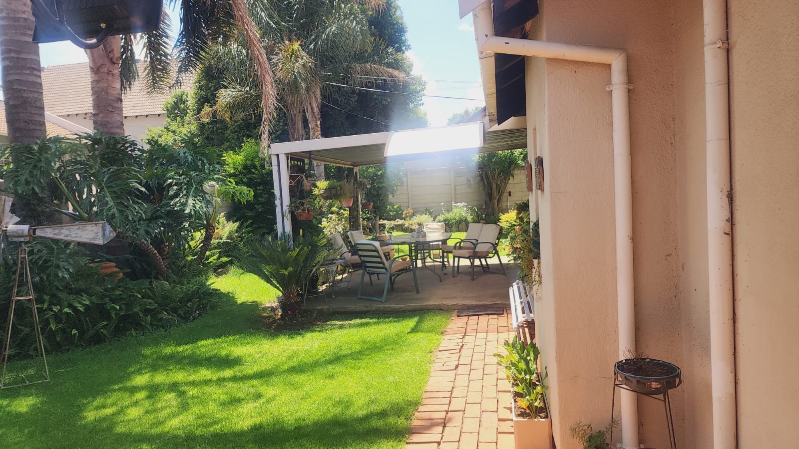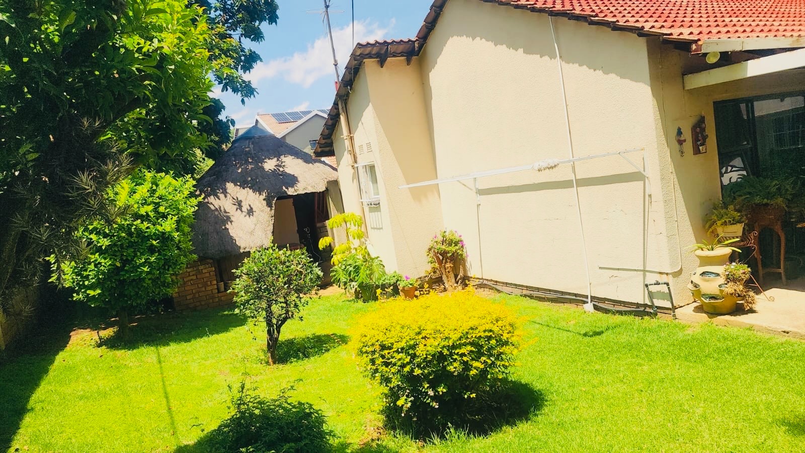 This inviting 3-bedroom, 2-bathroom residence is nestled in the established suburb of Suideroord, Johannesburg. The property immediately impresses with its well-maintained, lush green garden featuring mature trees and diverse plantings, creating a serene and private atmosphere. A precast perimeter wall, enhanced with electric fencing, ensures security and privacy, complemented by security bars on windows. The exterior showcases a light-colored house with a classic red-tiled roof, offering a welcoming curb appeal. A paved driveway leads to a covered carport, providing ample off-street parking. Inside, the home offers a functional layout designed for comfortable living. It comprises three spacious bedrooms and two bathrooms, catering to family needs. The living spaces include a dedicated lounge and a dining room, providing distinct areas for relaxation and entertaining. A well-appointed kitchen serves the home, ensuring practicality for daily routines. The outdoor areas are a true highlight, perfect for South African living. The expansive garden boasts vibrant greenery, including palm trees and blooming roses, alongside neatly mown lawns. Multiple paved patio areas offer versatile spaces for outdoor enjoyment, including a shaded outdoor patio with seating. A distinctive thatched lapa, complete with an integrated braai area, provides an ideal setting for entertaining guests or enjoying family meals al fresco. Security is a priority, with features such as electric fencing along the perimeter wall and security bars on windows, offering peace of mind. Located in Suideroord, this property benefits from its position within Johannesburg, providing convenient access to local amenities and transport routes. This suburban setting offers a balanced lifestyle, combining residential tranquility with urban accessibility. Key Features: * 3 Bedrooms, 2 Bathrooms * 1 Lounge, 1 Dining Room, 1 Kitchen * Lush, established garden with mature trees * Thatched lapa with integrated braai * Paved patio areas and driveway * 2 Garages, 4 Parking spaces * Electric fencing and security bars * Erf Size: 558 sqm