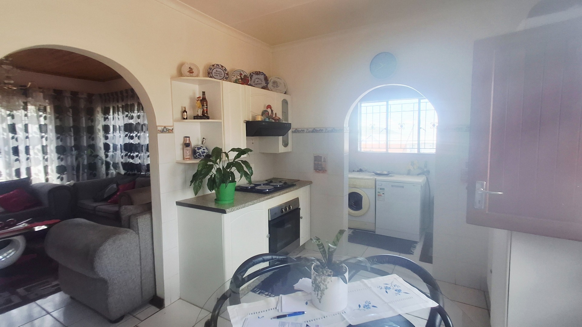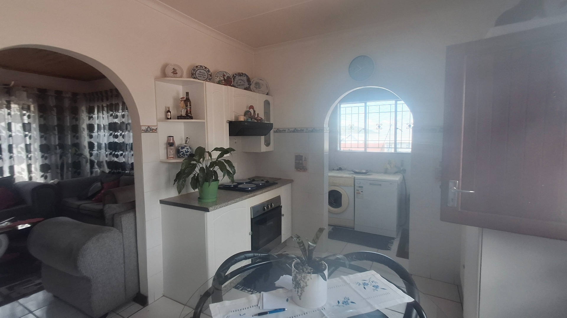 Inside, the home offers a charming blend of warmth and practicality. Wooden ceilings, tiled flooring, and archways connect the lounge, dining, and kitchen areas, creating a cohesive flow ideal for family life. The bright living room welcomes natural light, while the well?equipped kitchen features white cabinetry, a built?in oven and hob, and an integrated dining nook. A dedicated utility area with laundry facilities adds valuable convenience. Three comfortable bedrooms and a neat bathroom complete the interior.