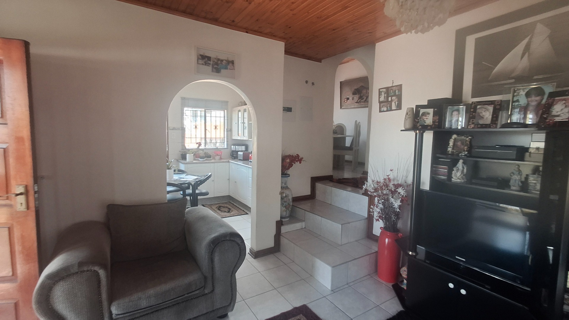 * Open-plan living with wooden ceilings