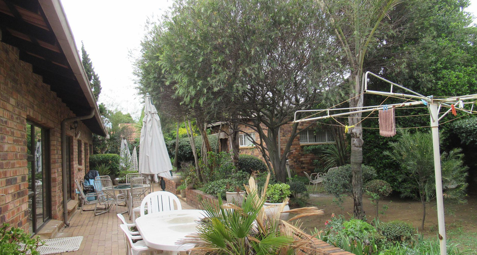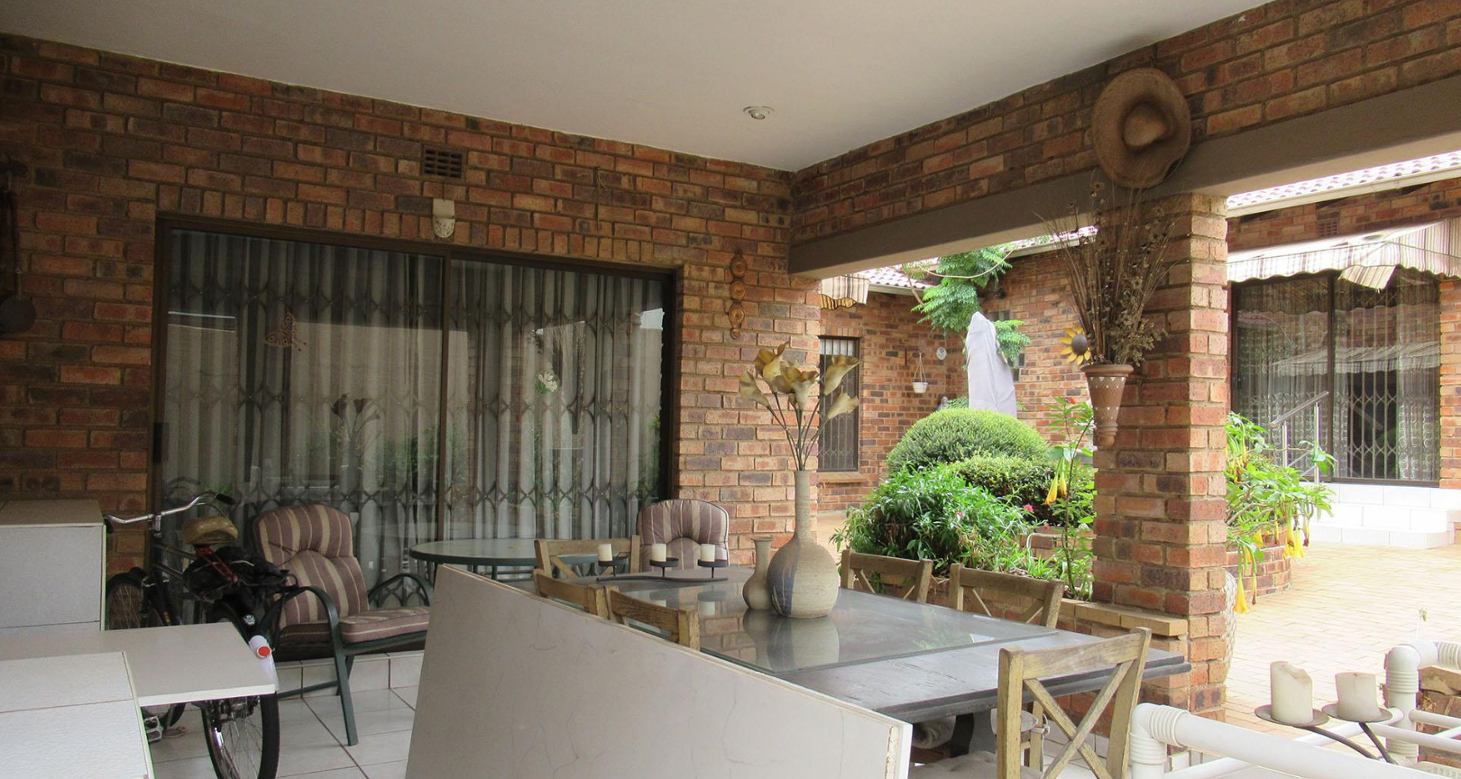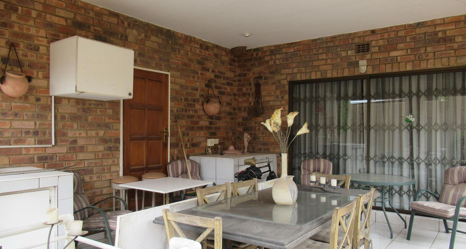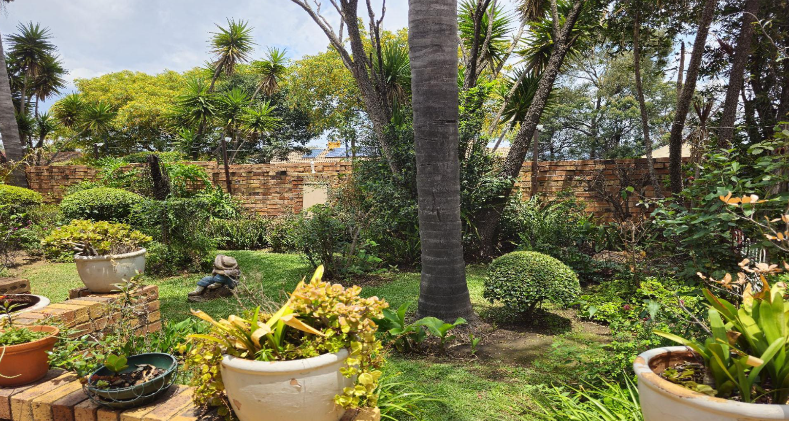 The outdoor spaces are equally impressive, featuring a spacious covered patio perfect for alfresco dining and entertaining. An additional covered outdoor entertainment area includes a built-in braai and counter space, ideal for hosting gatherings. The property benefits from a lush, established garden with mature trees, providing privacy and a serene environment, all bordered by a brick wall. Paving ensures easy maintenance around the exterior. With three garages, there is ample secure parking and storage for vehicles. Pets are allowed, making this an ideal home for families with furry companions.