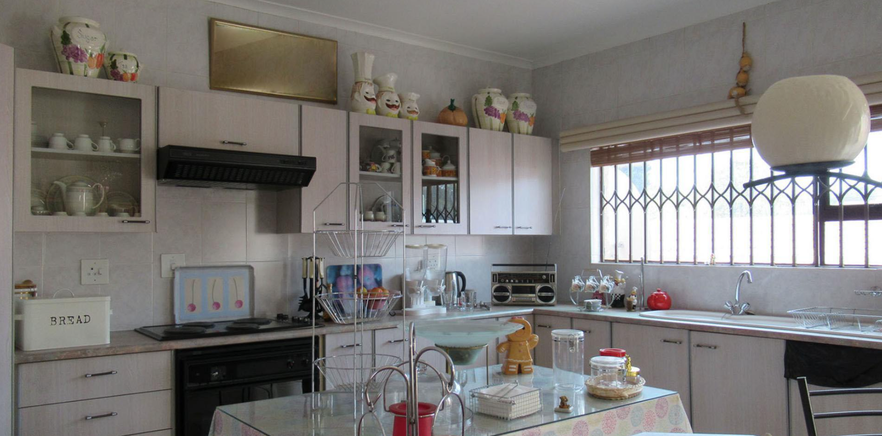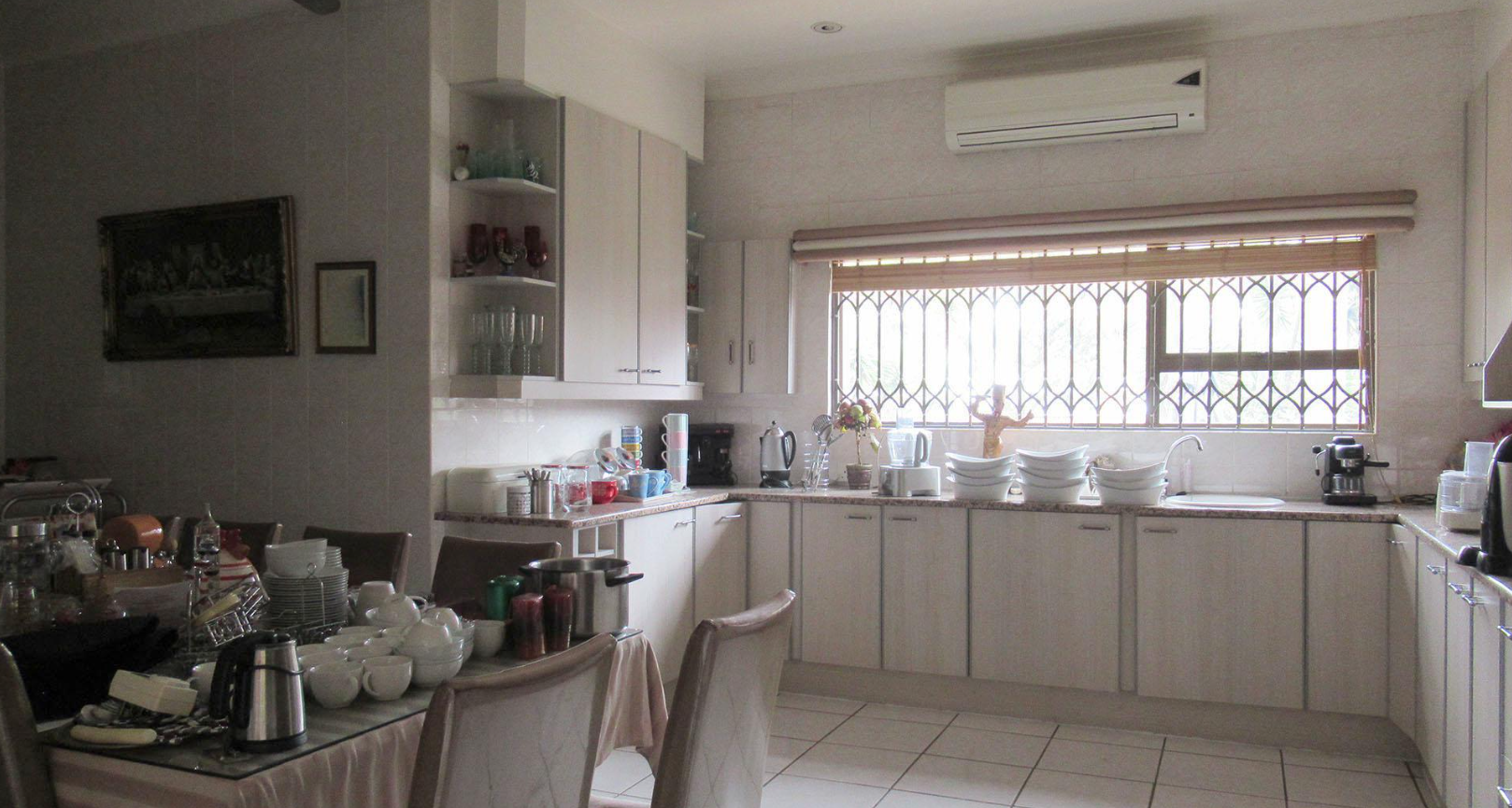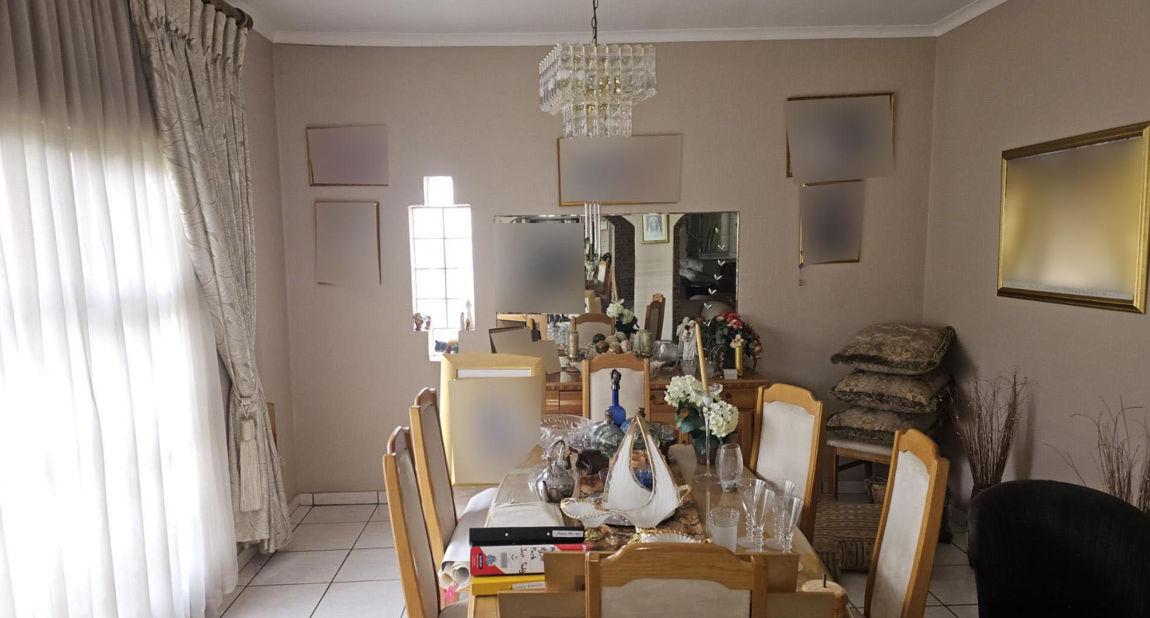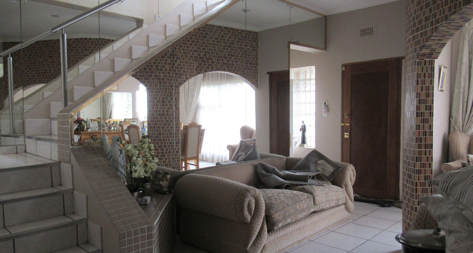 Step inside to discover an expansive interior spanning 515 square metres, designed for comfortable family living. The layout includes two distinct dining rooms and two lounges, alongside a dedicated family TV room, offering versatile spaces for relaxation and entertainment. The heart of the home, the U-shaped kitchen, boasts ample counter space, generous cabinet storage, and abundant natural light from a large window, complete with security bars for peace of mind. The property features an open-plan design, with tiled flooring throughout and a prominent staircase with a modern stainless steel banister, adding a touch of contemporary elegance amidst traditional architectural details like arched doorways and pillars.