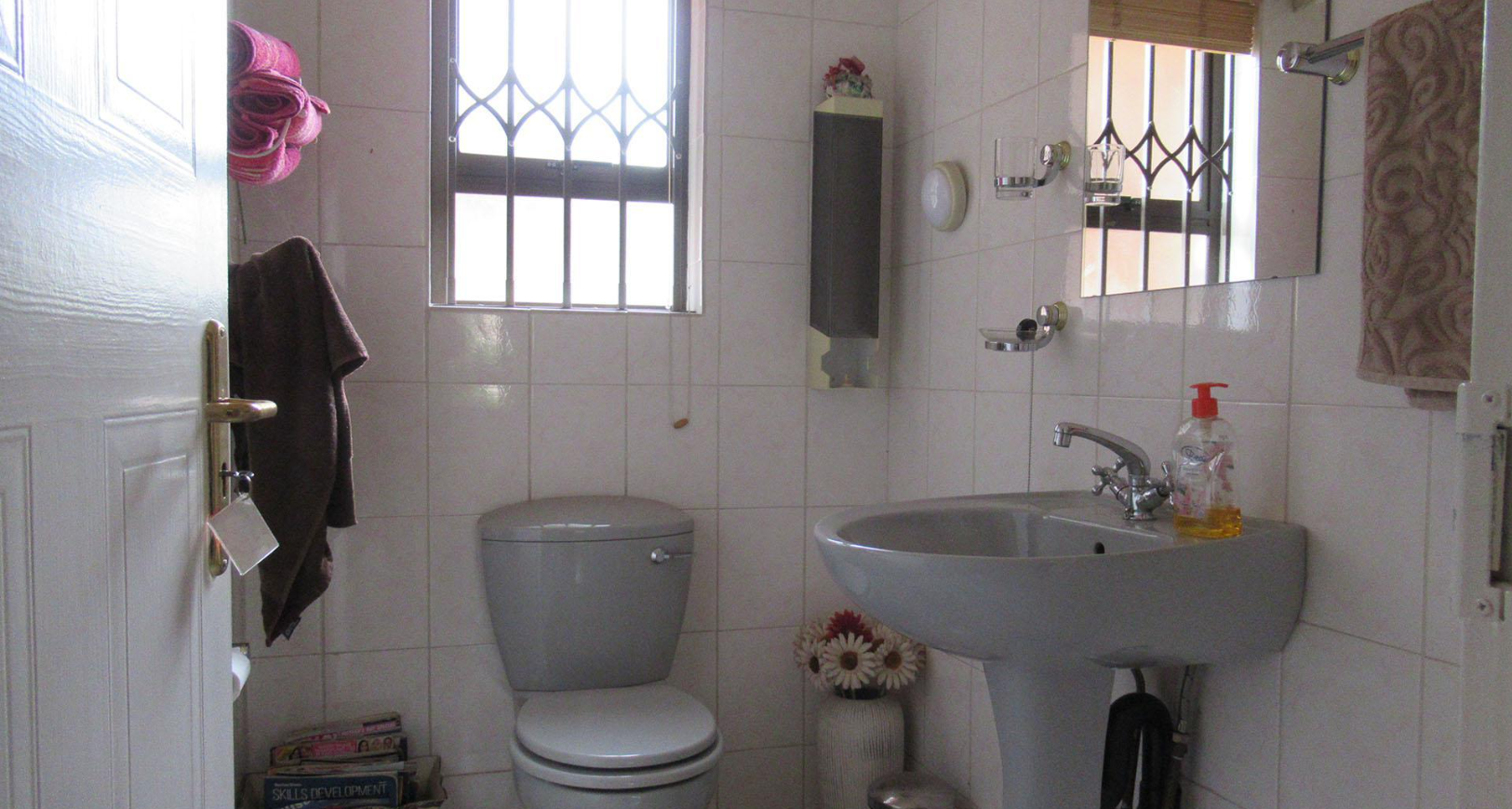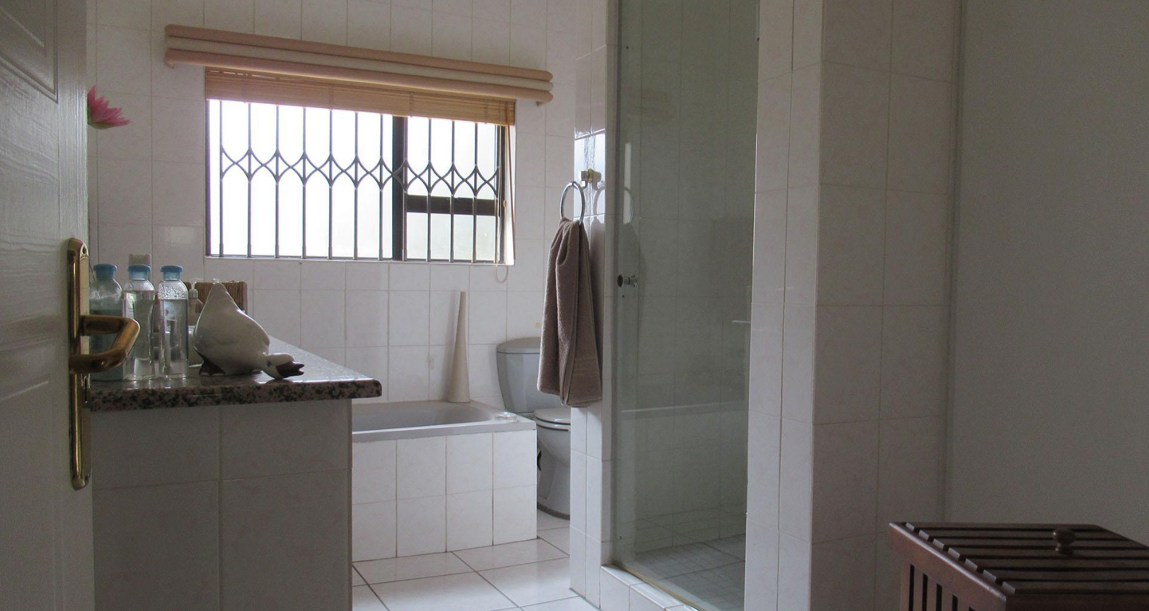 Accommodation comprises four well-proportioned bedrooms and three bathrooms. The bathrooms are functionally designed with tiled walls and floors, offering both a separate shower and a bathtub in one, alongside a vanity with a granite countertop. Natural light filters through windows, which are also fitted with security bars.