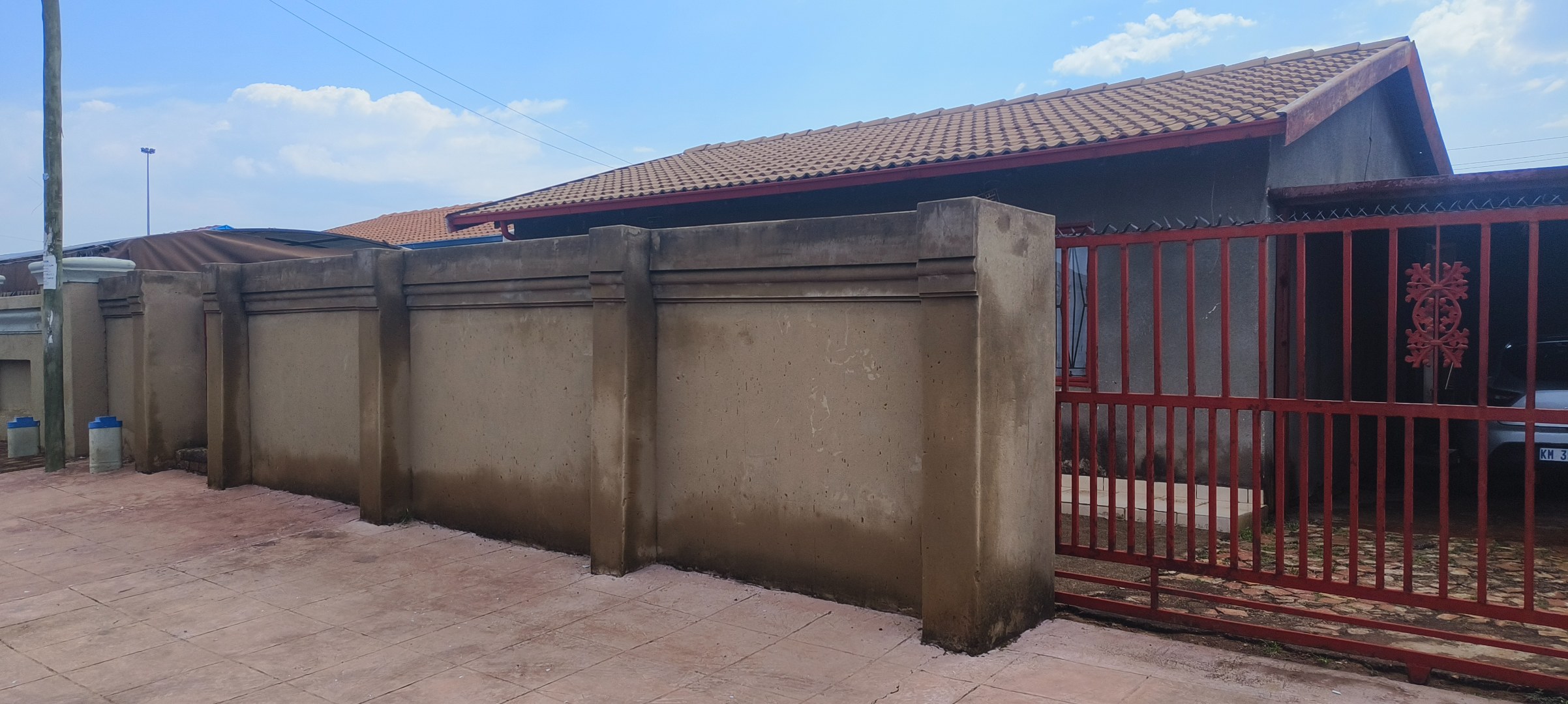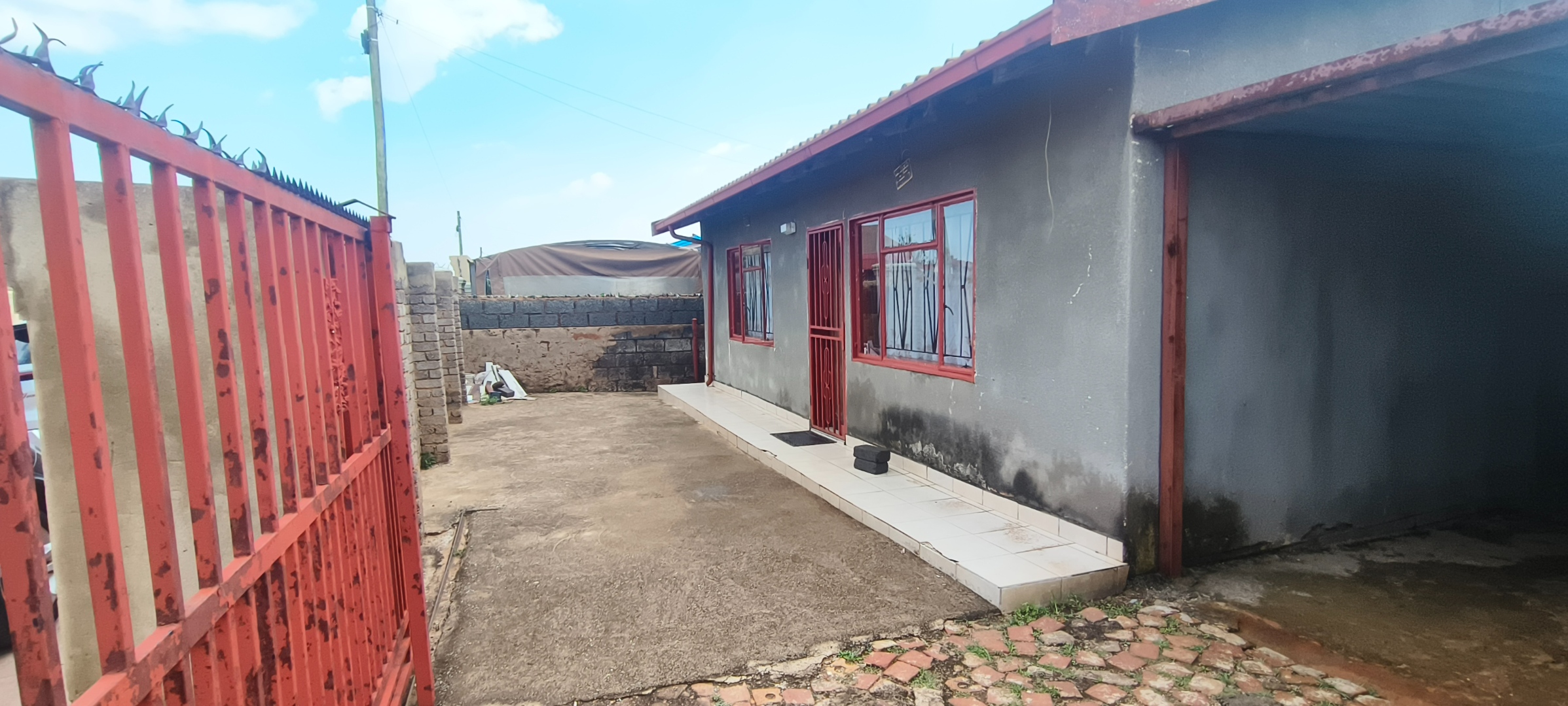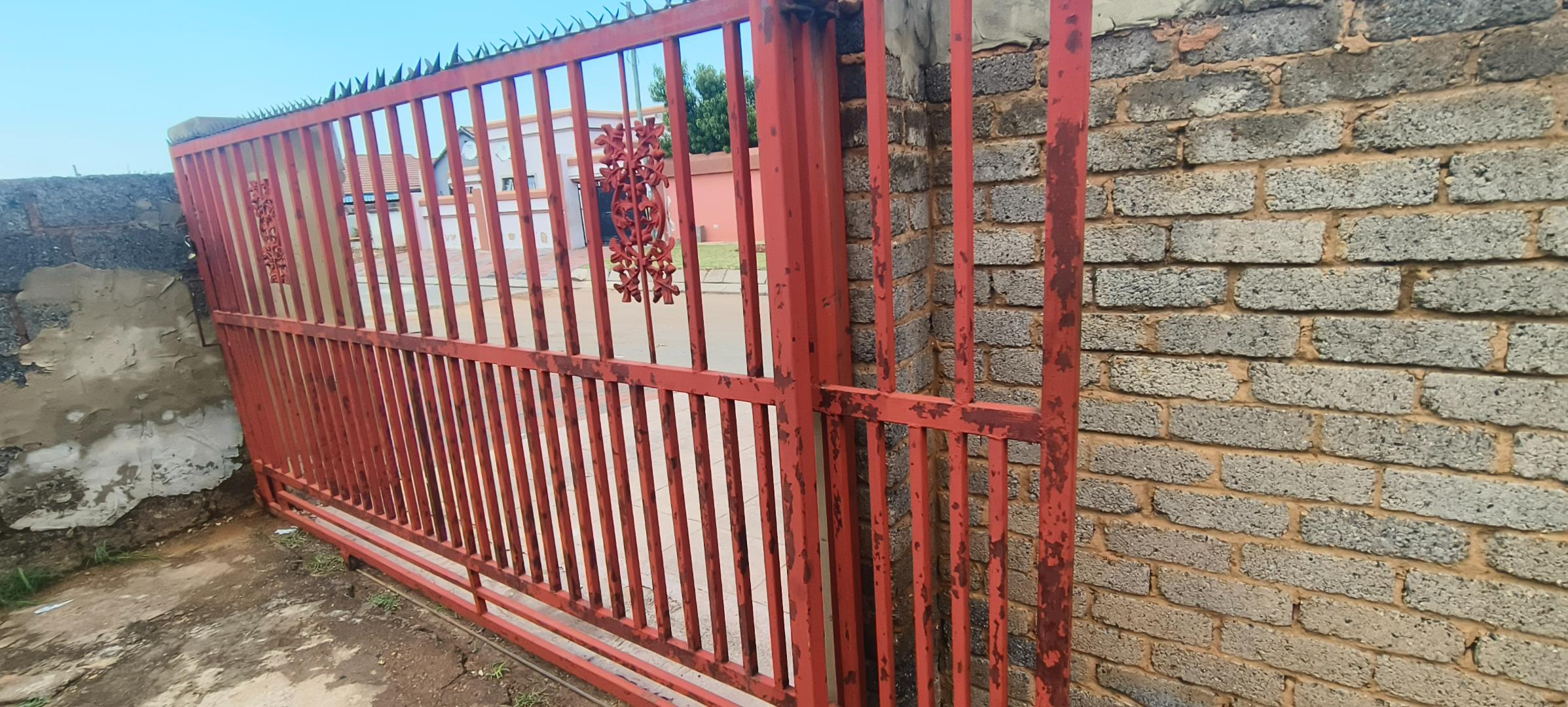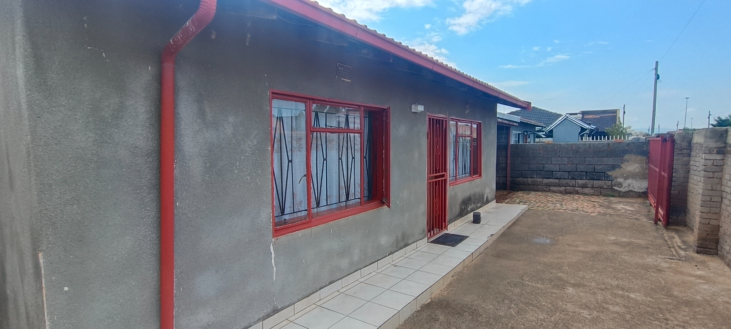 This residential property, situated in Katlehong, presents a functional and secure living environment. The exterior features a single-story dwelling with a grey textured finish, complemented by distinctive red-framed windows and a matching red roof. Perimeter security is robust, encompassing brick boundary walls, a red metal gate with security spikes, and security bars on all windows, ensuring a protected residence. The property's frontage and side passages are predominantly paved, offering low-maintenance outdoor spaces.