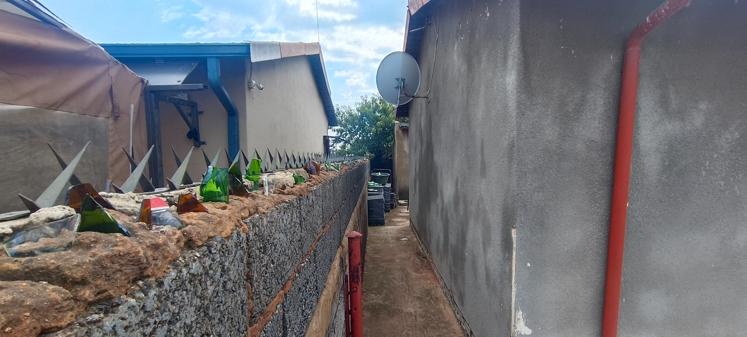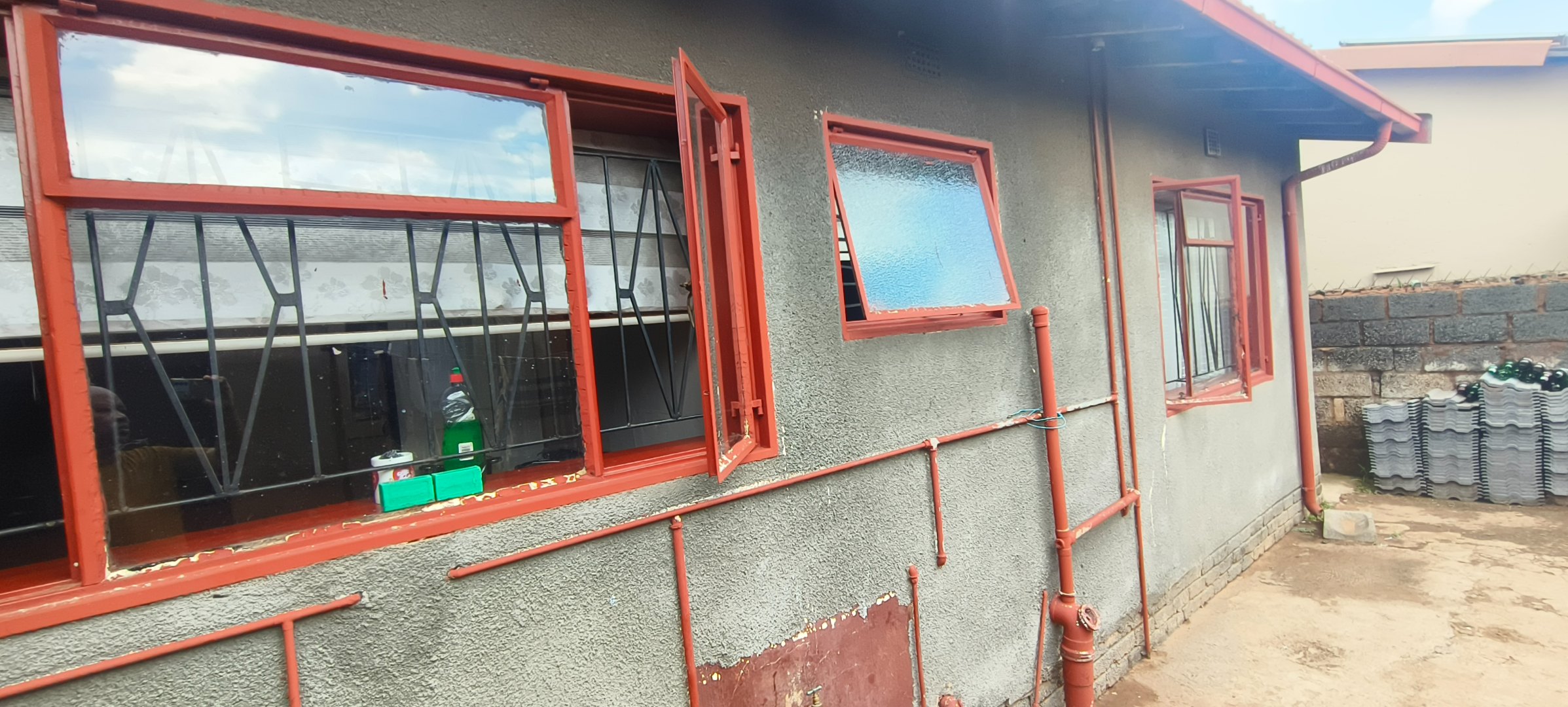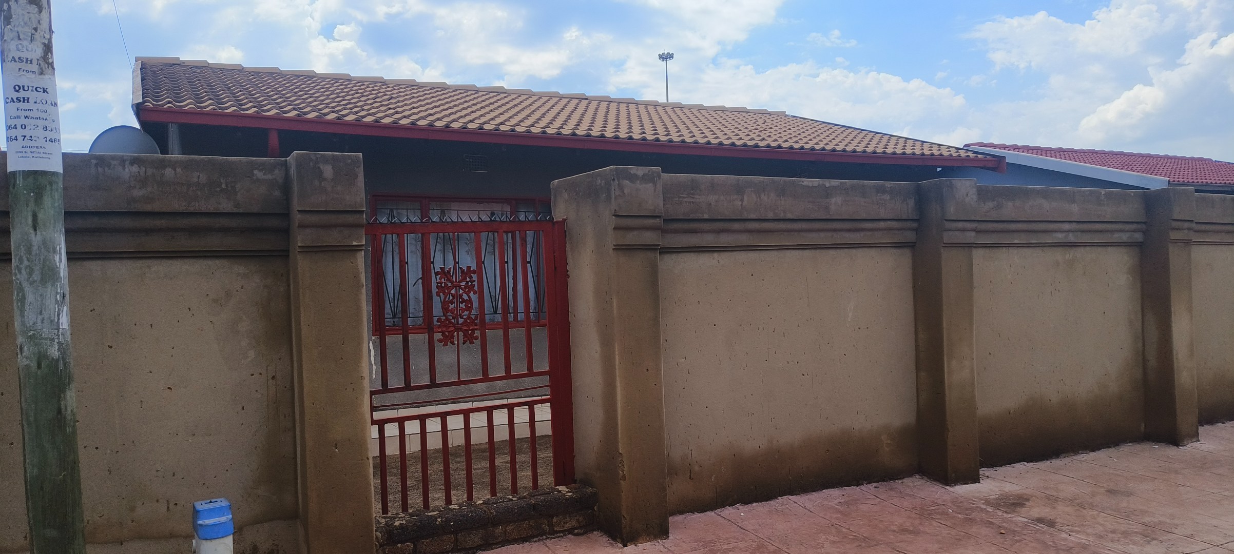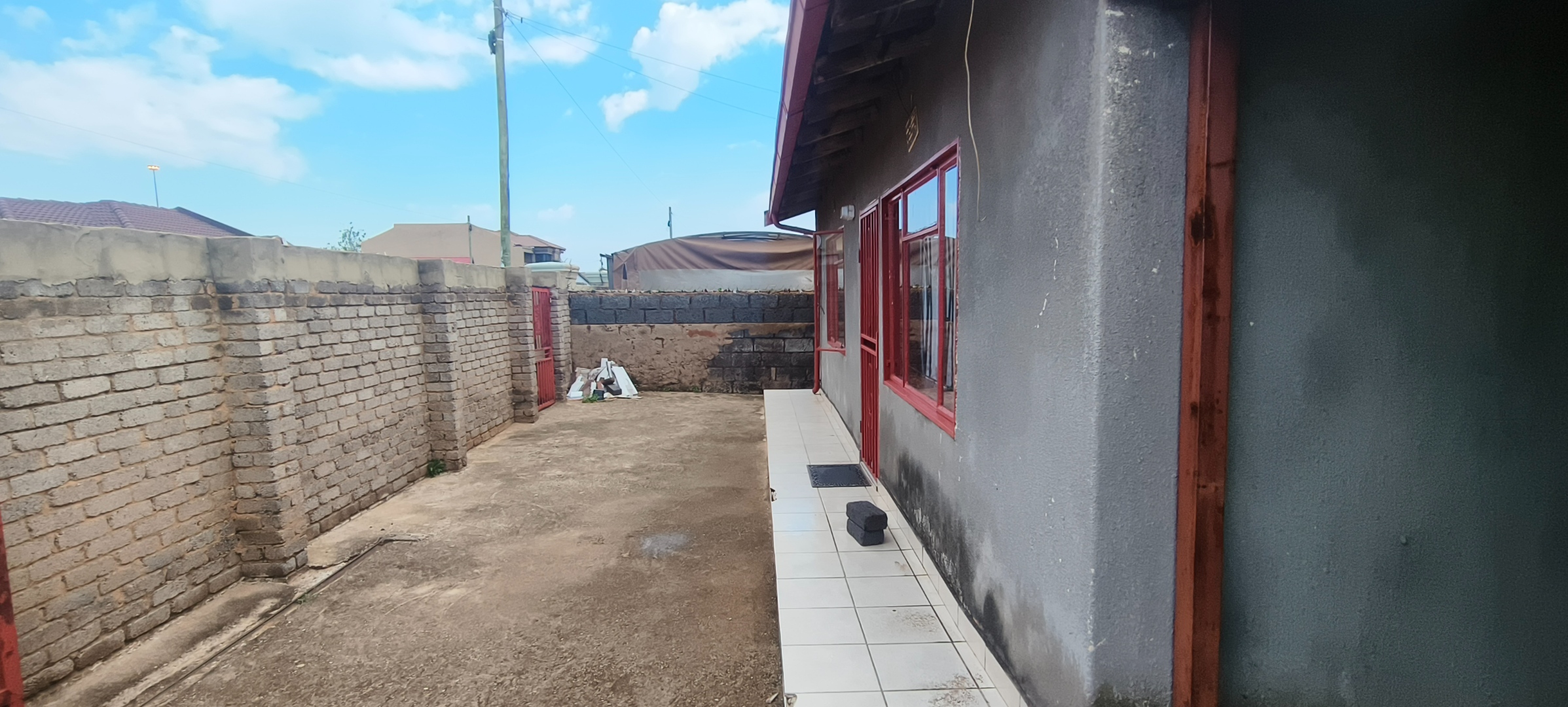This residential property, situated in Katlehong, presents a functional and secure living environment. The exterior features a single-story dwelling with a grey textured finish, complemented by distinctive red-framed windows and a matching red roof. Perimeter security is robust, encompassing brick boundary walls, a red metal gate with security spikes, and security bars on all windows, ensuring a protected residence. The property's frontage and side passages are predominantly paved, offering low-maintenance outdoor spaces.