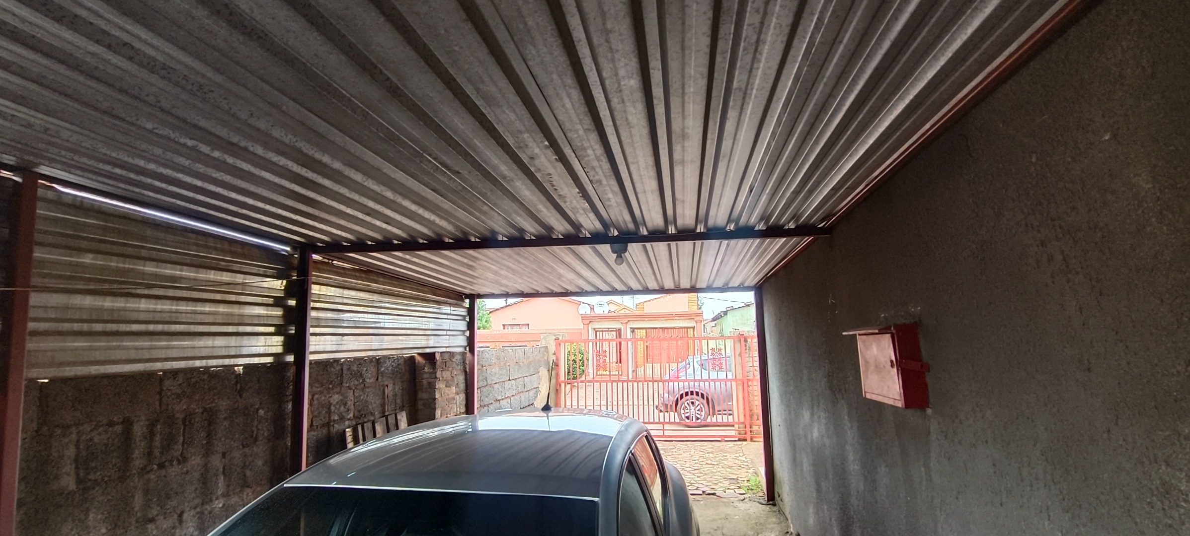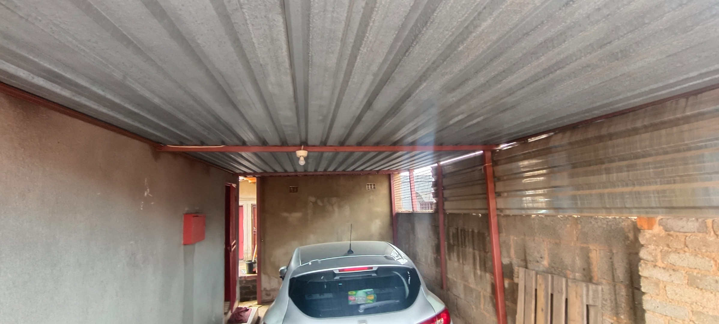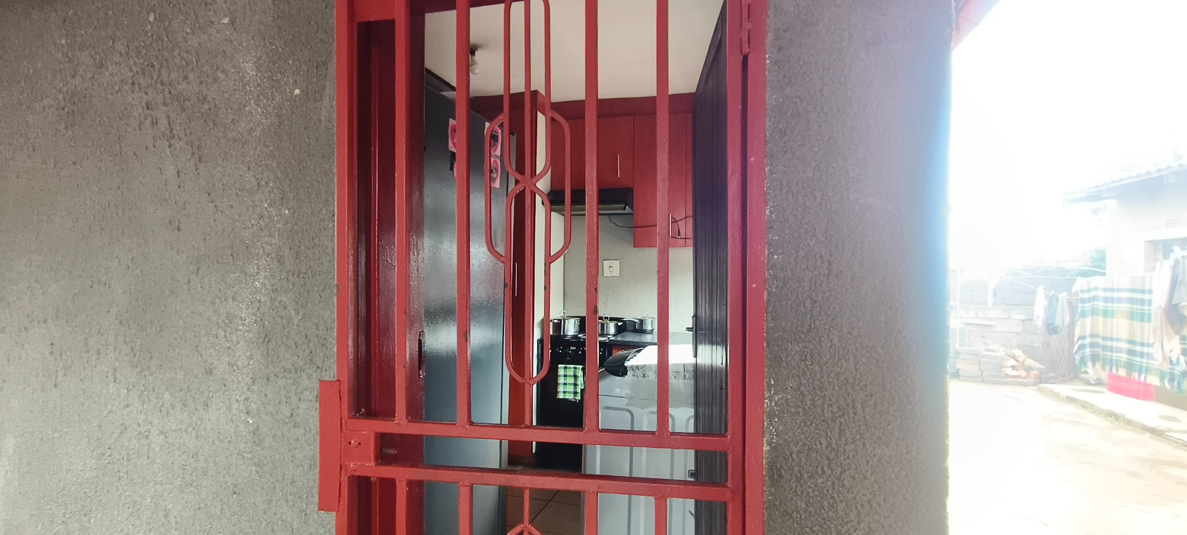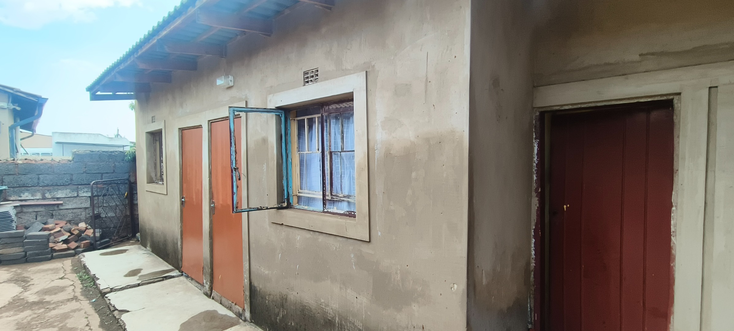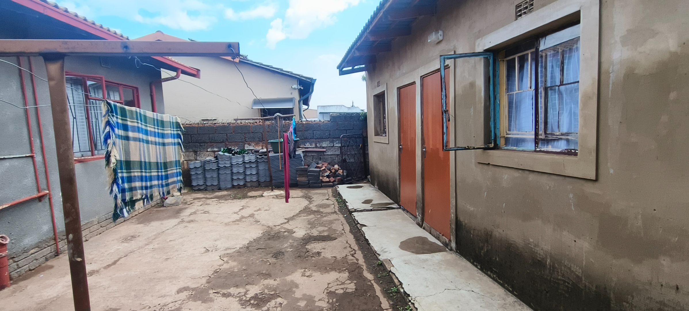This residential property, situated in Katlehong, presents a functional and secure living environment. The exterior features a single-story dwelling with a grey textured finish, complemented by distinctive red-framed windows and a matching red roof. Perimeter security is robust, encompassing brick boundary walls, a red metal gate with security spikes, and security bars on all windows, ensuring a protected residence. The property's frontage and side passages are predominantly paved, offering low-maintenance outdoor spaces.
