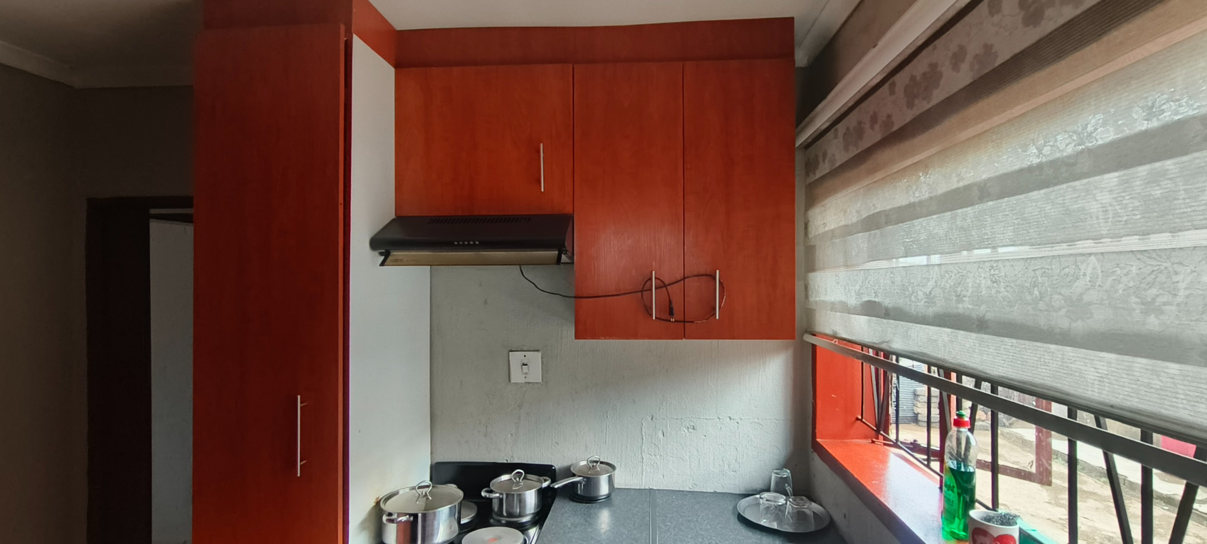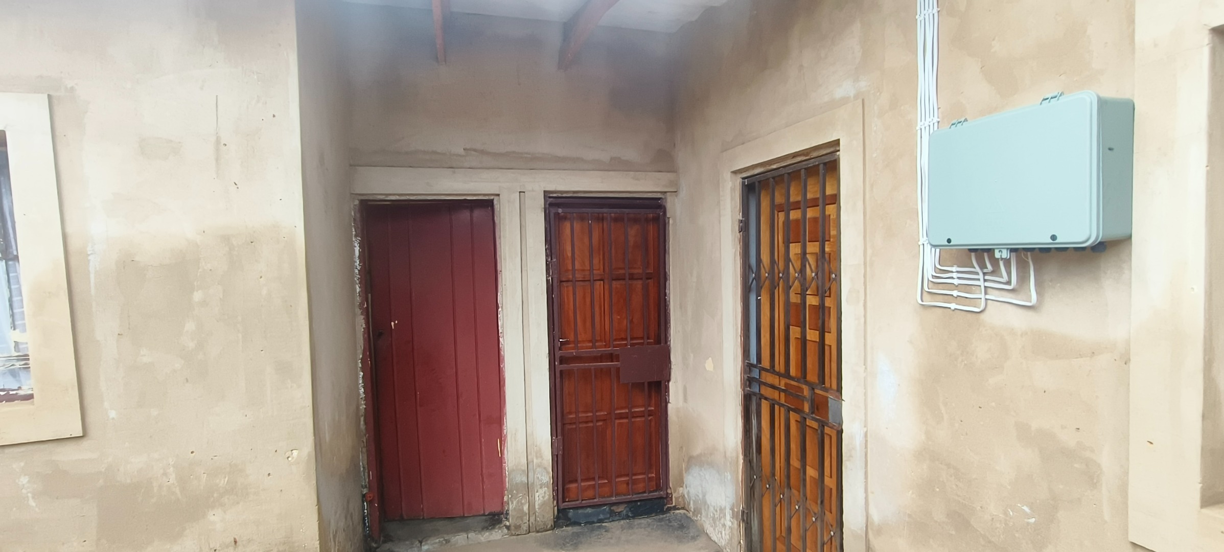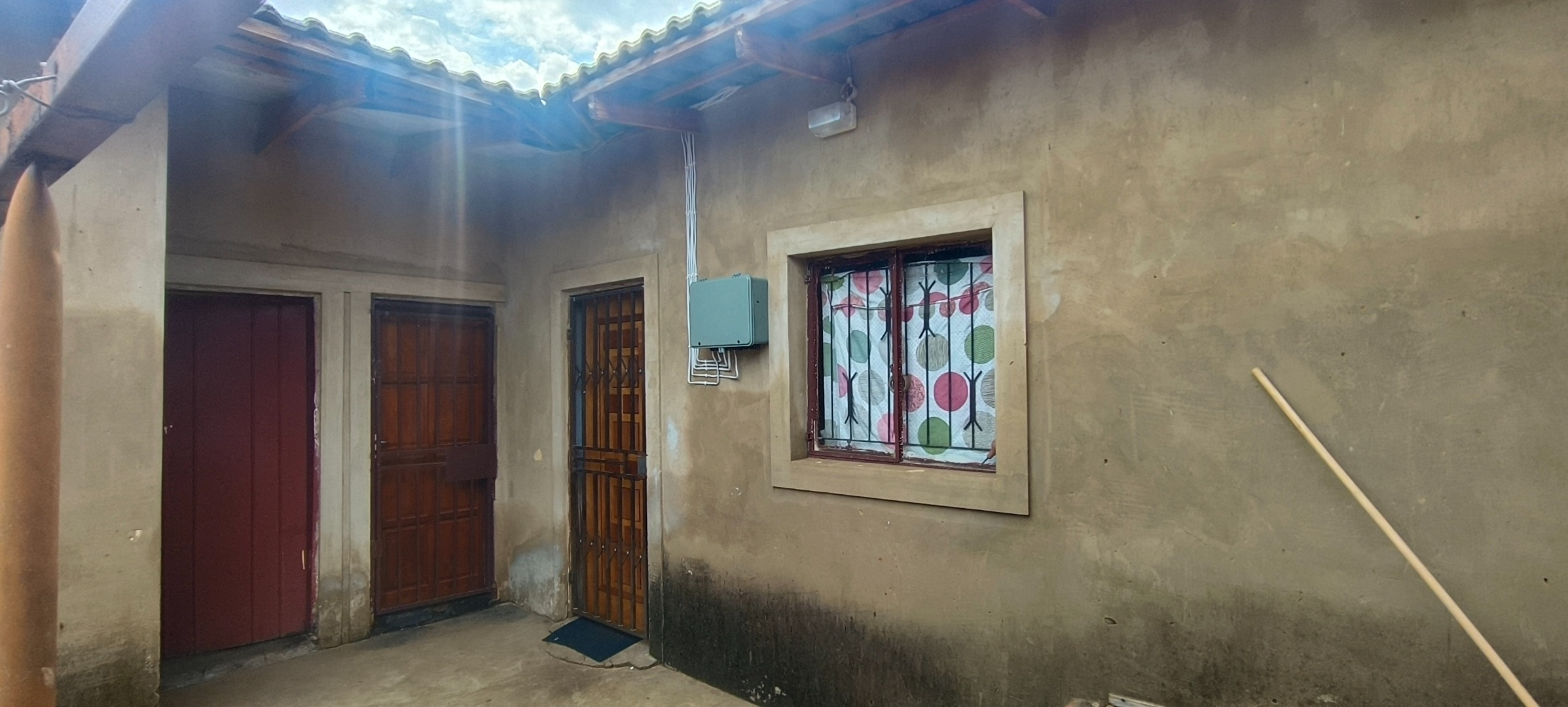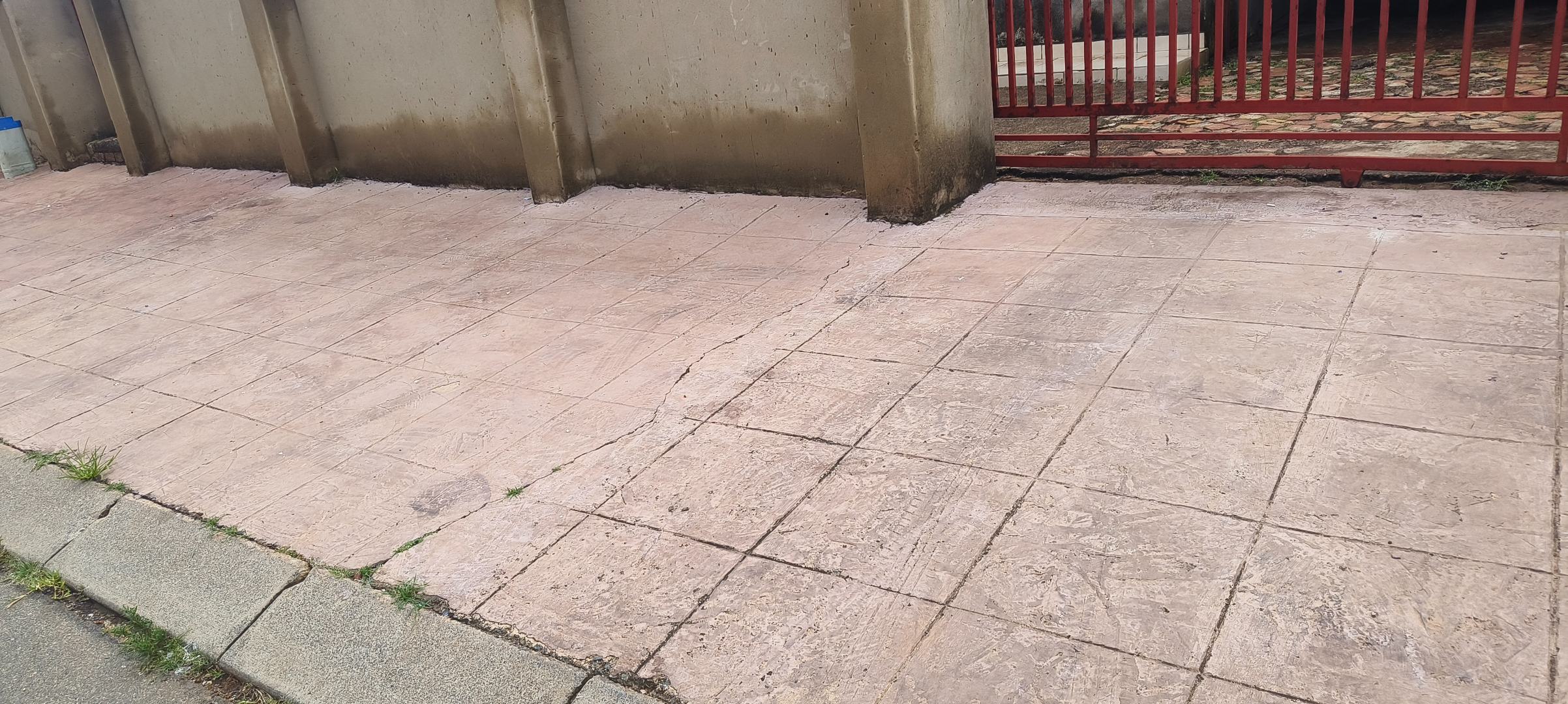 This residential property, situated in Katlehong, presents a functional and secure living environment. The exterior features a single-story dwelling with a grey textured finish, complemented by distinctive red-framed windows and a matching red roof. Perimeter security is robust, encompassing brick boundary walls, a red metal gate with security spikes, and security bars on all windows, ensuring a protected residence. The property's frontage and side passages are predominantly paved, offering low-maintenance outdoor spaces.