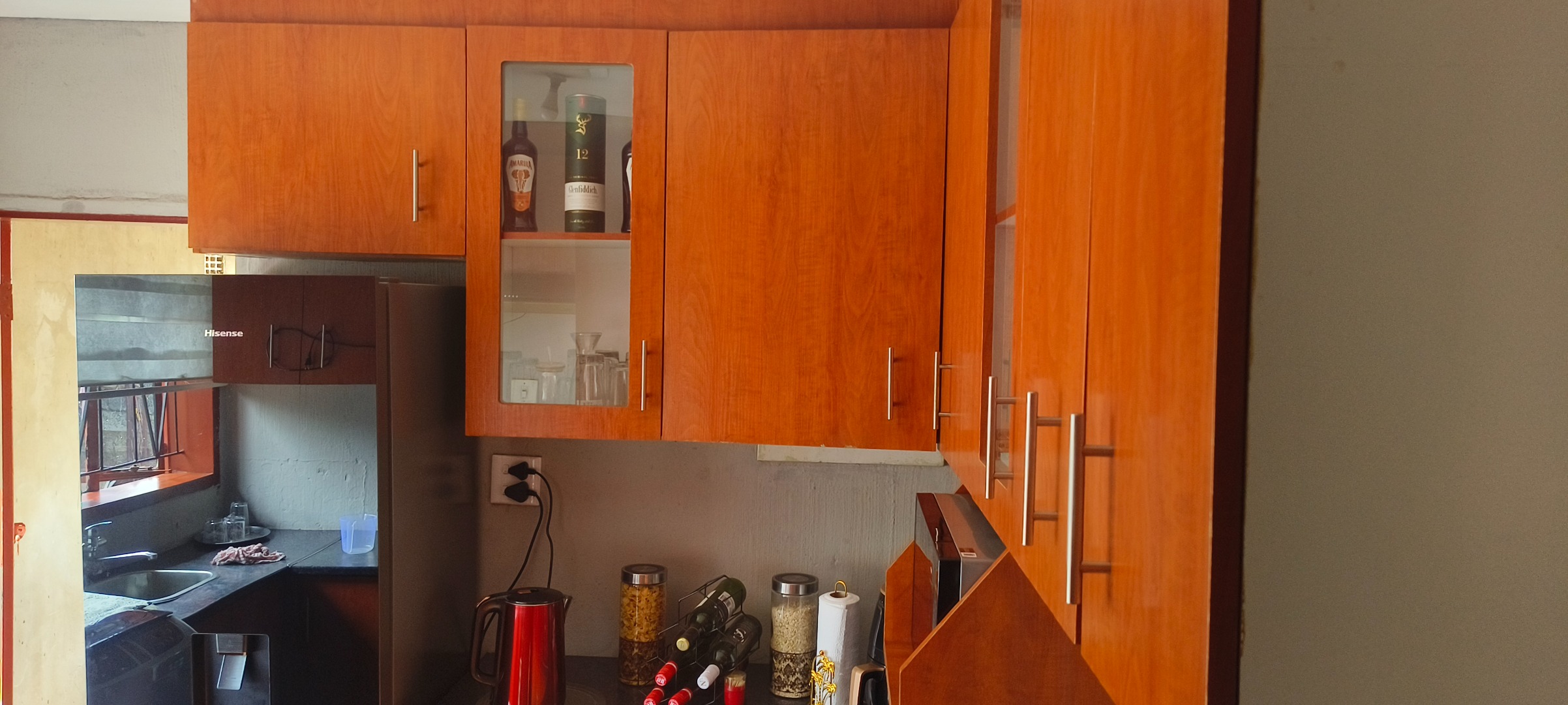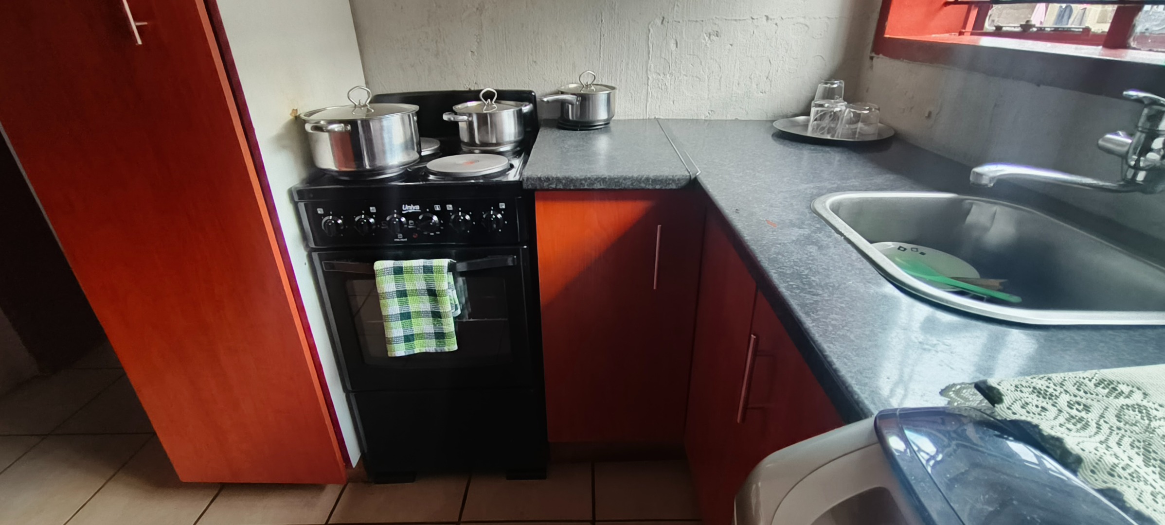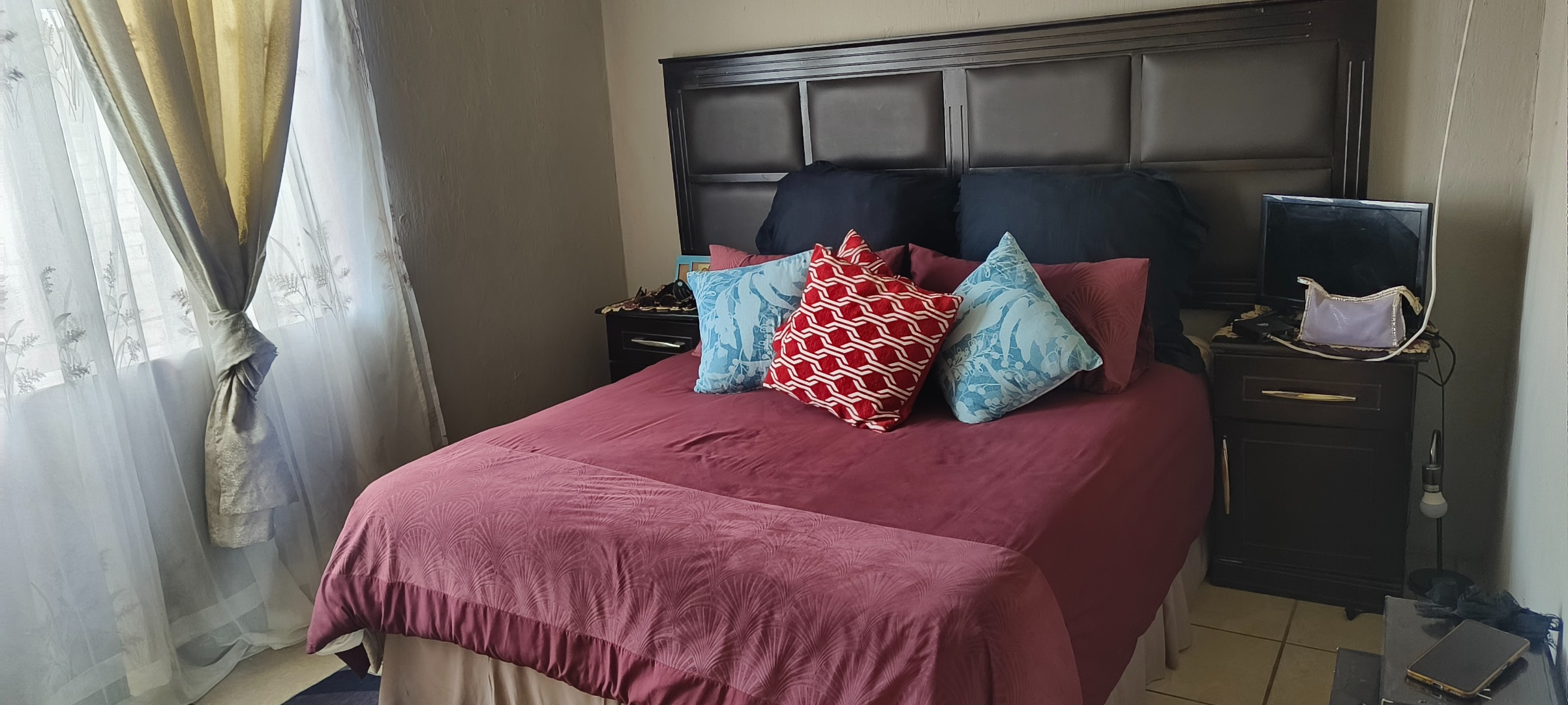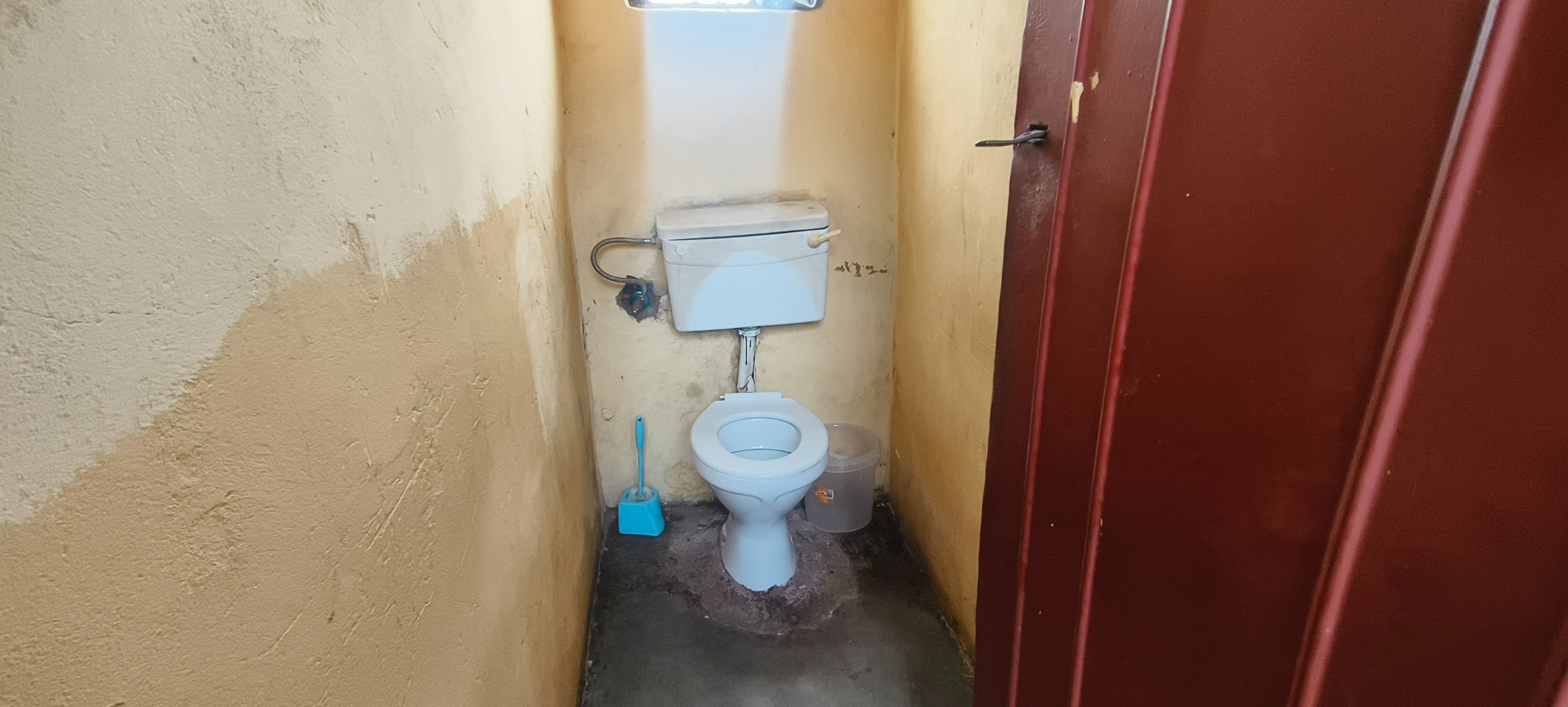 This residential property, situated in Katlehong, presents a functional and secure living environment. The exterior features a single-story dwelling with a grey textured finish, complemented by distinctive red-framed windows and a matching red roof. Perimeter security is robust, encompassing brick boundary walls, a red metal gate with security spikes, and security bars on all windows, ensuring a protected residence. The property's frontage and side passages are predominantly paved, offering low-maintenance outdoor spaces.