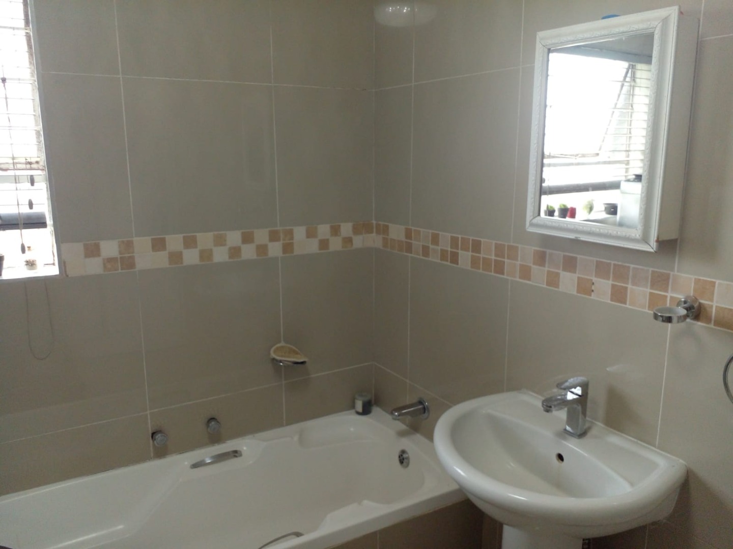 The apartment boasts a comfortable lounge and a dedicated dining room, both with durable tiled flooring and natural light. A functional kitchen awaits. The two bedrooms offer comfort, each equipped with stylish built-in wardrobes for generous storage, complemented by ceiling fans and elegant tufted headboards. A well-appointed bathroom and an additional guest toilet provide convenience.