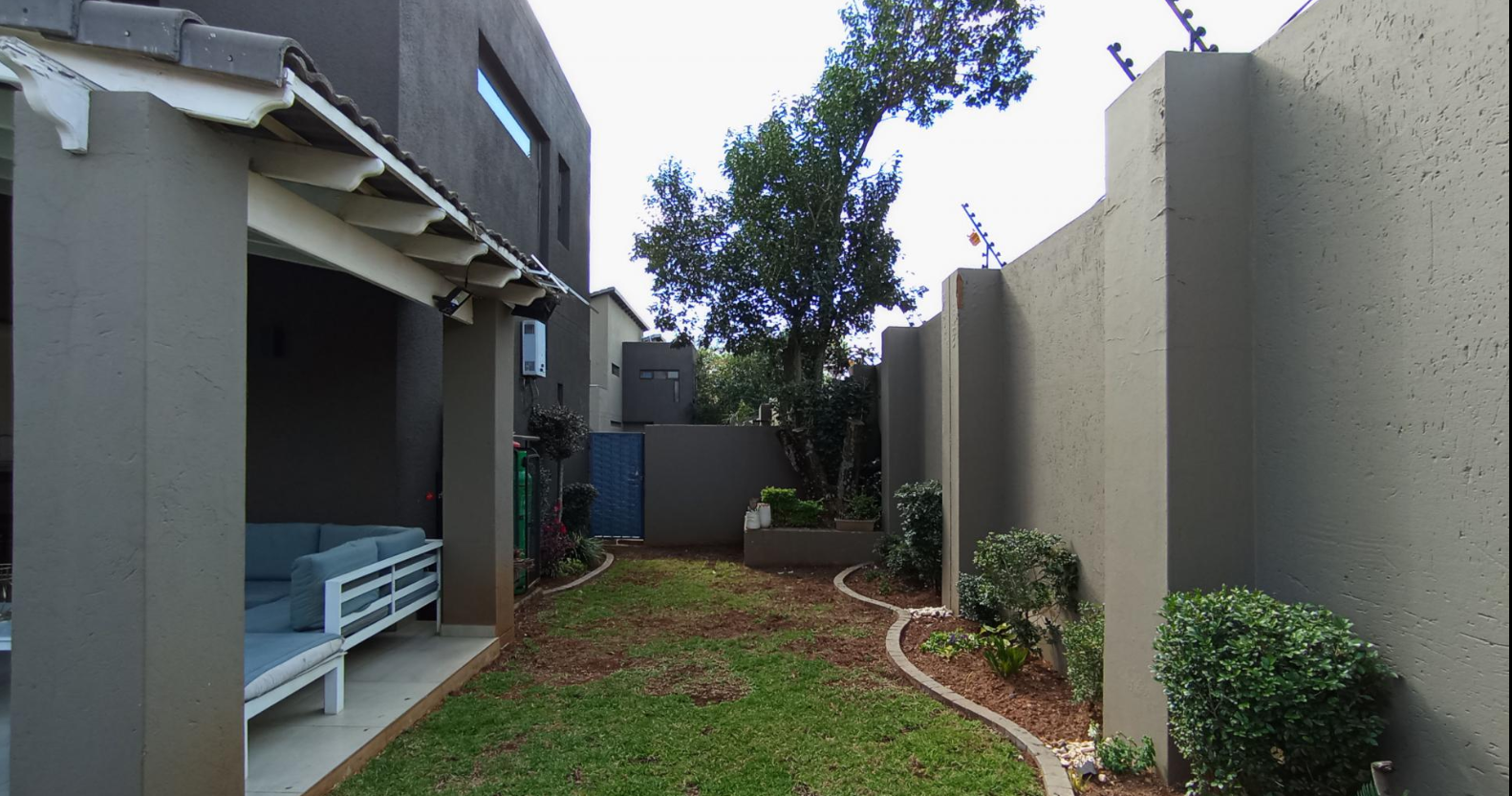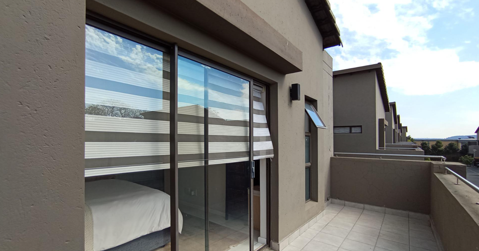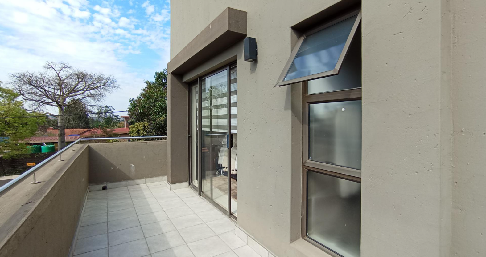 Outdoor living is enhanced by a covered patio on the ground floor and a balcony upstairs connected to the main bedroom, offering relaxing spaces on both levels.