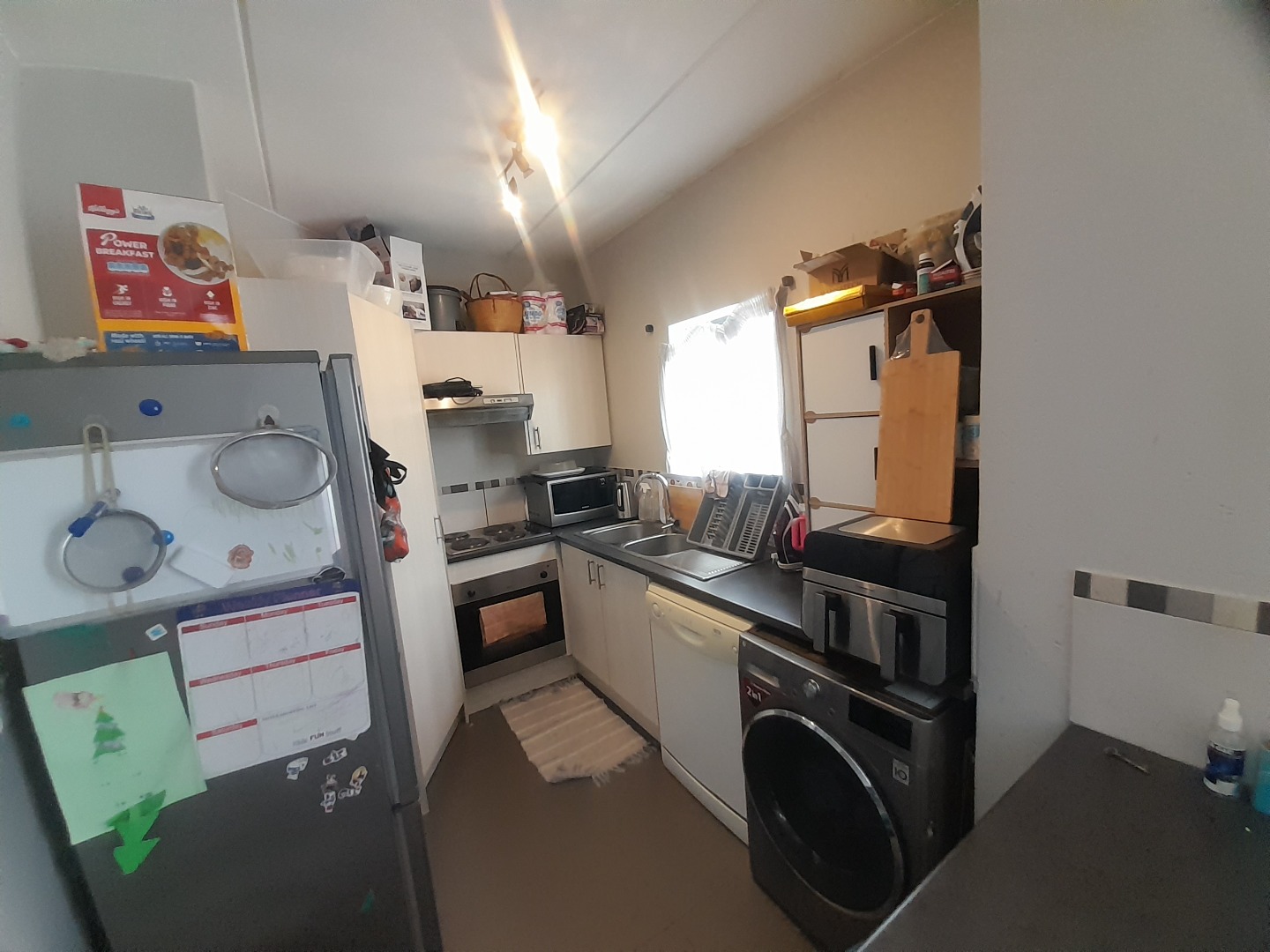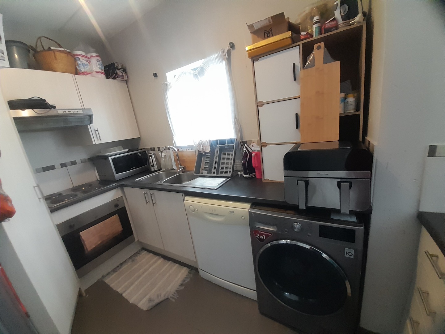 Inside, the apartment boasts an open-plan living area, providing a versatile space for relaxation and entertaining. Natural light floods the interiors through ample windows, enhancing the neutral wall colours and practical tiled flooring. The compact kitchen is equipped with modern integrated appliances, including a built-in oven, alongside generous cabinet storage. While efficient, the kitchen offers a practical space for daily culinary needs.