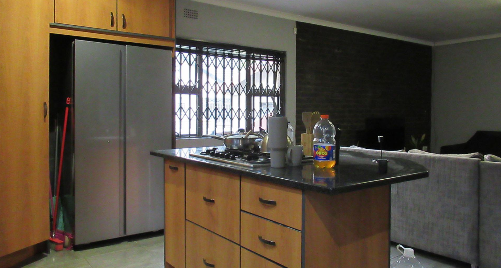 Step inside to discover an inviting open-plan layout, seamlessly connecting the kitchen and living areas. The well-appointed kitchen boasts extensive wooden cabinetry, dark granite countertops, and a practical tiled backsplash. A central island features an integrated gas hob, perfect for culinary enthusiasts, complemented by a large integrated refrigerator. The spacious living areas, adorned with neutral walls and crown molding, include a dedicated entertainment space with a built-in bar, ideal for hosting.