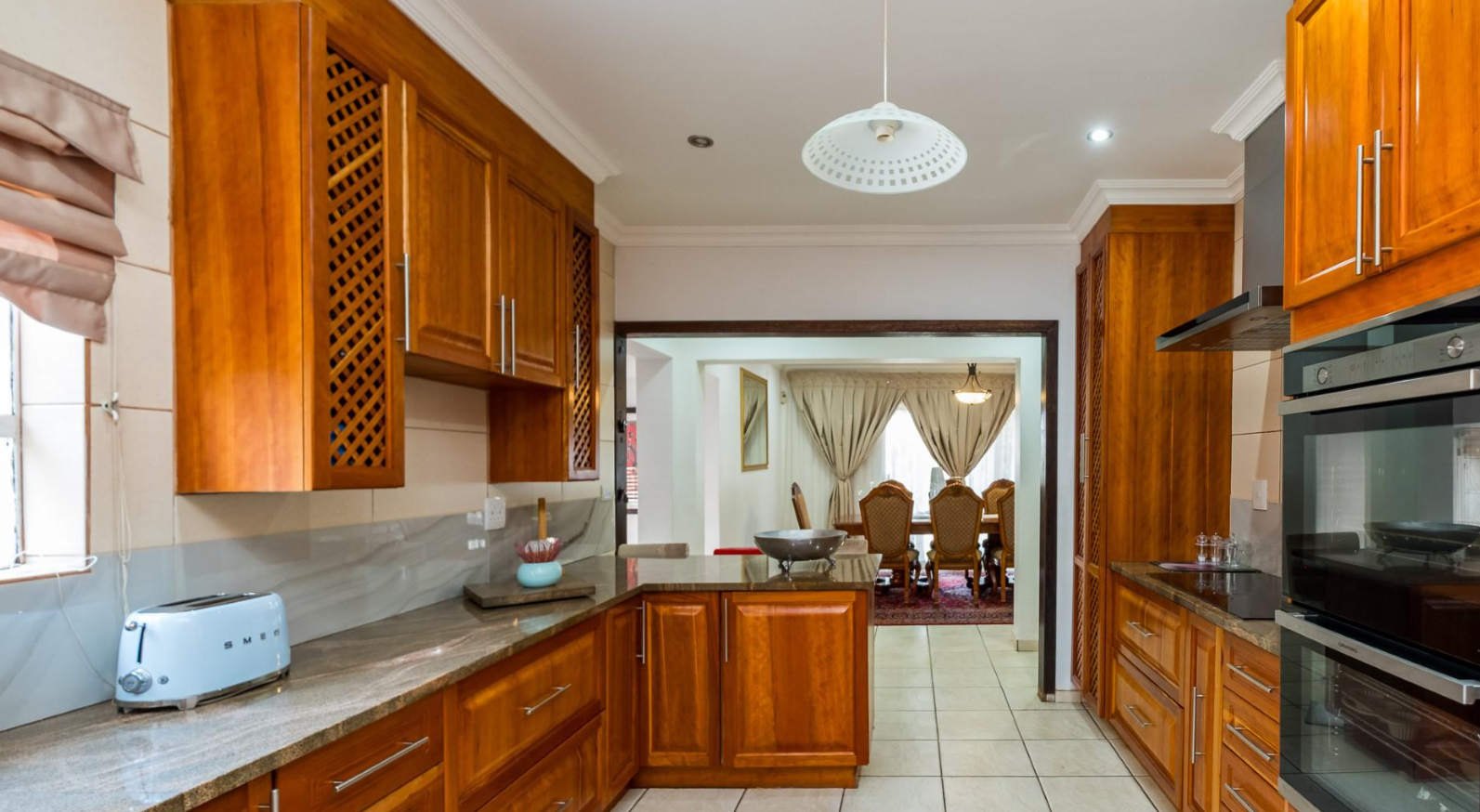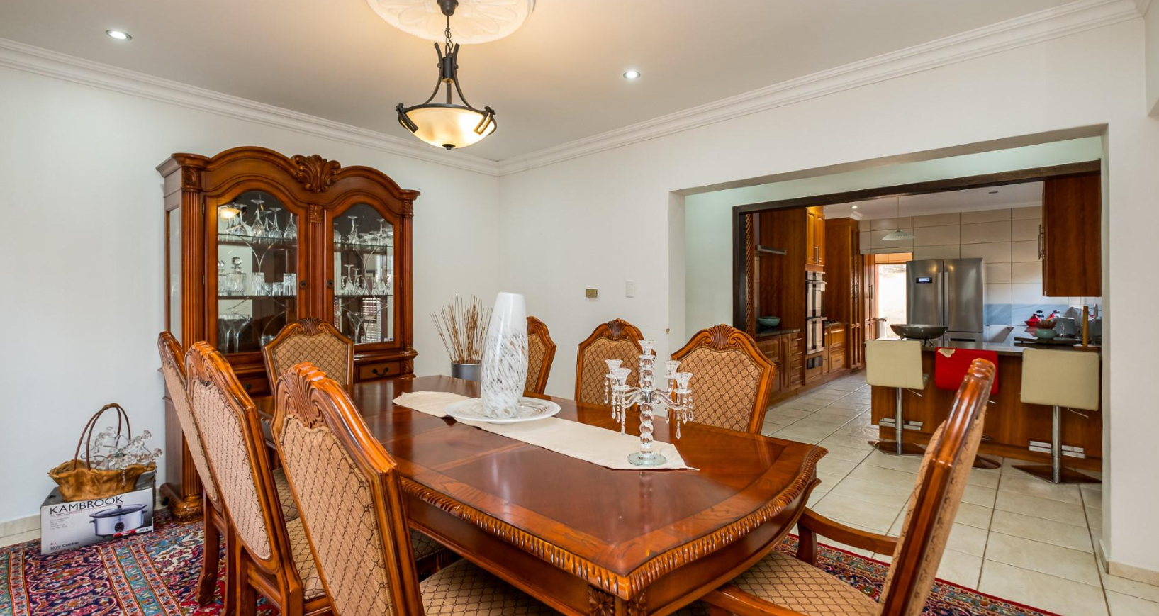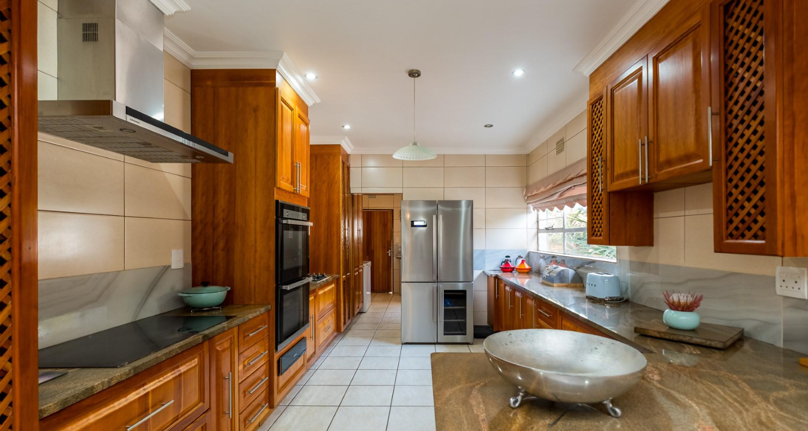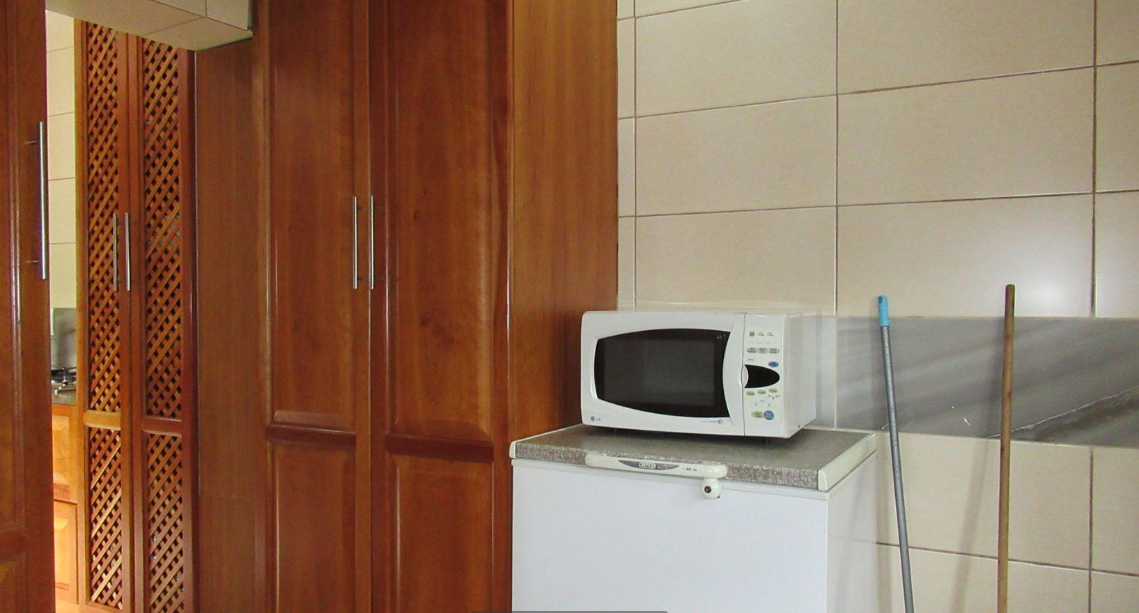 Accommodation comprises five generously sized bedrooms, providing ample space for a large family or guests. The property includes two well-maintained bathrooms, designed to serve the household efficiently. Ample storage solutions are integrated throughout the home, including built-in cabinetry and a functional walk-in closet, ensuring an organised living environment. For added convenience, the property also features staff quarters.