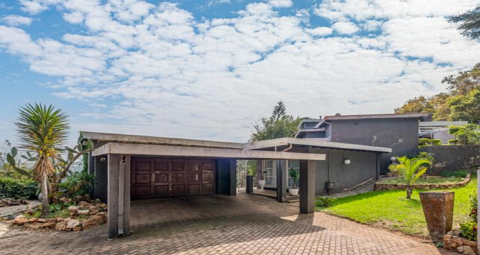 Discover this spacious five-bedroom residence nestled in the desirable suburban area of Kloofendal, Roodepoort. This property presents a modern architectural style with a dark exterior, offering a striking first impression. The exterior features an integrated carport and an enclosed double garage, complemented by a paved driveway that ensures convenient access. Set in an elevated position, the home is surrounded by established natural landscaping, including mature trees and arid plants, providing a serene and private atmosphere with scenic views.