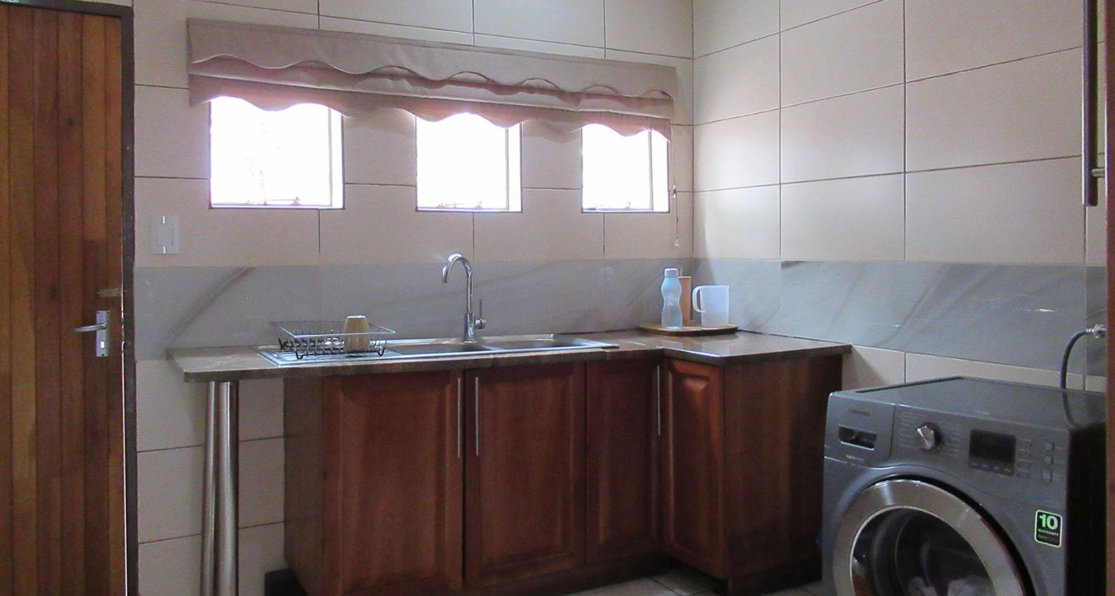 The heart of this home is its well-appointed kitchen, equipped with extensive natural wood cabinetry and durable granite countertops. Modern stainless steel appliances, including a double-door refrigerator, double ovens, and an induction cooktop, cater to all culinary needs. The kitchen also benefits from a convenient pantry and a functional breakfast bar. Adjacent to the main kitchen, a dedicated utility/laundry area offers additional functionality with modern wooden cabinetry, a stainless steel sink, and a front-load washing machine, ensuring household chores are handled with ease.