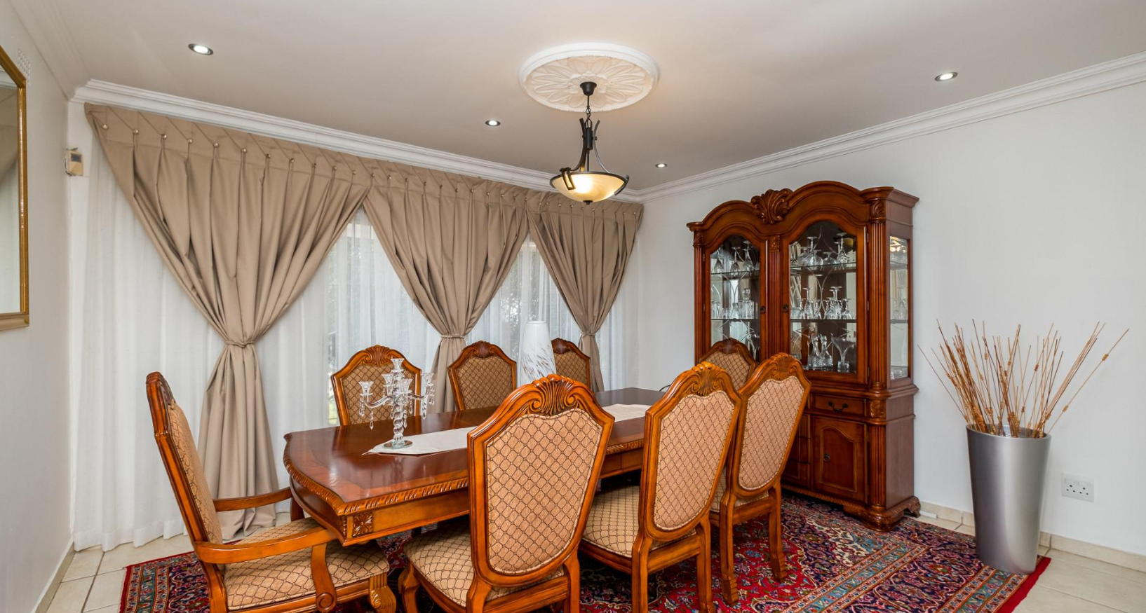Step inside to find versatile living spaces designed for comfort and functionality. The home boasts a welcoming lounge area, characterized by light green walls, crown molding, and large windows that invite abundant natural light. A dedicated family TV room provides an additional space for relaxation and entertainment. The formal dining room, featuring traditional dark wood furniture and elegant window treatments, seamlessly connects to the kitchen, making it ideal for entertaining. Exposed wooden ceiling beams and a prominent staircase add character to certain living areas, enhancing the home's unique appeal.